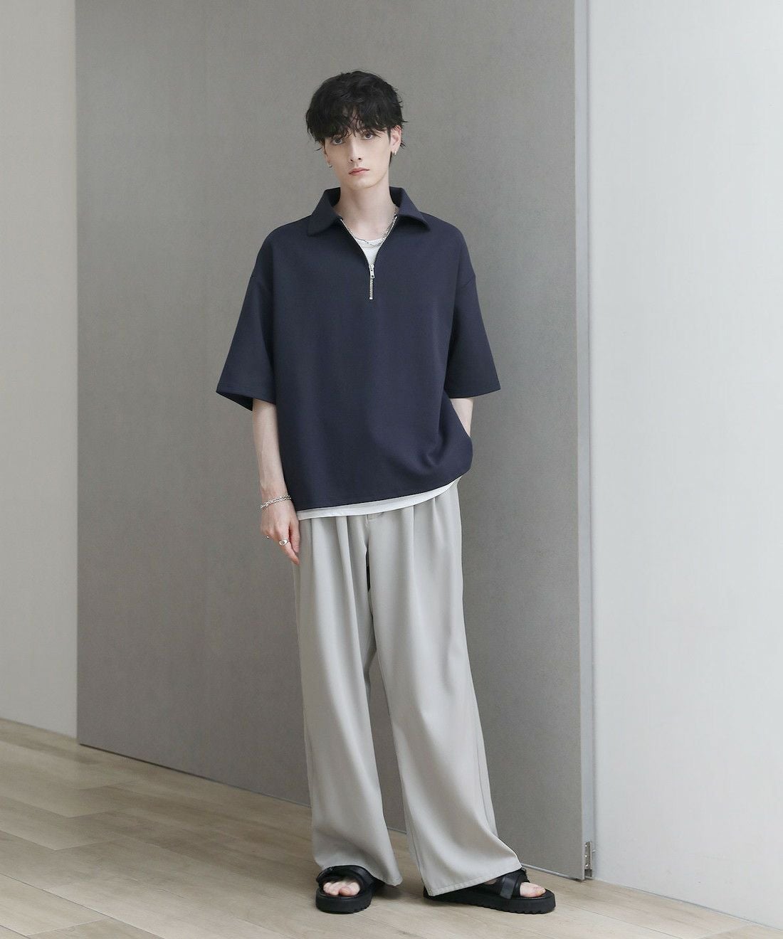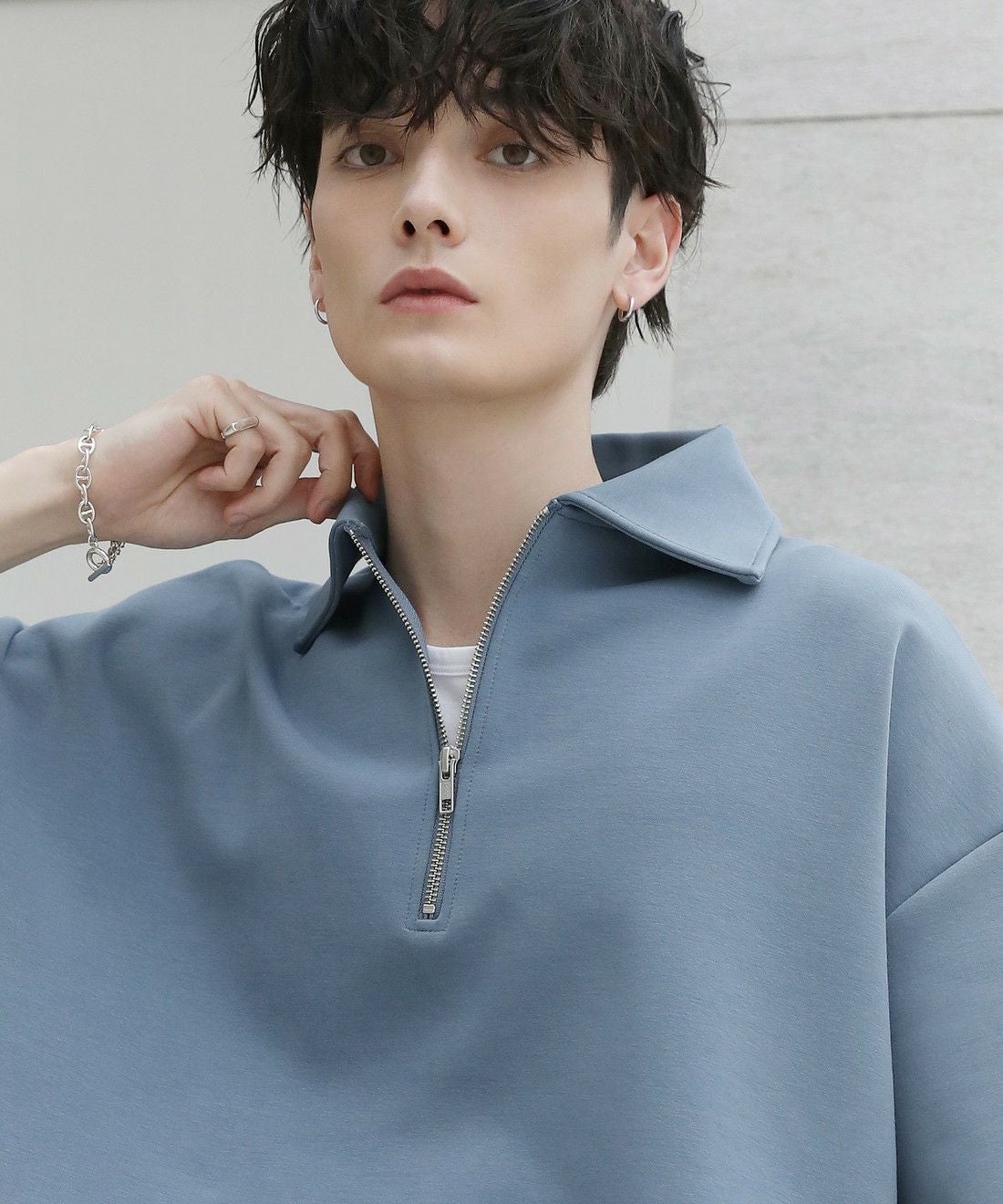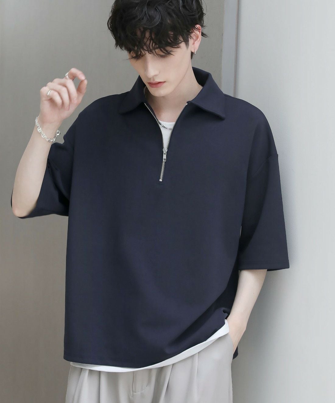 程よい光沢のある素材感でスラックスやワイドパンツの他、デニムパンツやカーゴパンツと合わせても上品にまとまります。ジップを閉めて1枚で、開けでインナーとのレイヤードを楽しむなど着こなしの幅が広がるアイテム。タックインスタイルもおすすめです。