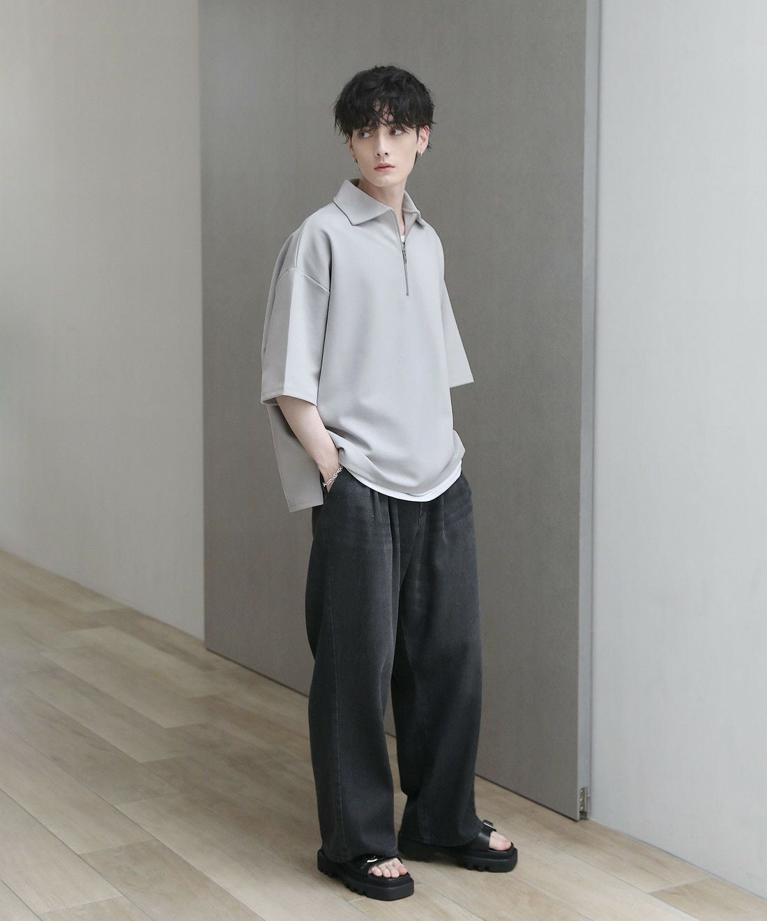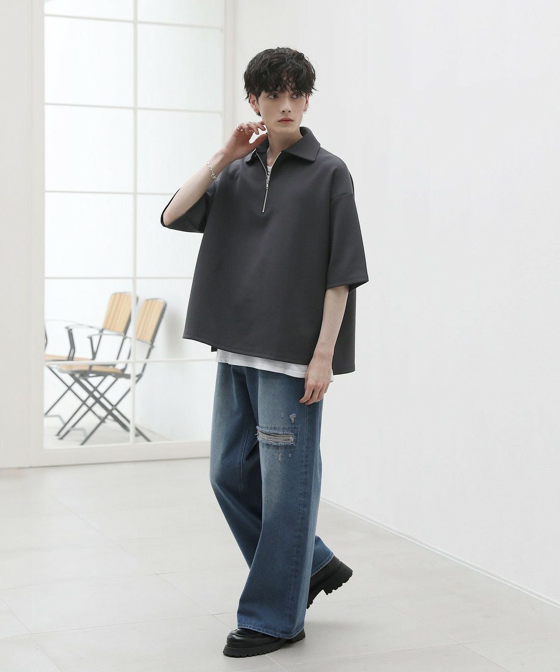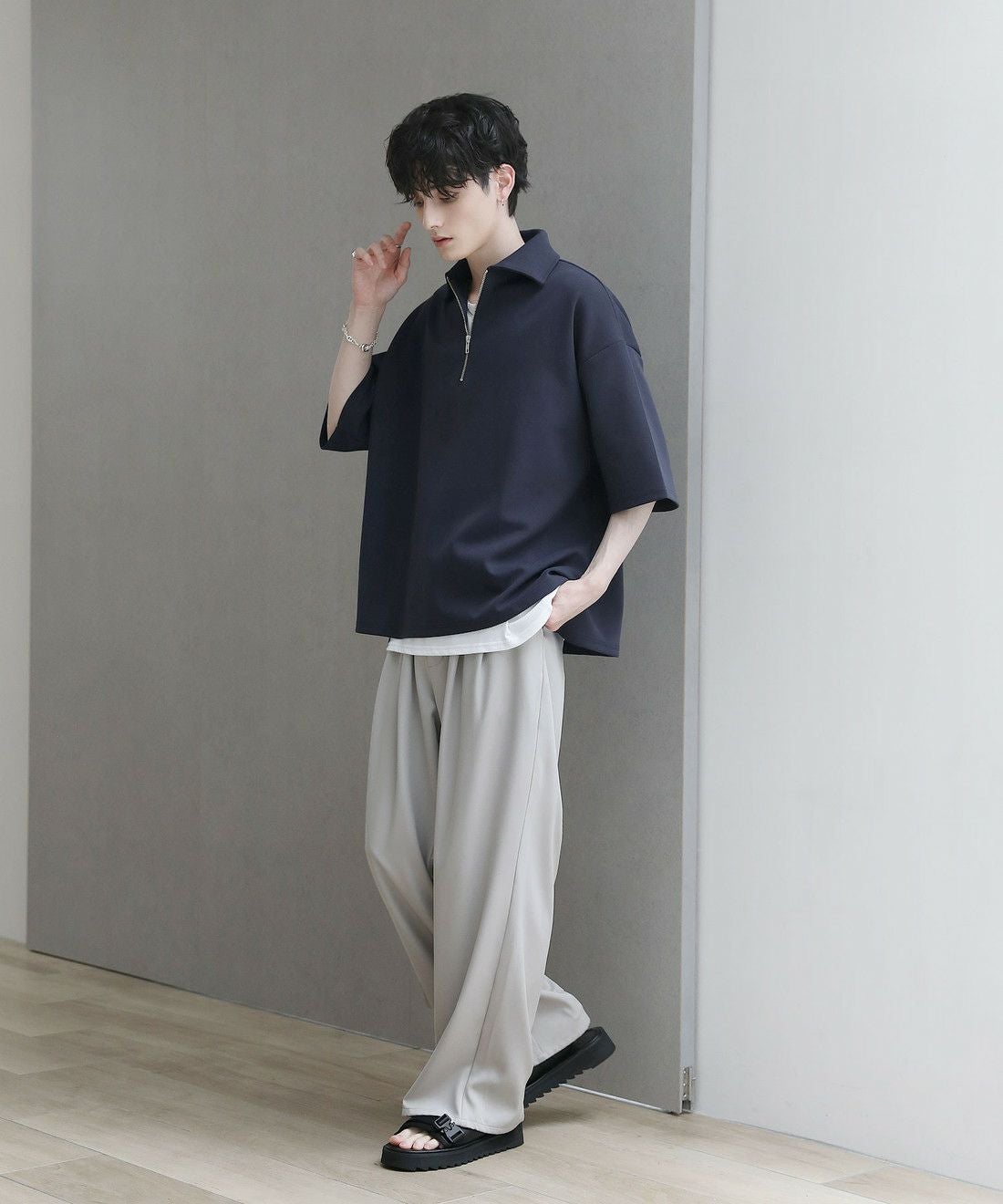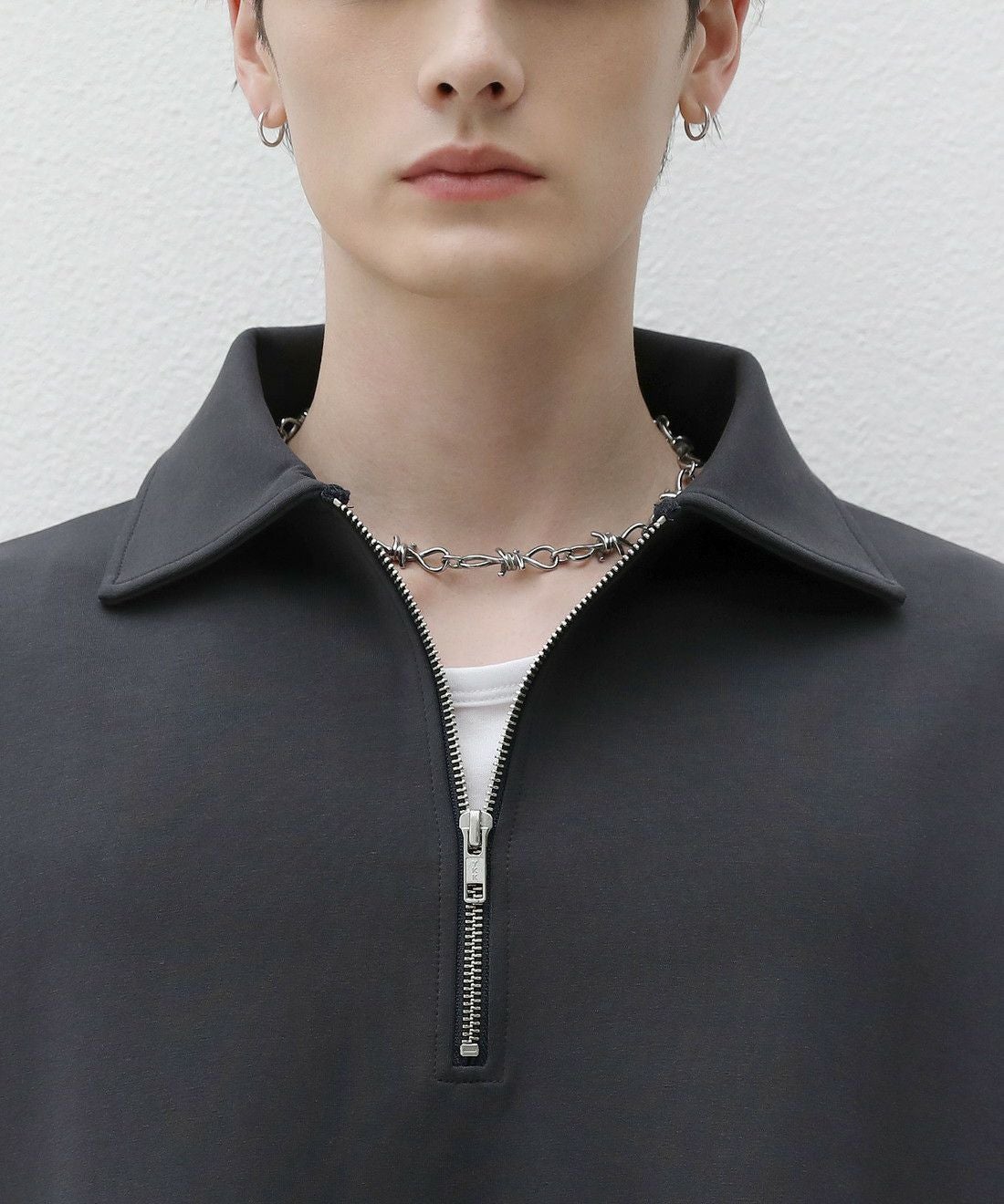 程よい光沢のある素材感でスラックスやワイドパンツの他、デニムパンツやカーゴパンツと合わせても上品にまとまります。ジップを閉めて1枚で、開けでインナーとのレイヤードを楽しむなど着こなしの幅が広がるアイテム。タックインスタイルもおすすめです。