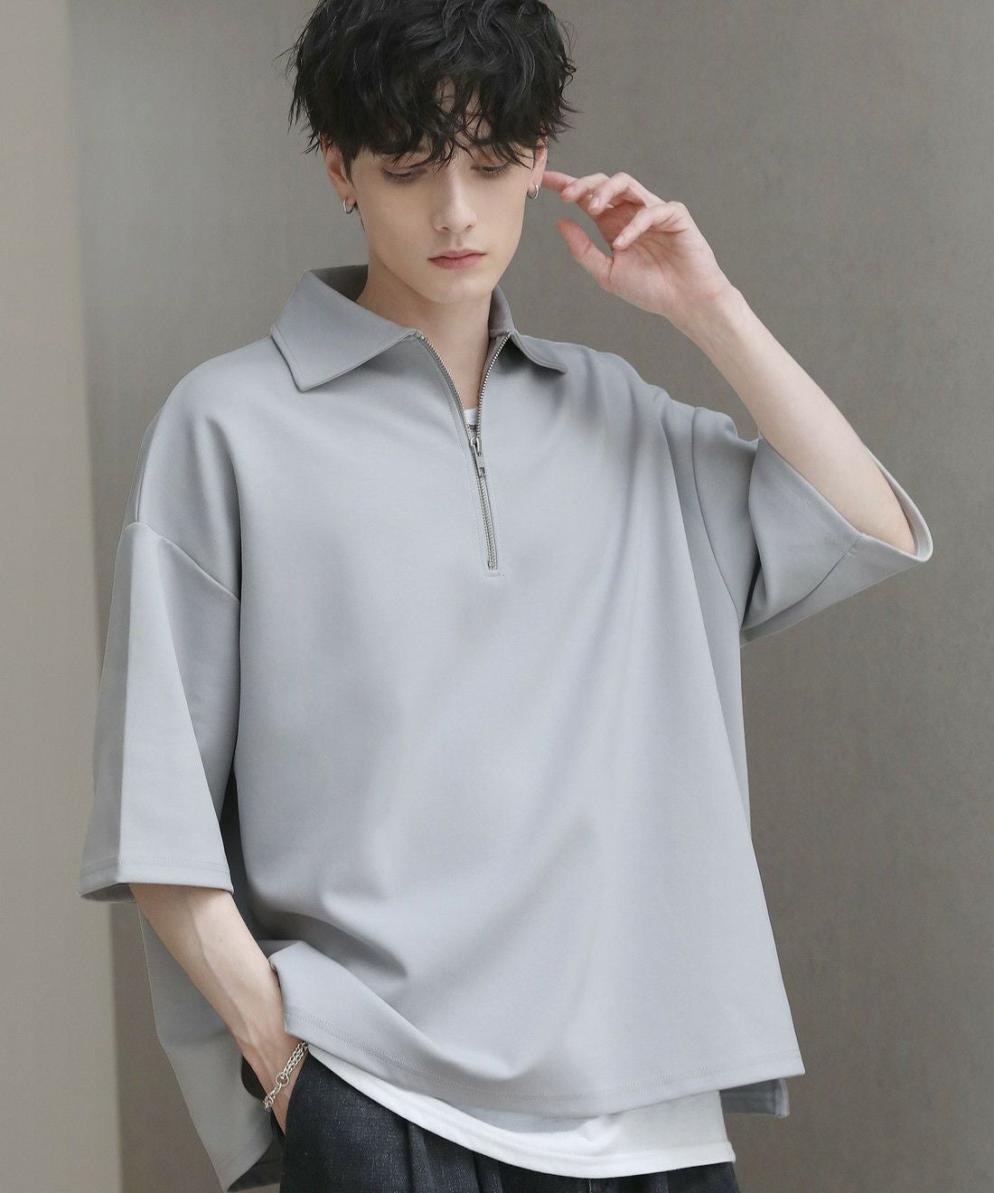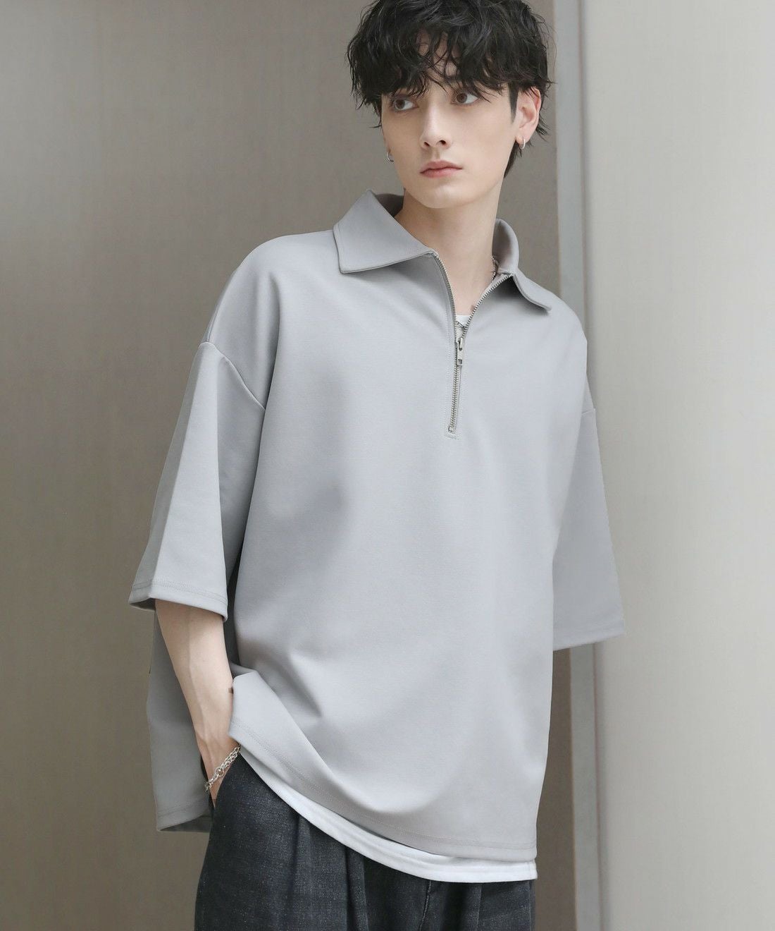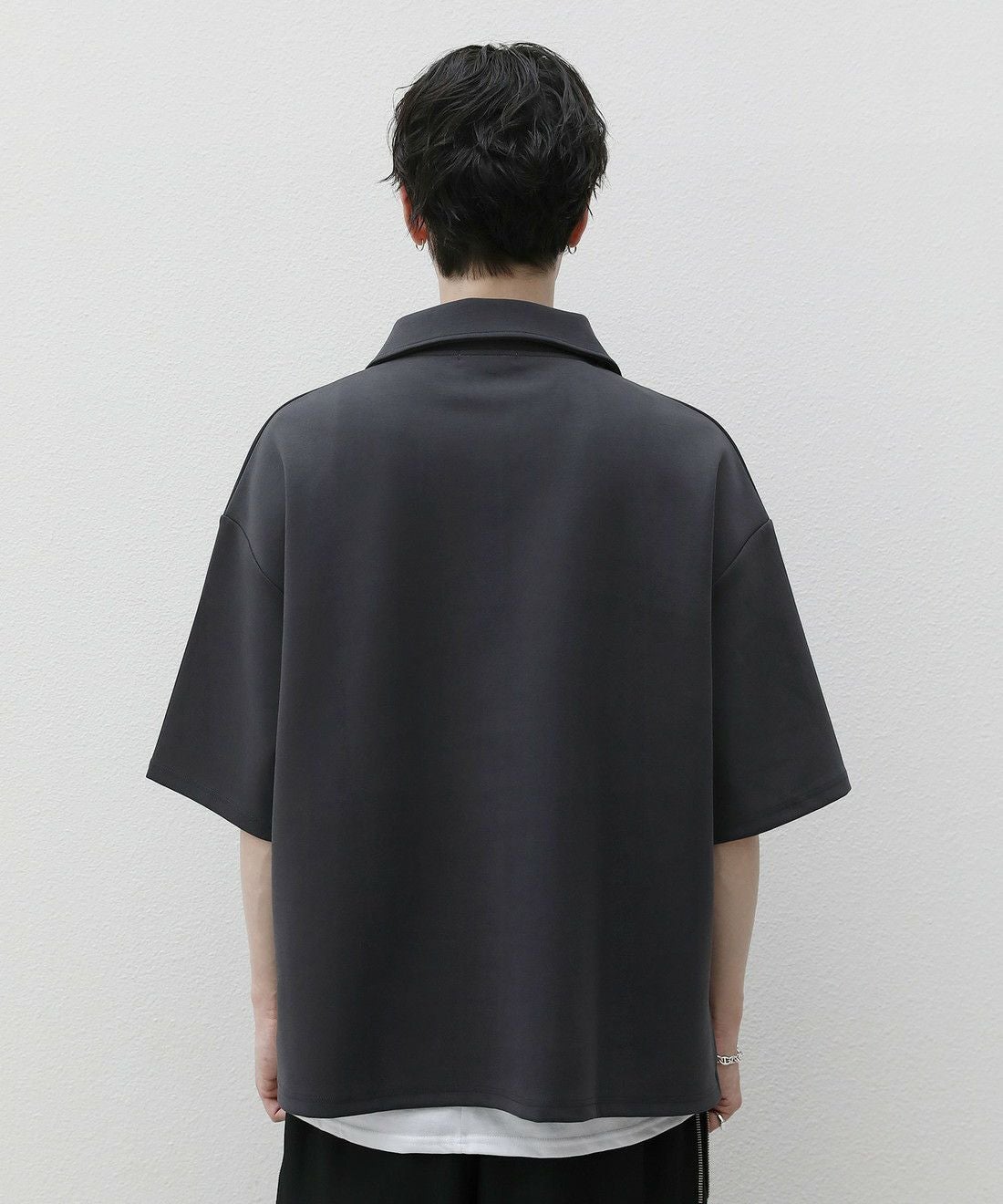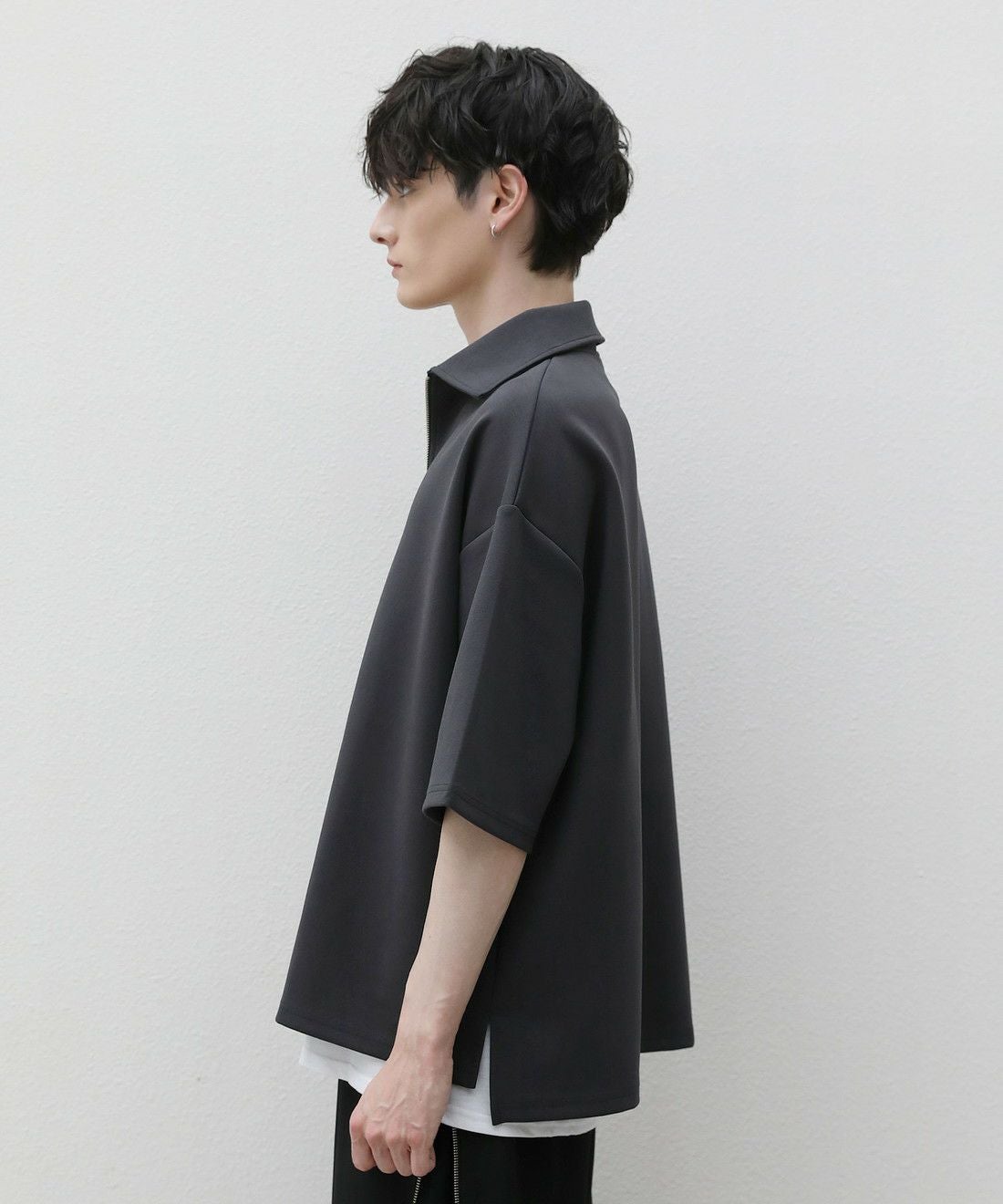 ベーシックで飽きの来ないハーフジップ仕様の半袖プルオーバー。ジップの開け閉めでレイヤードスタイルを楽しめる、こなれ感たっぷりな旬のアイテムです。オーバーサイズシルエットをベースに、前後差のあるサイドスリットが立体的なシルエットに見せてくれる一着。また、幅を広めに取った5分袖がリラックス感を醸します。空気を含んだようなふくらみと適度なハリのあるポンチ素材は、伸縮性に優れており動作もスムーズ。ほんのりと光沢感があり、シンプルなアイテムながら1枚で上品でキレイめな印象を与えてくれます。