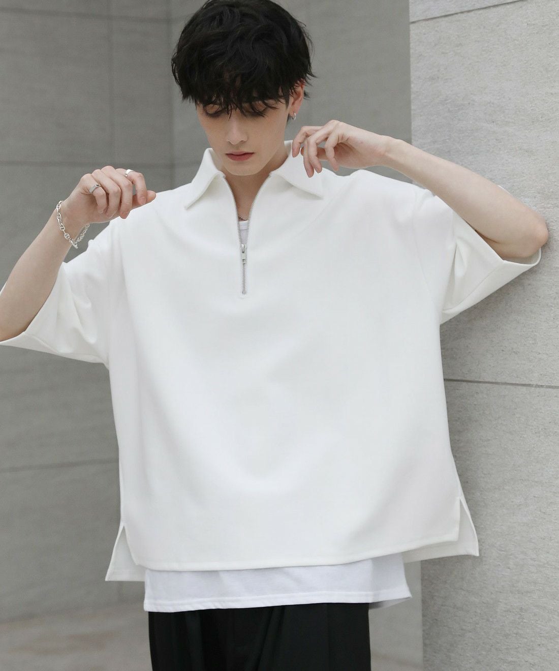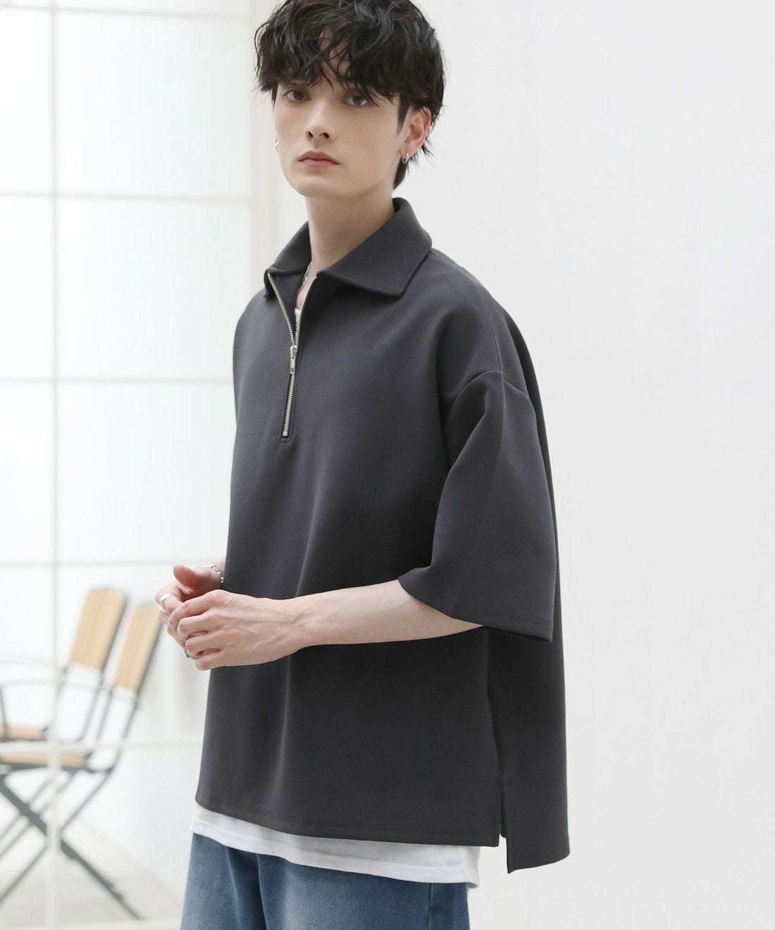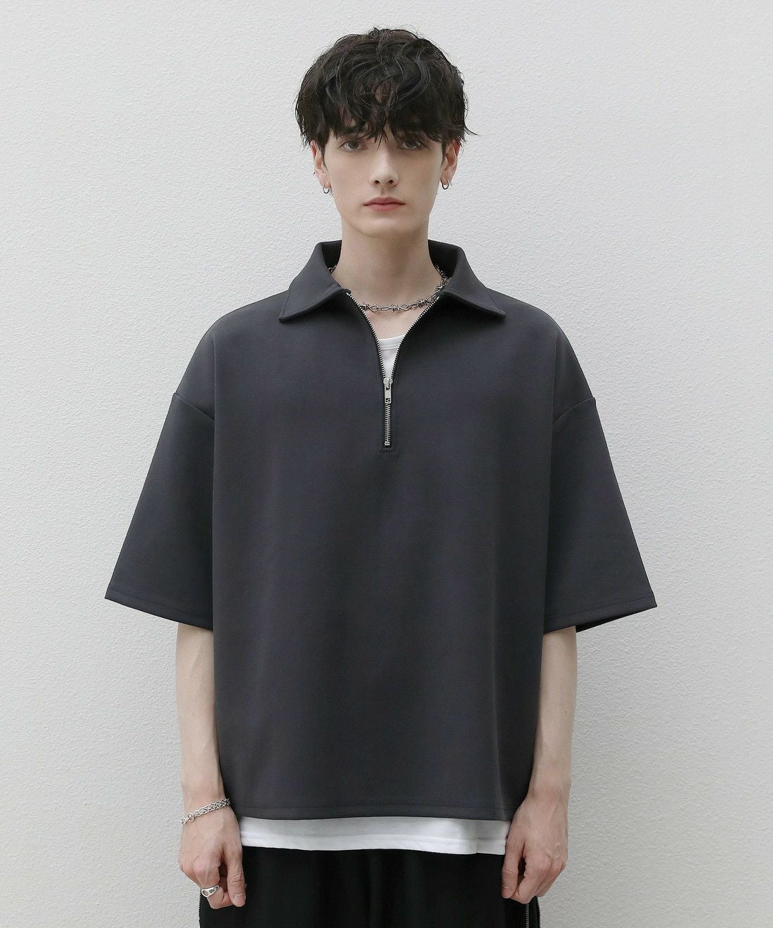 ベーシックで飽きの来ないハーフジップ仕様の半袖プルオーバー。ジップの開け閉めでレイヤードスタイルを楽しめる、こなれ感たっぷりな旬のアイテムです。オーバーサイズシルエットをベースに、前後差のあるサイドスリットが立体的なシルエットに見せてくれる一着。また、幅を広めに取った5分袖がリラックス感を醸します。空気を含んだようなふくらみと適度なハリのあるポンチ素材は、伸縮性に優れており動作もスムーズ。ほんのりと光沢感があり、シンプルなアイテムながら1枚で上品でキレイめな印象を与えてくれます。