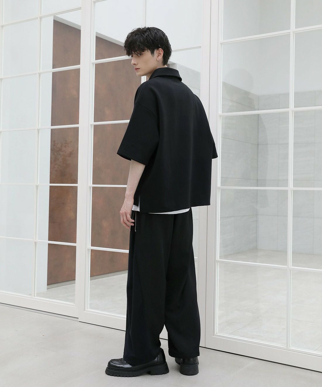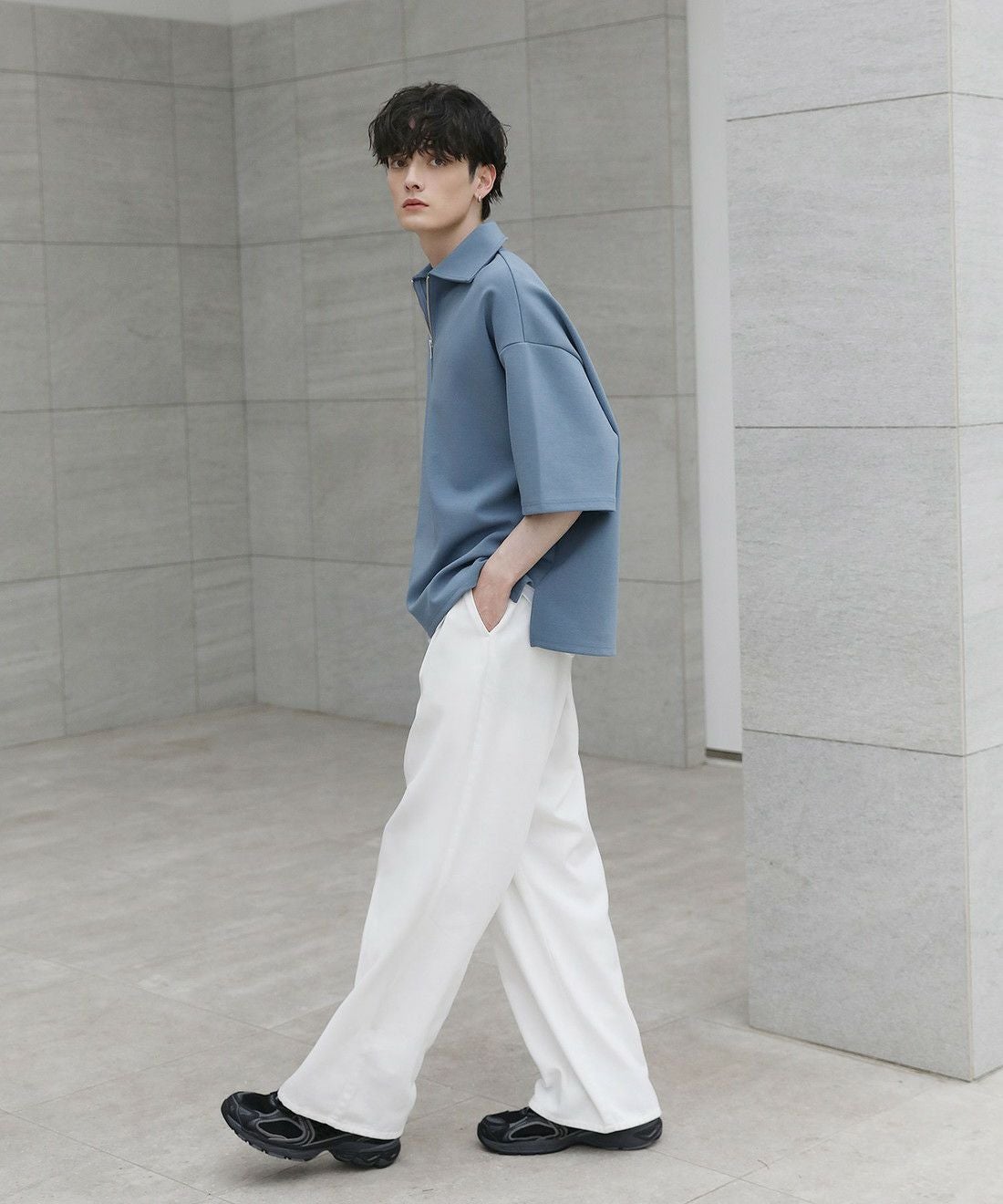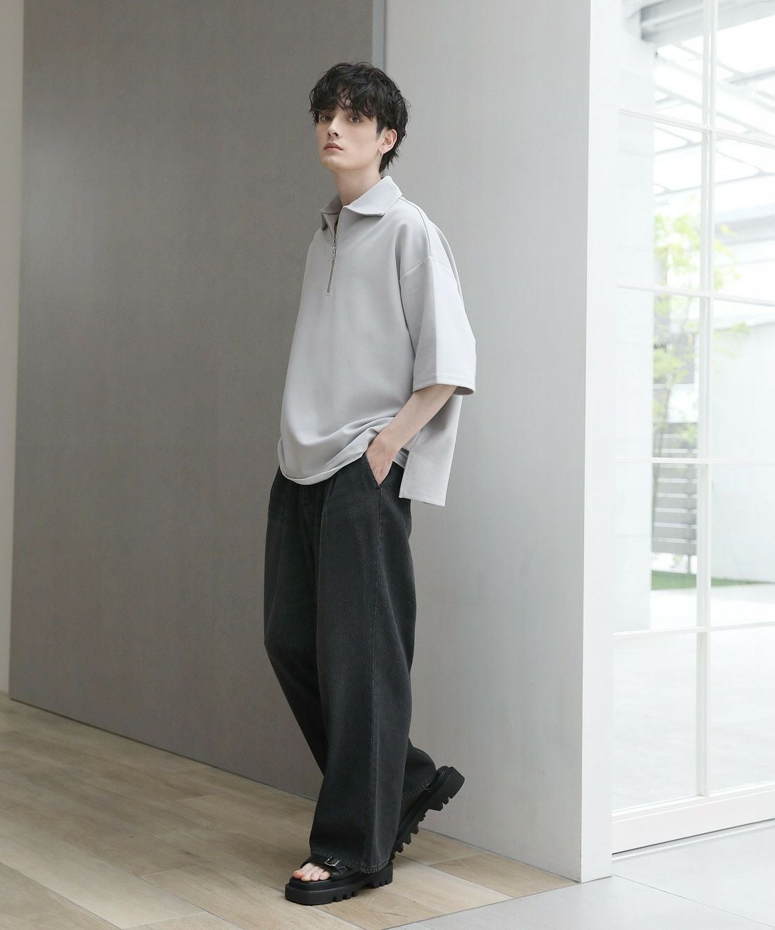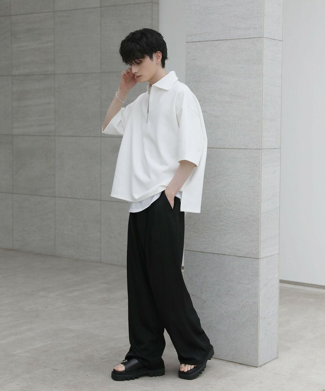 ベーシックで飽きの来ないハーフジップ仕様の半袖プルオーバー。ジップの開け閉めでレイヤードスタイルを楽しめる、こなれ感たっぷりな旬のアイテムです。オーバーサイズシルエットをベースに、前後差のあるサイドスリットが立体的なシルエットに見せてくれる一着。また、幅を広めに取った5分袖がリラックス感を醸します。空気を含んだようなふくらみと適度なハリのあるポンチ素材は、伸縮性に優れており動作もスムーズ。ほんのりと光沢感があり、シンプルなアイテムながら1枚で上品でキレイめな印象を与えてくれます。