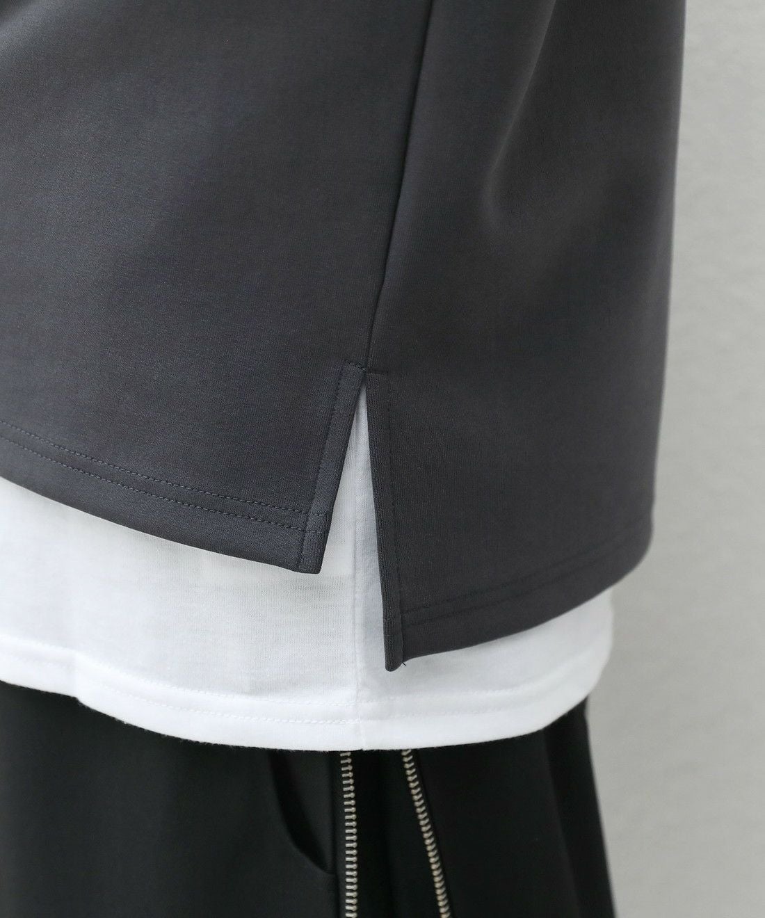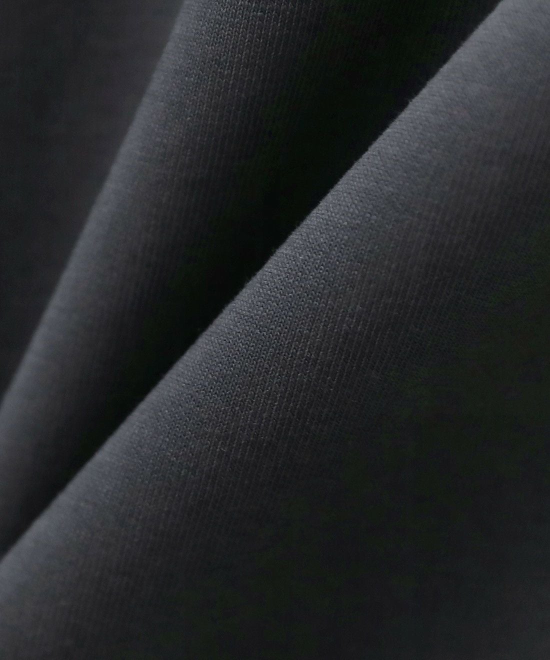 伸縮性のある柔らかなポンチ素材を使用しています。綿混紡素材なので通気性が良く、毛玉ができにくい点も魅力。適度な厚み肉感のヘビーウェイト生地で、ハリがありサラッとした肌触りに仕上げました。微光沢と艶感が美しく、キレイめな雰囲気でも着用いただけます。シワになりにくくご自宅でのケアも簡単なのも嬉しいポイントです。