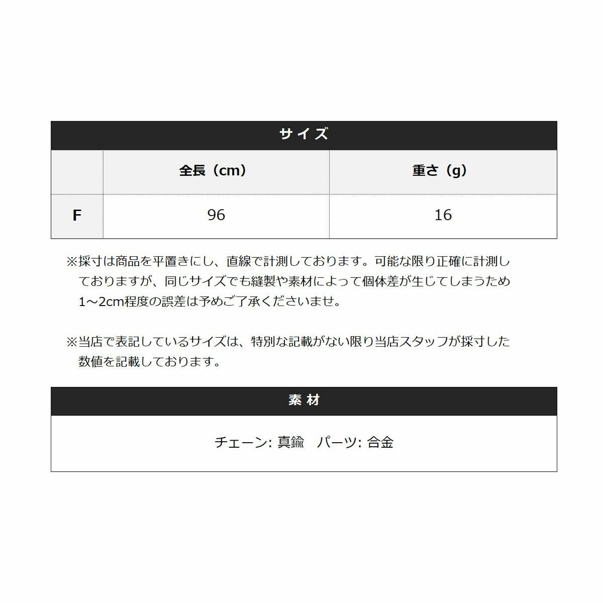 チェーンはマットな質感の真鍮、パーツは合金を使用。軽量なため、身に着けていてもストレスフリーに過ごしていただけます。