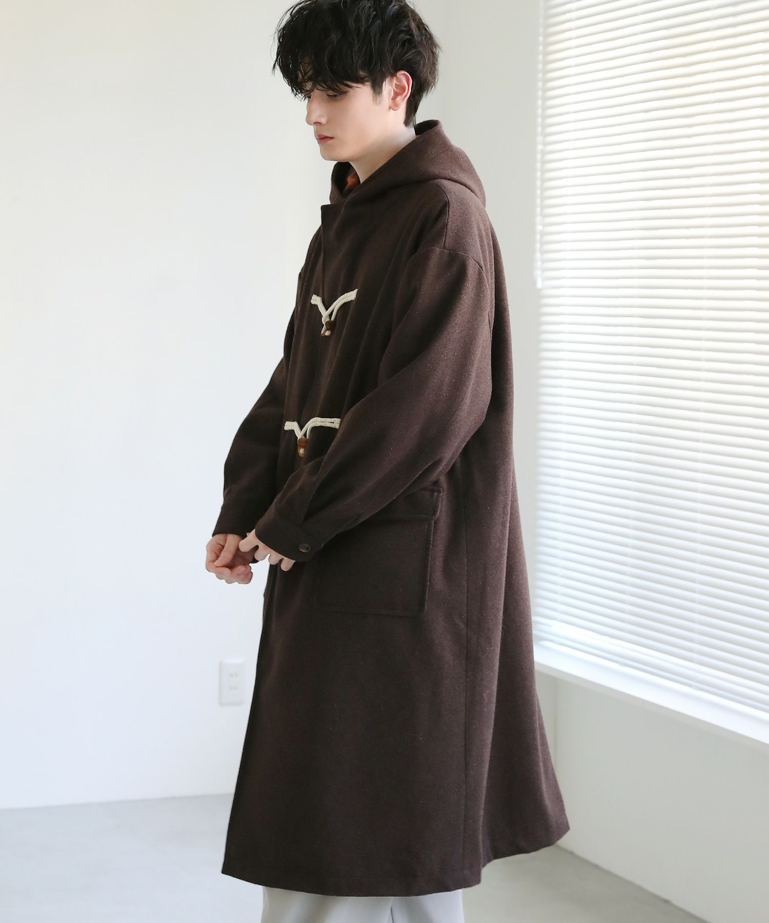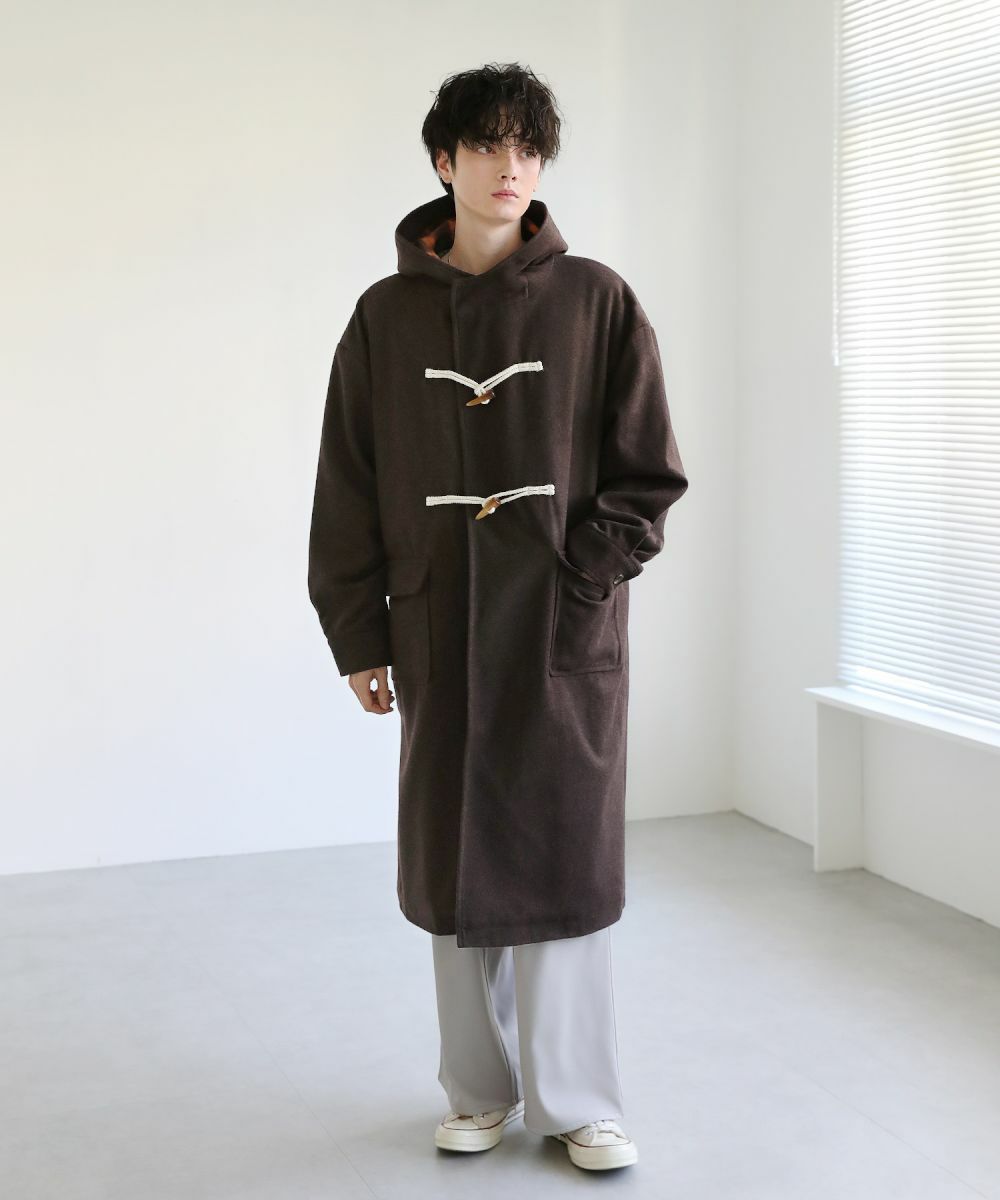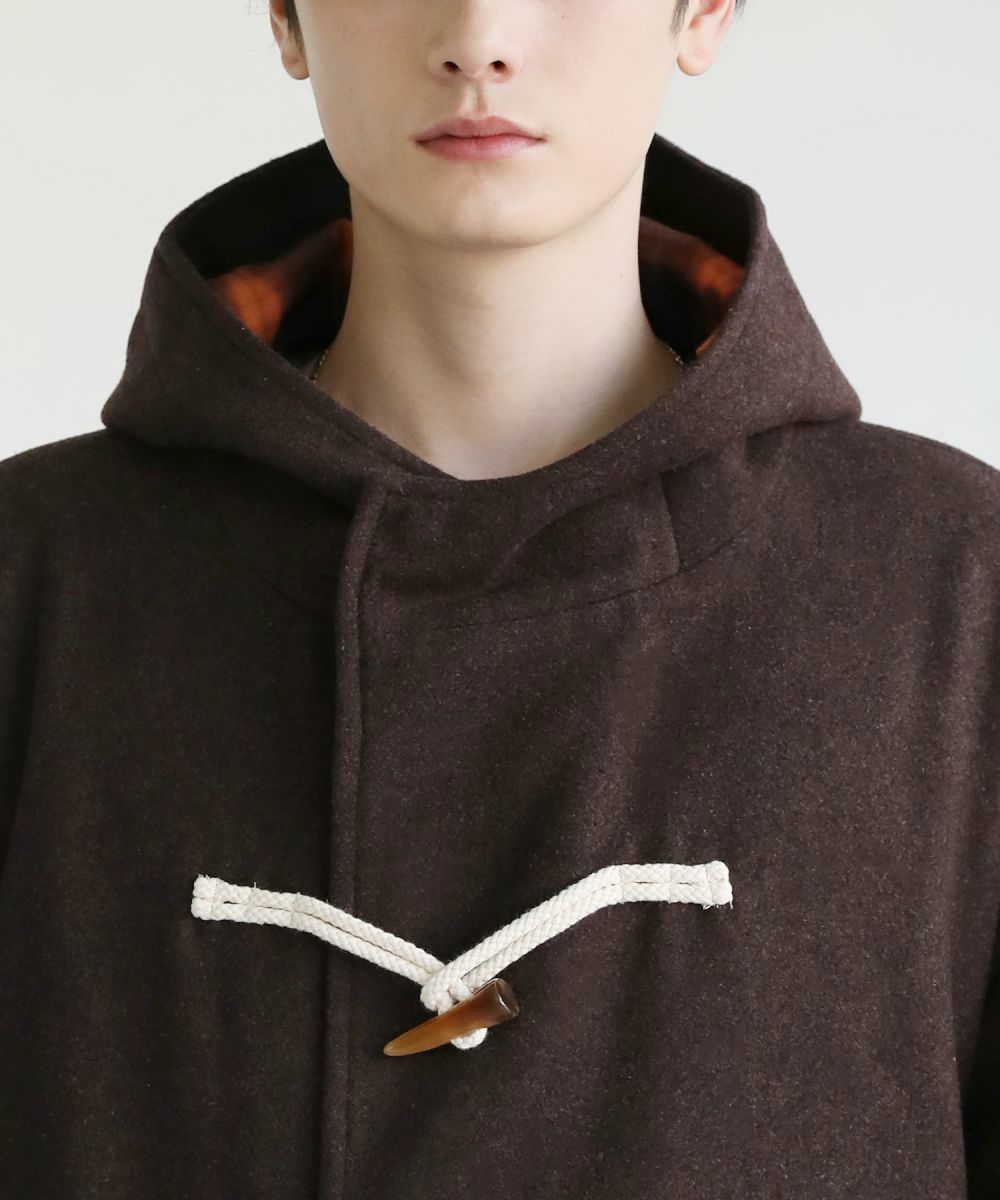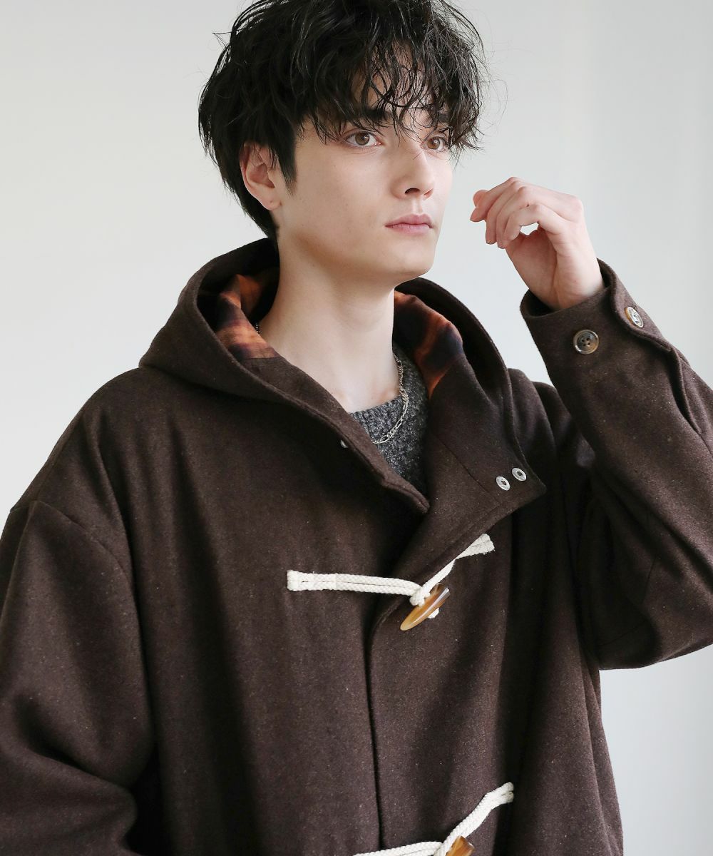 トレンドに左右されない冬のベーシックコート。起毛感のあるメルトン生地で仕上げ、温かみのある表情が特徴のダッフルコートです。クラシカルなデザインを取り入れながら、ゆとりを持たせたサイジングに仕上げたことでこなれ感を演出できます。下に向かって落ち感のあるシルエットのロングコートは防寒&スタイルアップが叶います。フードの内側に施したチェック柄生地がさりげないアクセントに。フロントサイドについた大きめなポケットで実用性も兼ね備えた普段使いに最適な一着です。