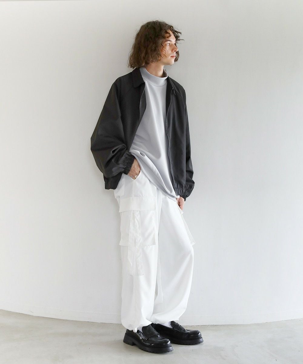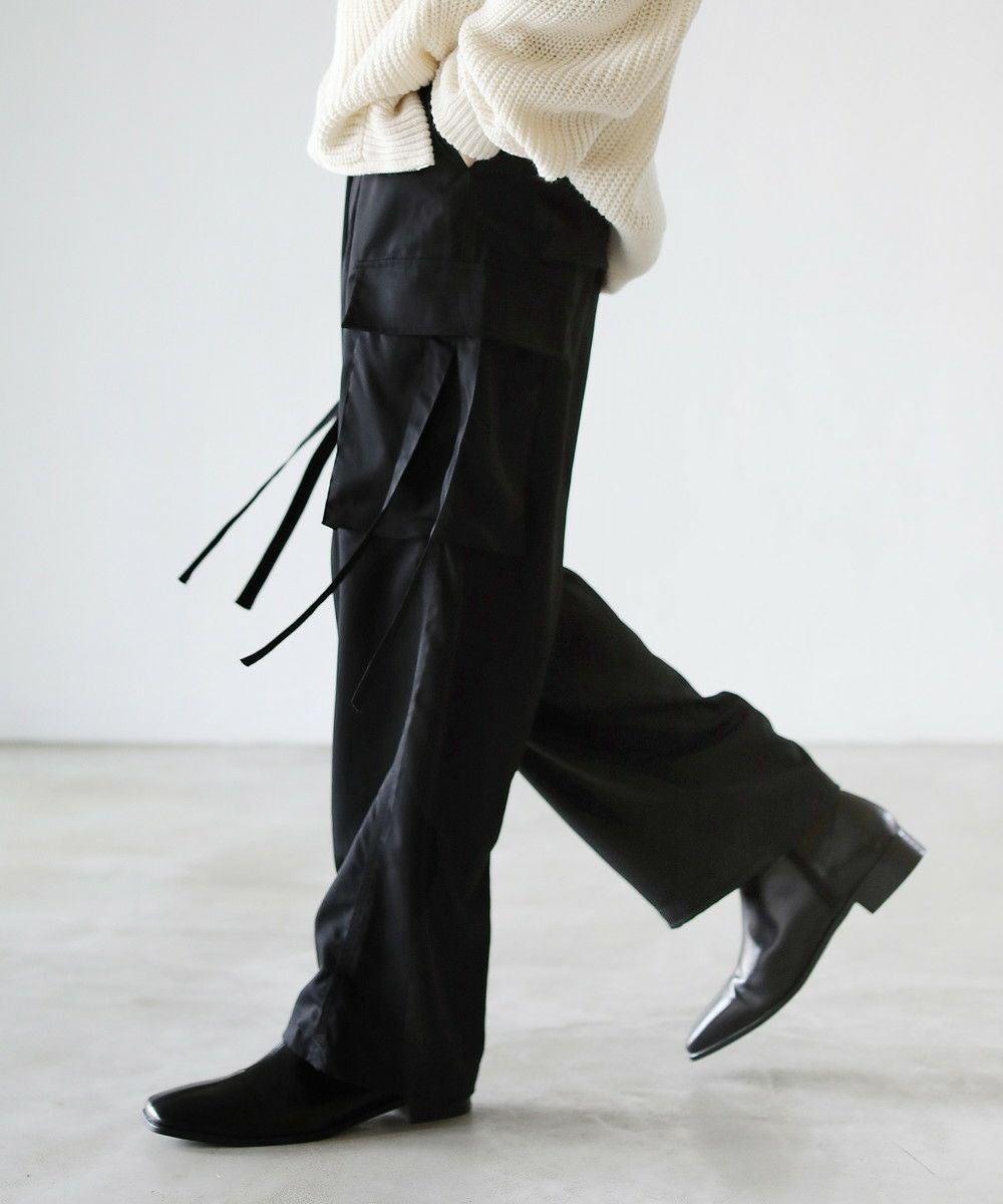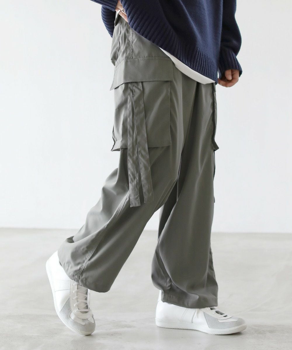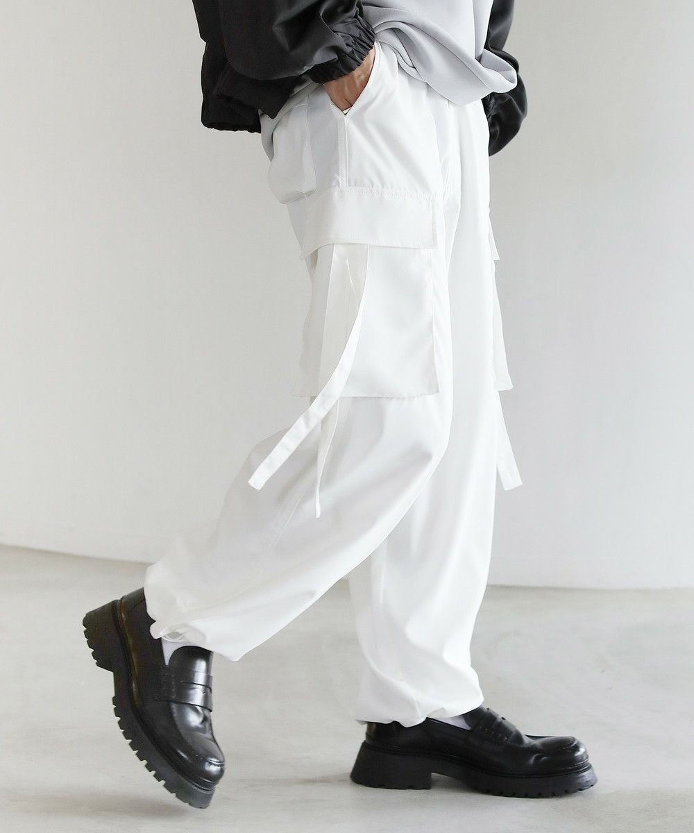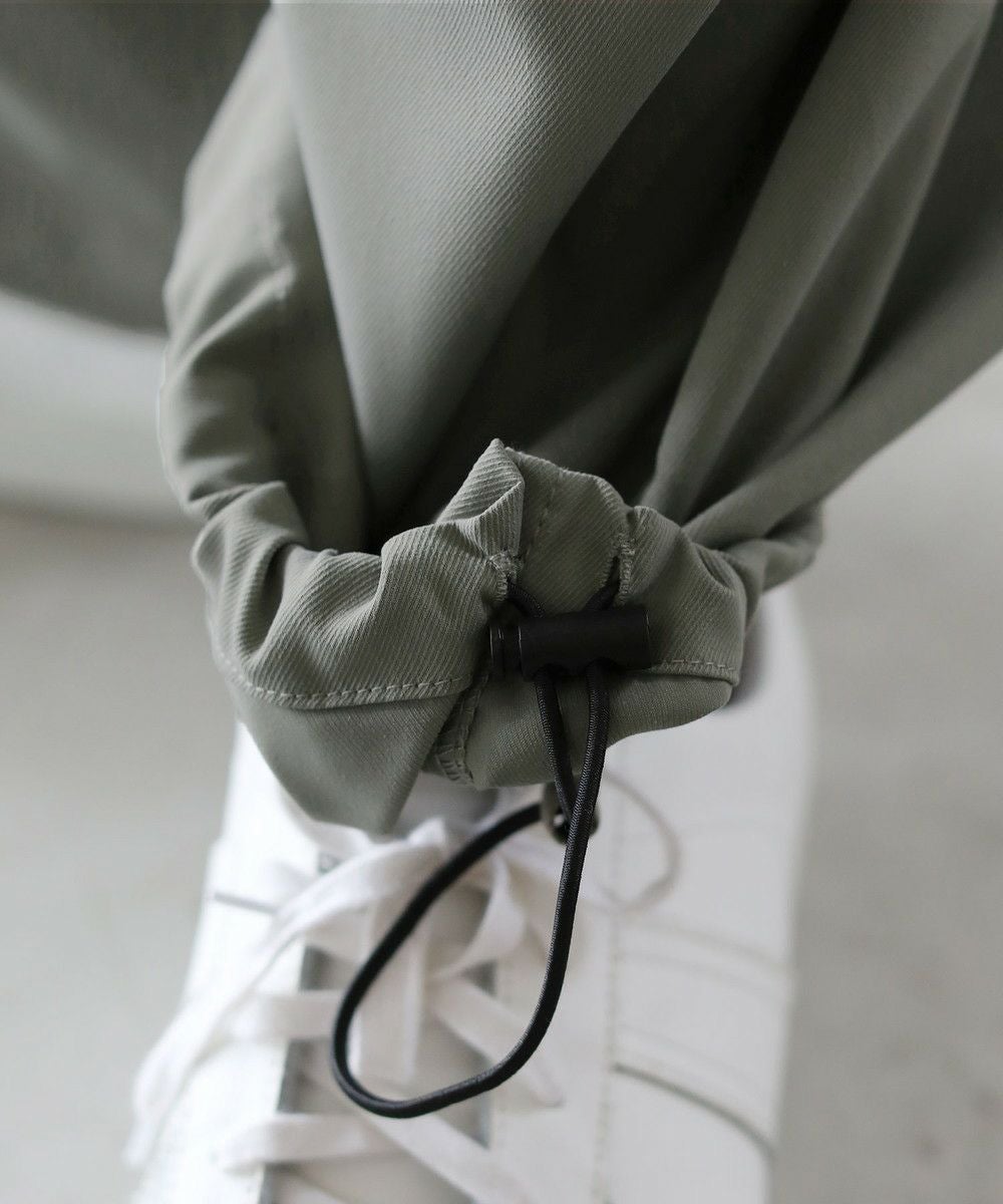 両サイドのベローズポケットからはリボンを垂らし、動きとアクセントをプラス。ヒップも合わせて4つ付いたポケットは容量も大きく、機能面でも手ぬかりありません。また、裾を絞るとバルーンの様な膨らみも作れるドローコード付きなので、お好みに合わせてシルエットのアレンジができます。