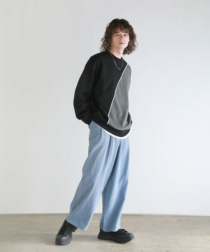 主役級の存在感を発揮してくれる、クルーネックの長袖プルオーバー。アシンメトリーな配色切り替えと、ラインステッチがインパクトのある一枚に仕上げています。ゆったりとした着心地で合わせるだけで抜け感のあるスタイリングが完成する万能アイテム。ホワイトのボディをベースに、パステルミントの配色が爽やかなホワイト系、ベーシックに使えるモノトーンカラーのブラック系をご用意しています。オフ×ブルーグレーA/ブラック×チャコールAは斜めに切り替えデザインが入り、オフ×ブルーグレーB/ブラック×チャコールBは垂直に切り返しデザインが入ります。それぞれ配色のデザインが異なるので、ご購入の際はご注意ください。