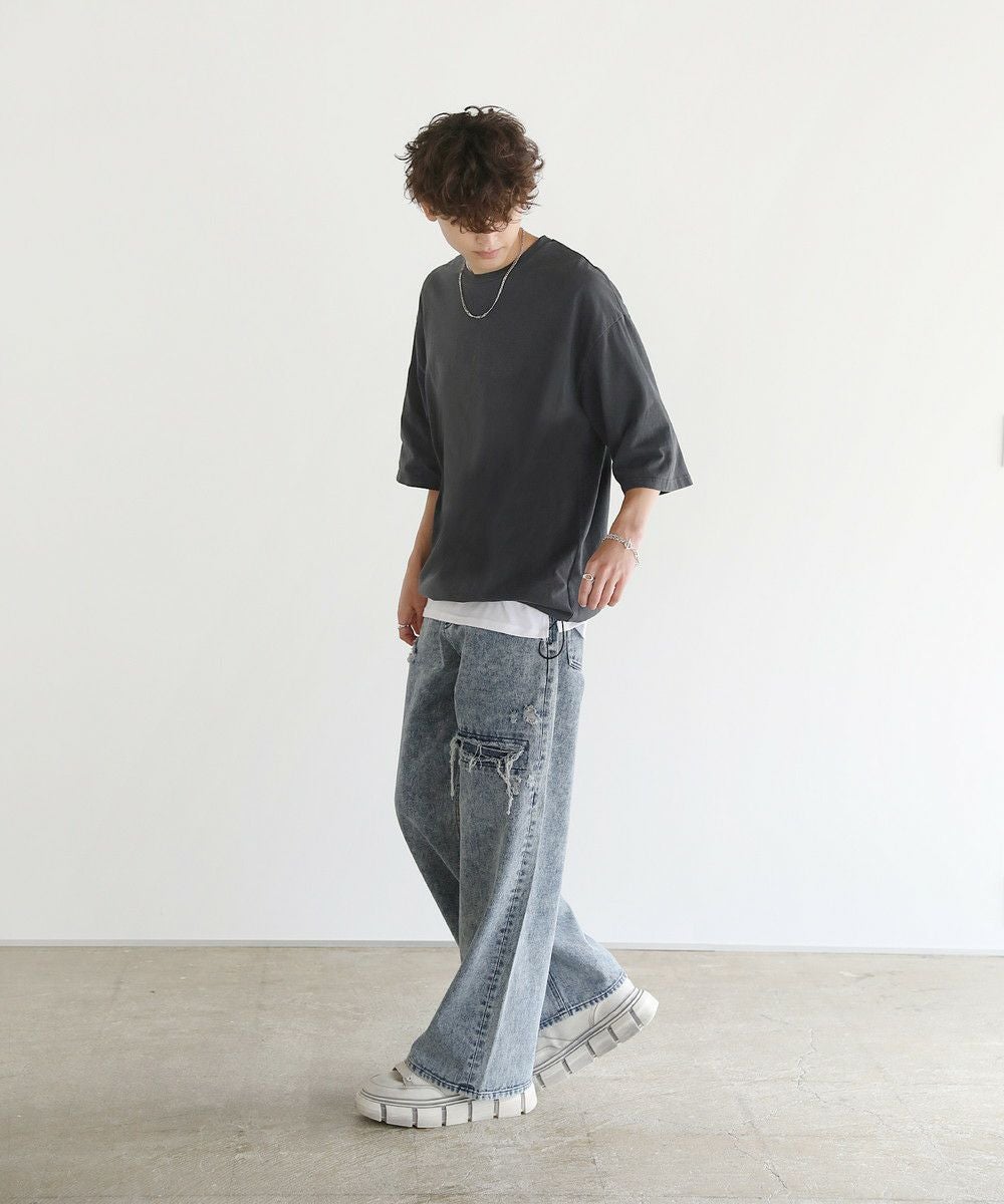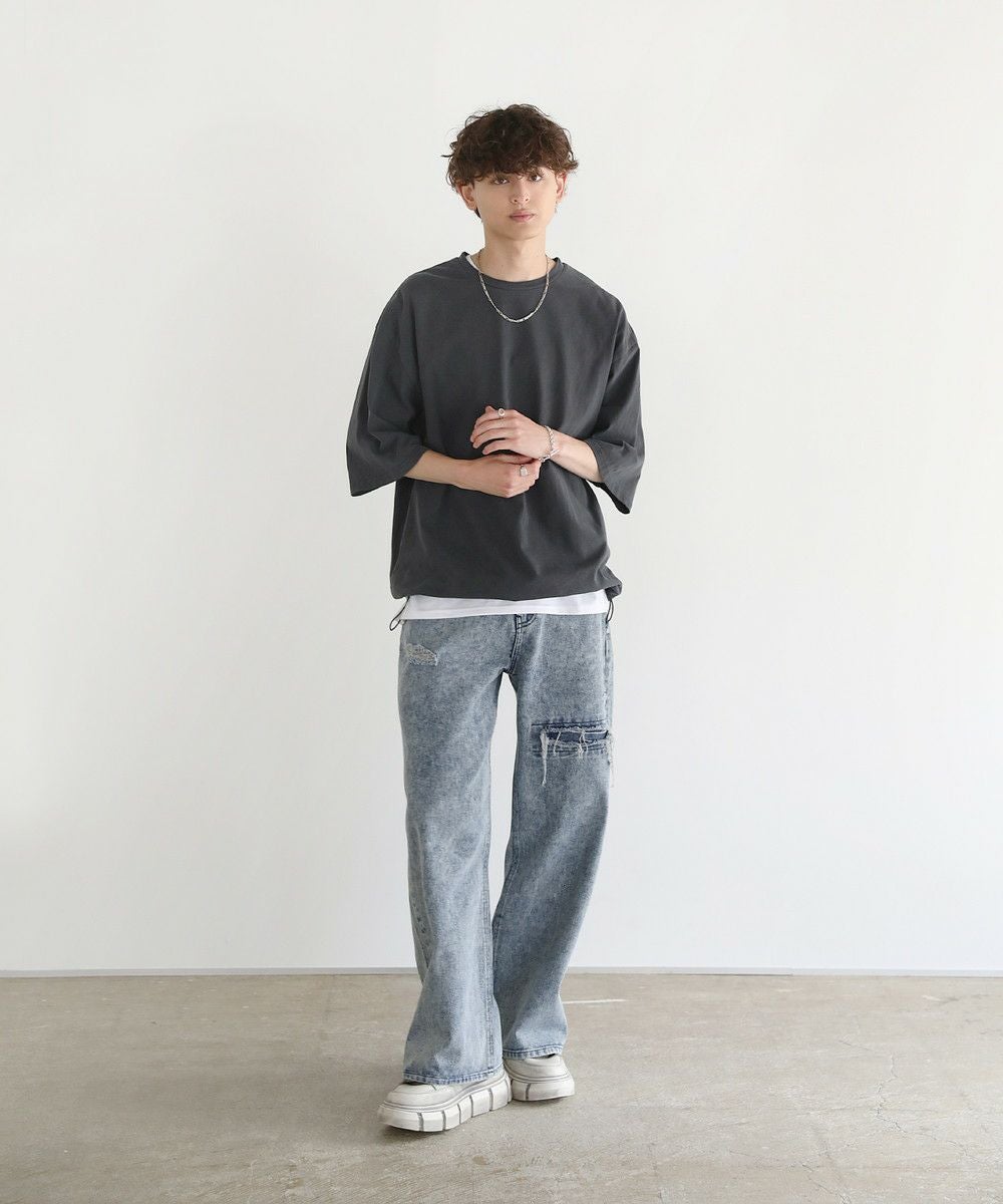 ヴィンテージ感のある風合いがカジュアルなアイテムと相性抜群。裾のドローコードをゆるめて、ボックスシルエットのシンプルなTシャツスタイルに、絞ってドルマンシルエットにもアレンジできる汎用性の高い一着です。デザイン自体はシンプルなクルーネックTシャツなので、ボトムスを選ばず合わせやすいのがポイント。ワイドパンツやデニムパンツなど、お手持ちのアイテムと合わせてトレンドの着こなしが完成します。