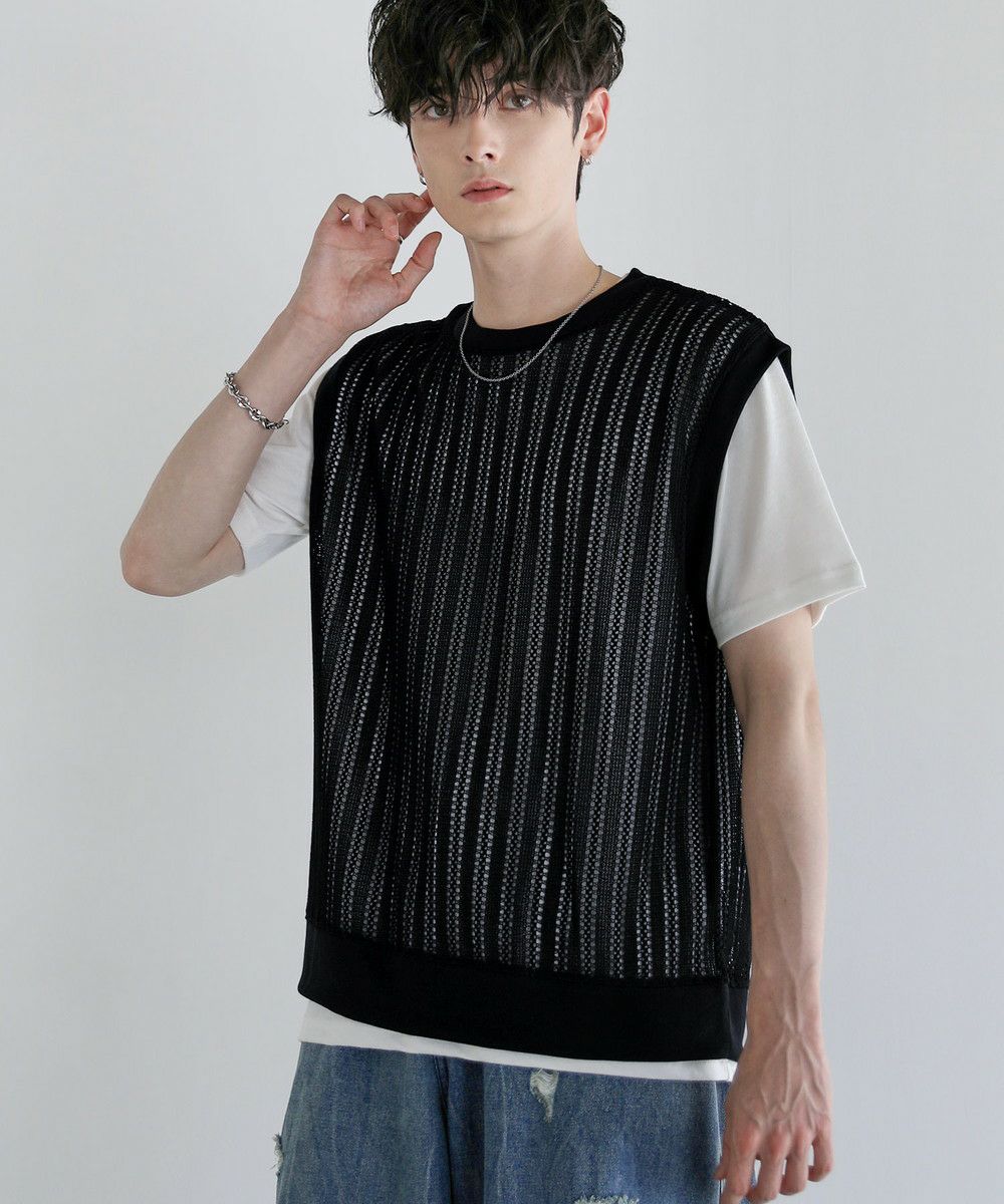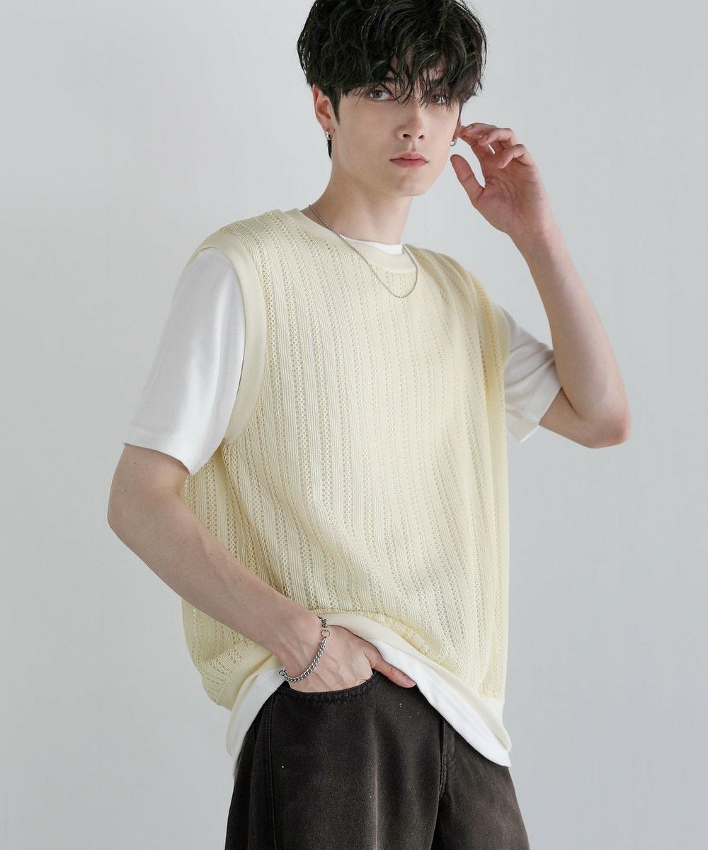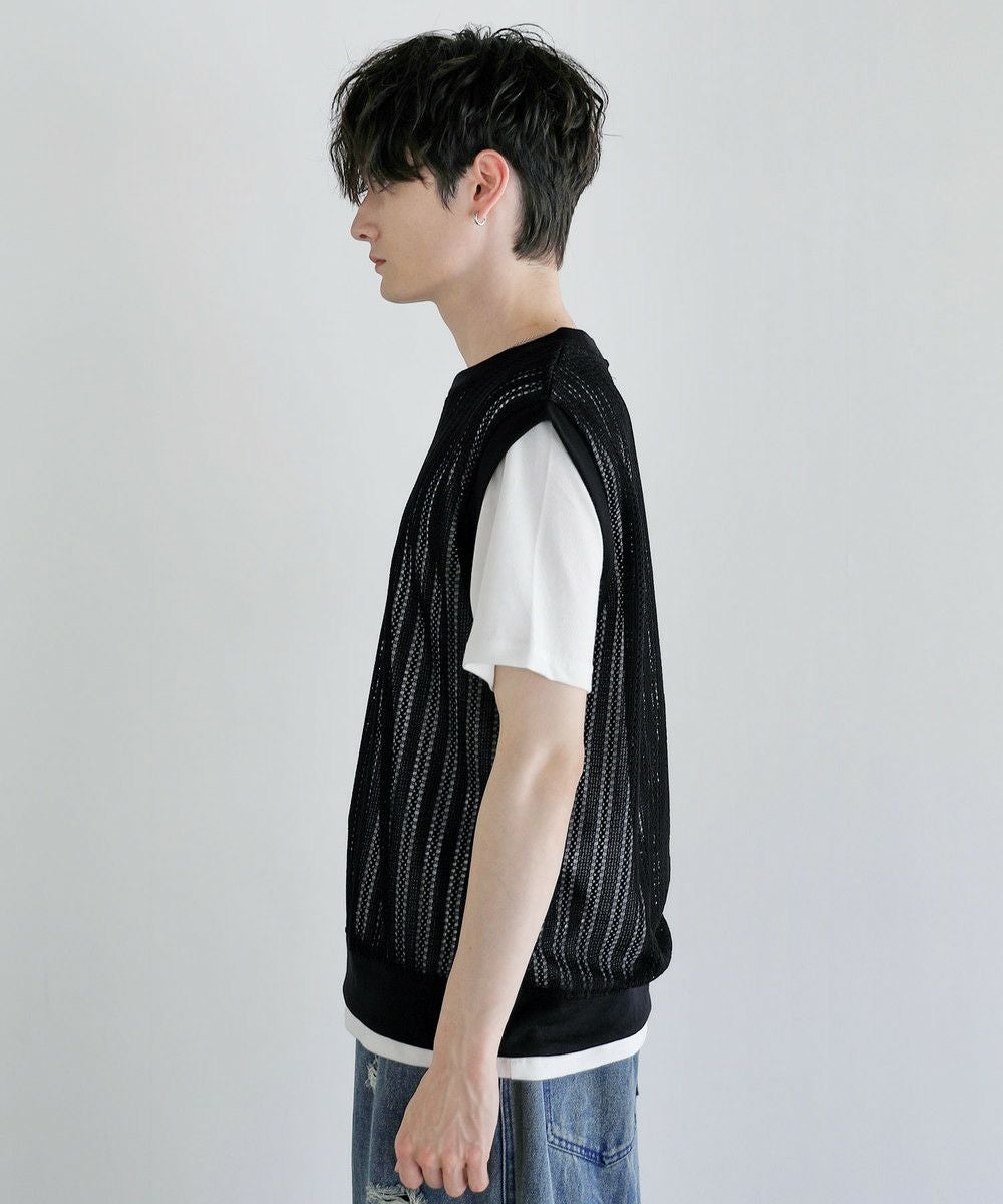 トレンドのシアー感を楽しめるニットベストとTシャツのアンサンブル。ニットは縦のラインが強調された編地でスタイリッシュな印象を醸します。セットでご着用いただくと、絶妙な丈感でバランスの取れたレイヤードコーデに。また、単品使いもでき、幅広いアイテムと相性抜群。着回しに使いやすいブラックとオフホワイトの2色展開です。