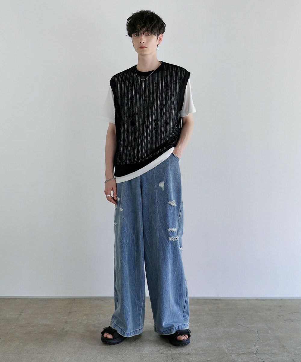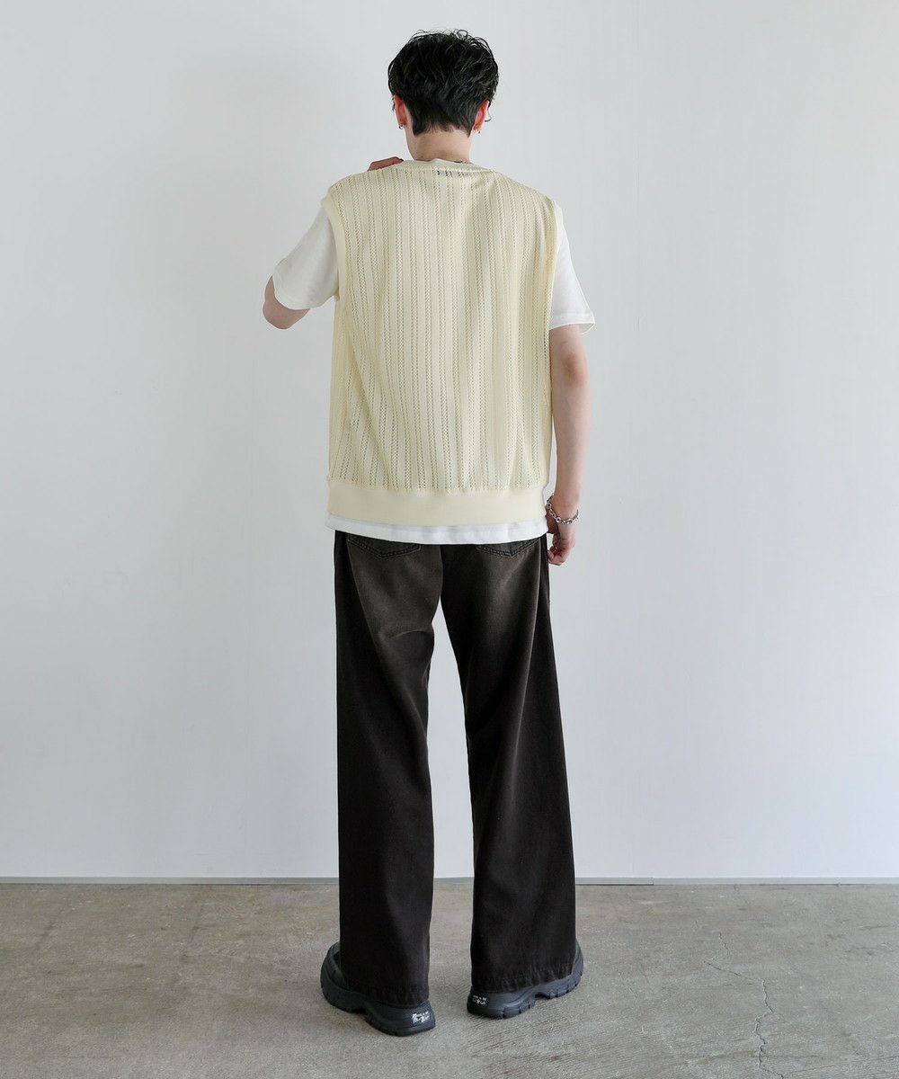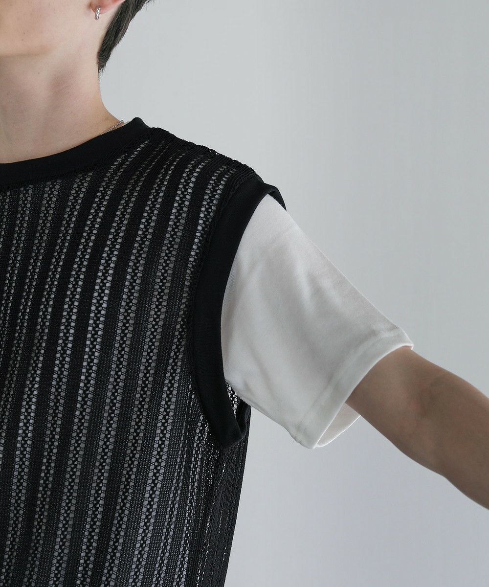 トレンドのシアー感を楽しめるニットベストとTシャツのアンサンブル。ニットは縦のラインが強調された編地でスタイリッシュな印象を醸します。セットでご着用いただくと、絶妙な丈感でバランスの取れたレイヤードコーデに。また、単品使いもでき、幅広いアイテムと相性抜群。着回しに使いやすいブラックとオフホワイトの2色展開です。