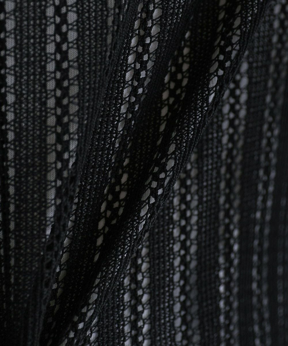 ポリエステル100%素材の透かし編みニット。細めの糸を使った透かし編みにより、軽やかで通気性にも優れた春夏シーズンにぴったりの生地に仕上げました。