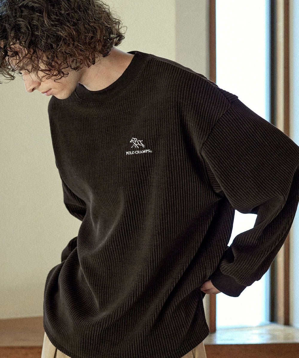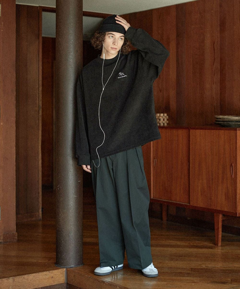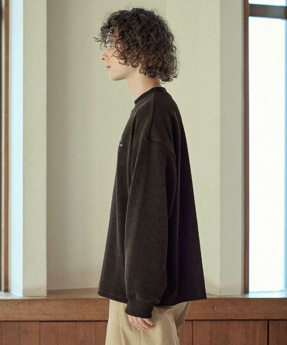 ウォーム感のあるコーデュロイ生地を使用したモックネックプルオーバー。胸元のブランド刺繍ロゴがワンポイントになり、1枚でコーディネートが完成するアイテムです。ゆったりとしたシルエットにドロップショルダー、サイドスリットが抜け感たっぷりのデザイン。