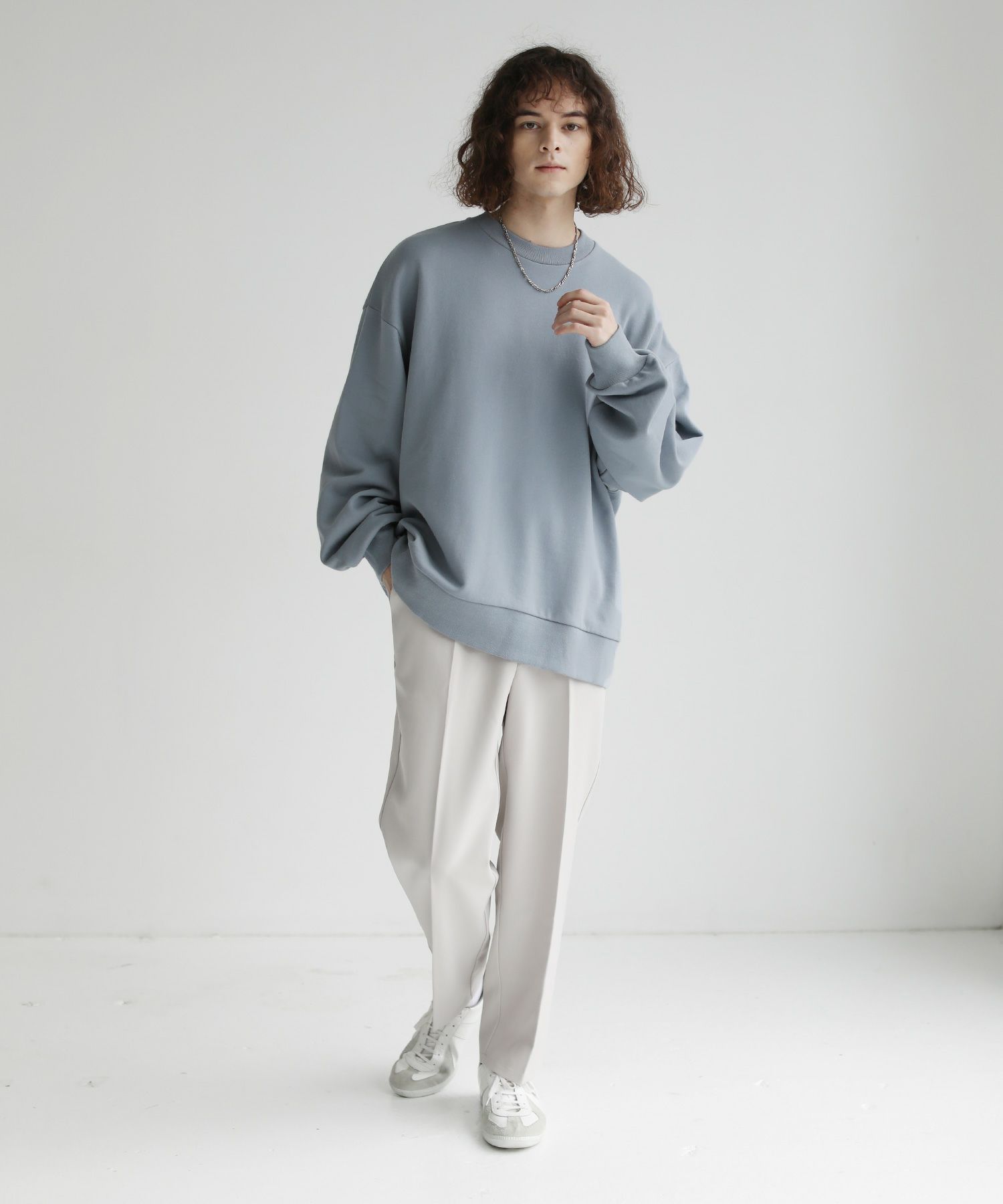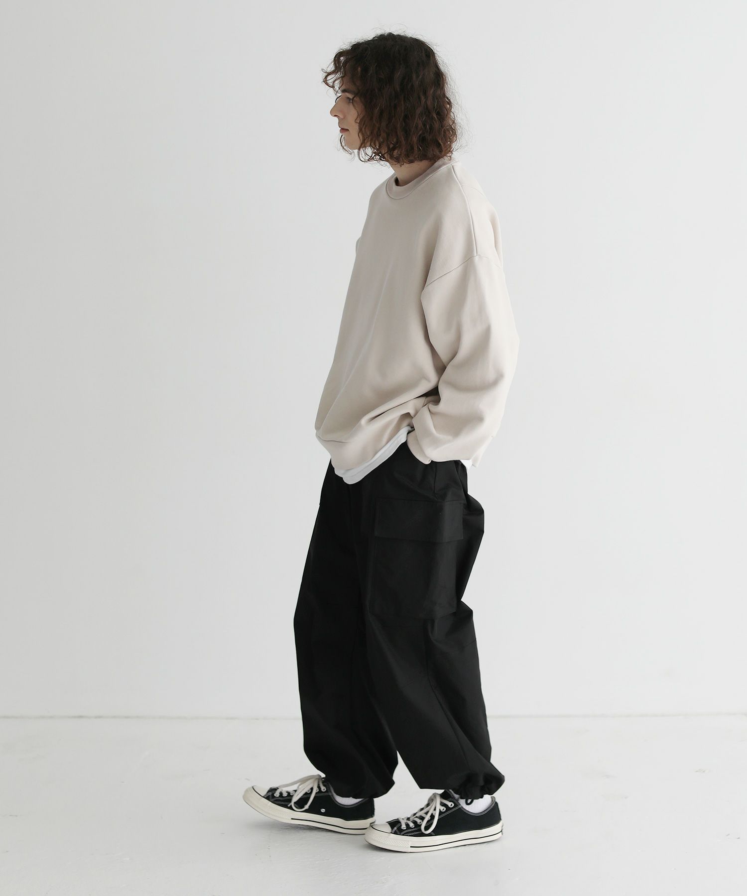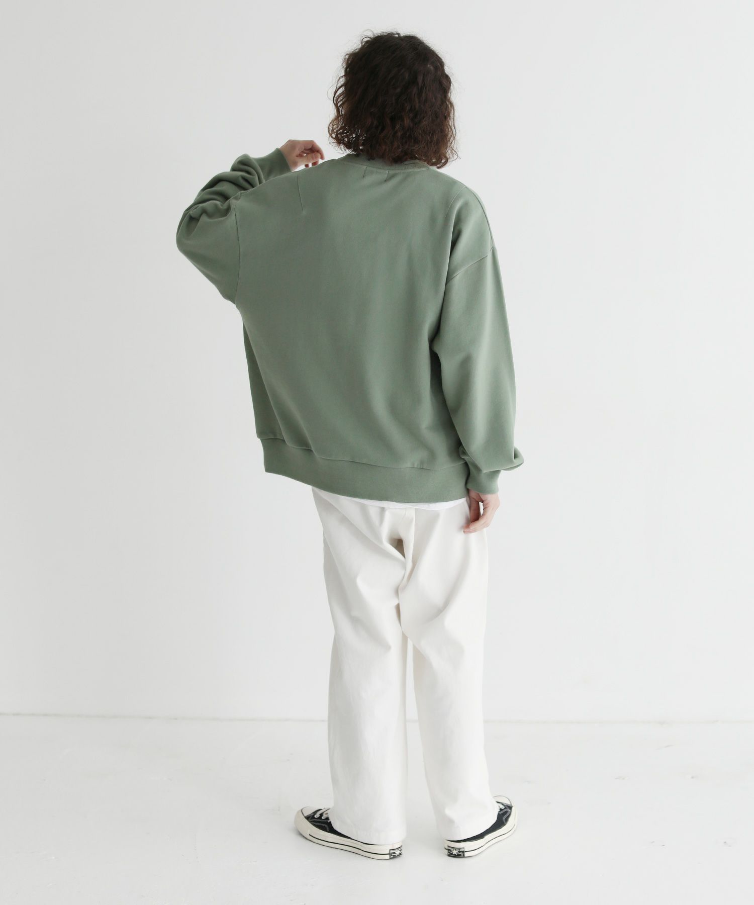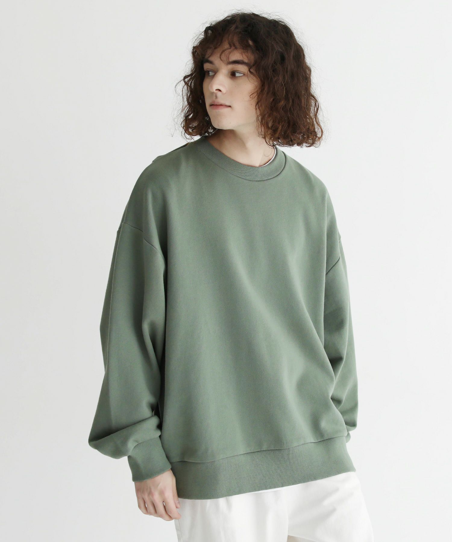肩を落としたドロップショルダーデザインと程よい着丈、身頃のサイズや袖のボリューム感など、調節を繰り返して仕上げたオーバーサイズのシルエットです。ゆったりとしたこのシルエットで、リラクシングな雰囲気が演出されます。