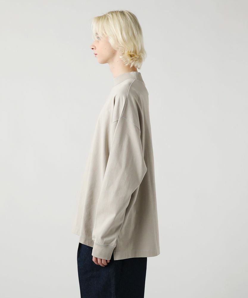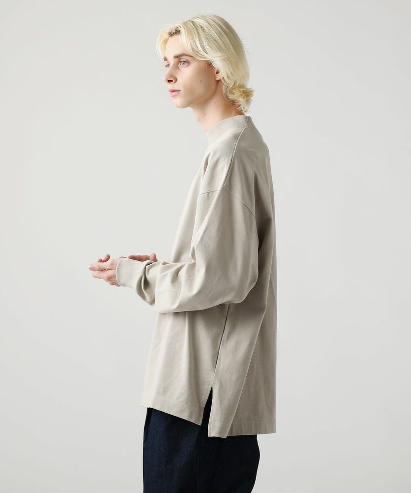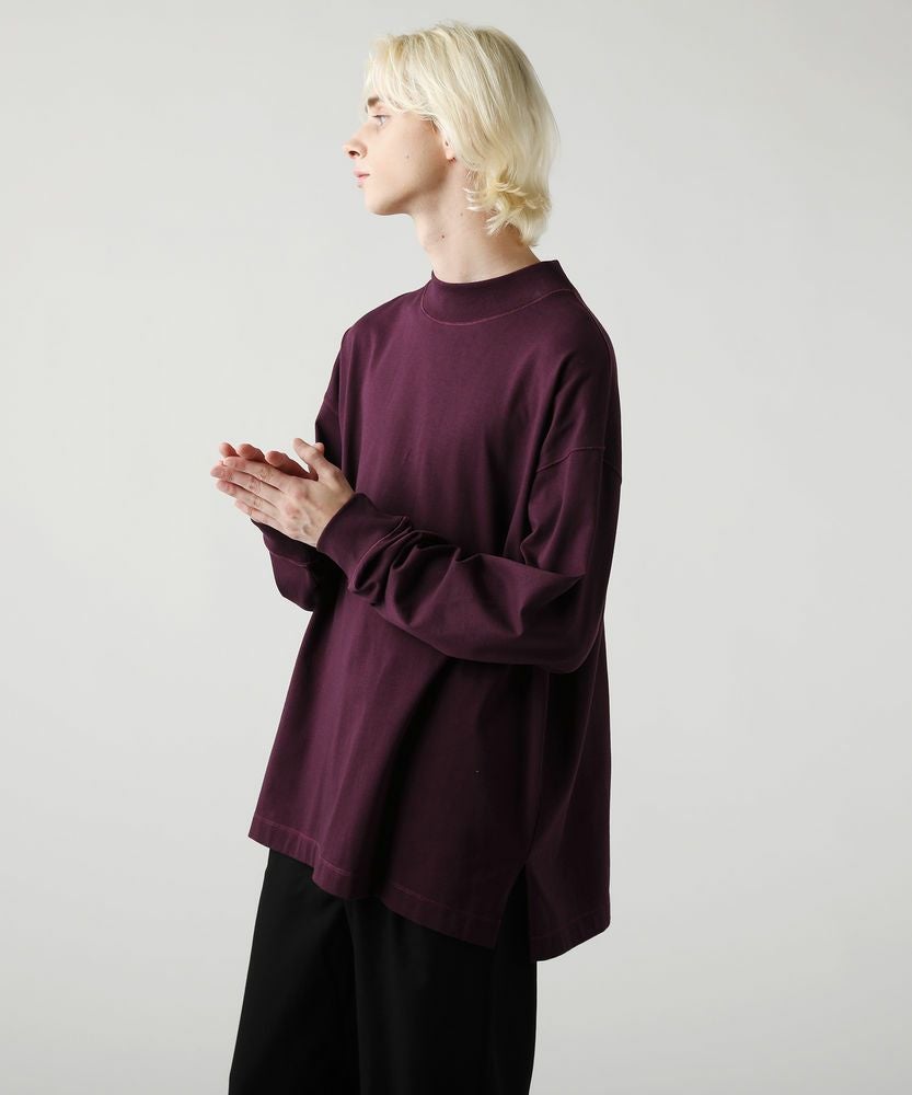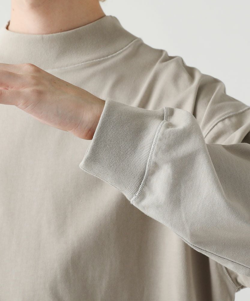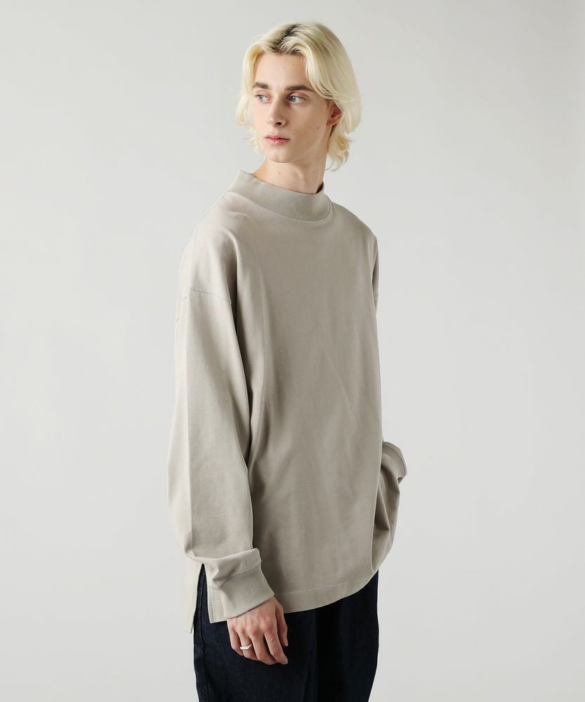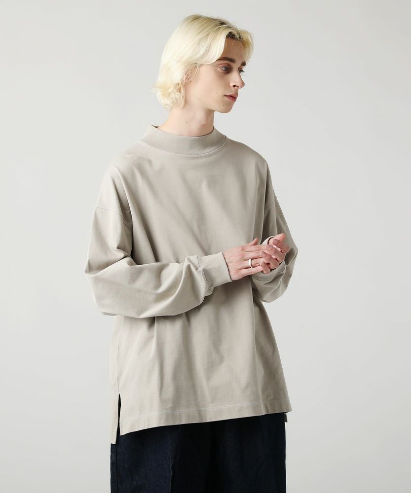 綿100%のMVS天竺を採用した、モックネックのプルオーバーです。飽きの来ないシンプルなデザインで、一枚でもおしゃれに着られるデイリーユースなアイテムです。オーバーサイズシルエットをベースに、前後差のあるサイドスリットがアクセントになる一着。無駄を省いたシンプルなデザインながら、縫い目に3本針ステッチを入れてさり気なくデザイン性をプラスしております。