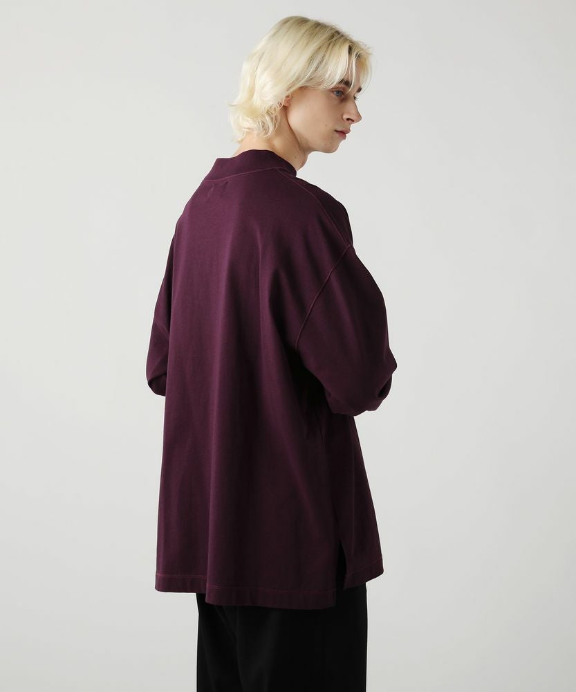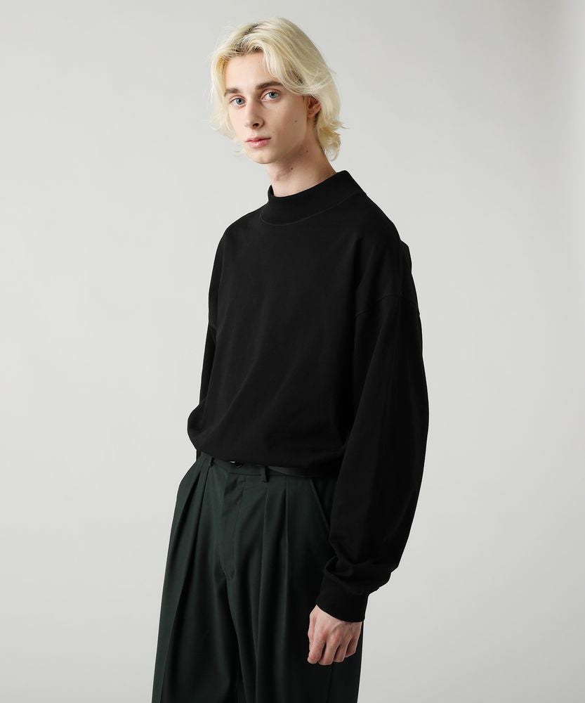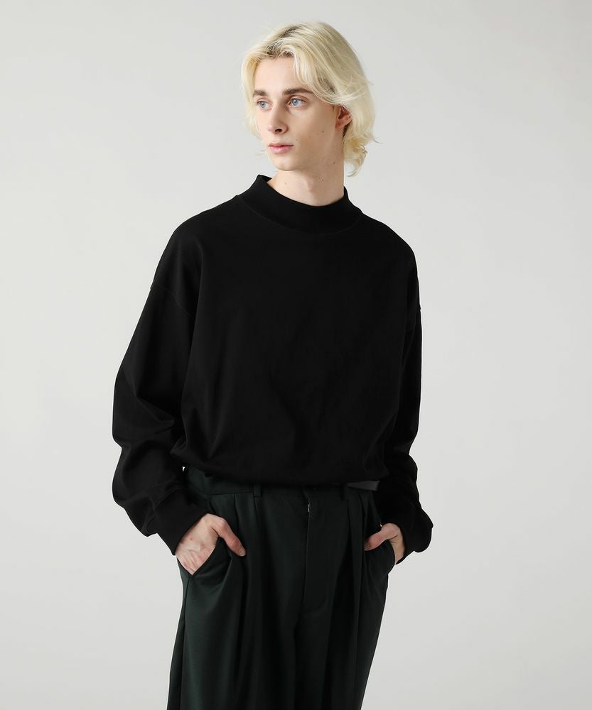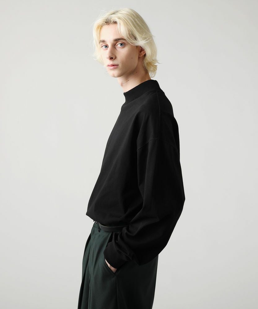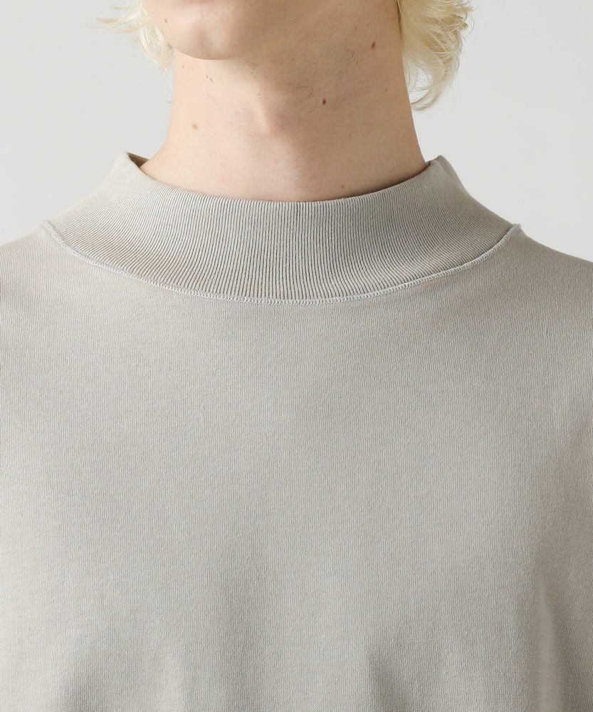 綿100%のMVS天竺を採用した、モックネックのプルオーバーです。飽きの来ないシンプルなデザインで、一枚でもおしゃれに着られるデイリーユースなアイテムです。オーバーサイズシルエットをベースに、前後差のあるサイドスリットがアクセントになる一着。無駄を省いたシンプルなデザインながら、縫い目に3本針ステッチを入れてさり気なくデザイン性をプラスしております。