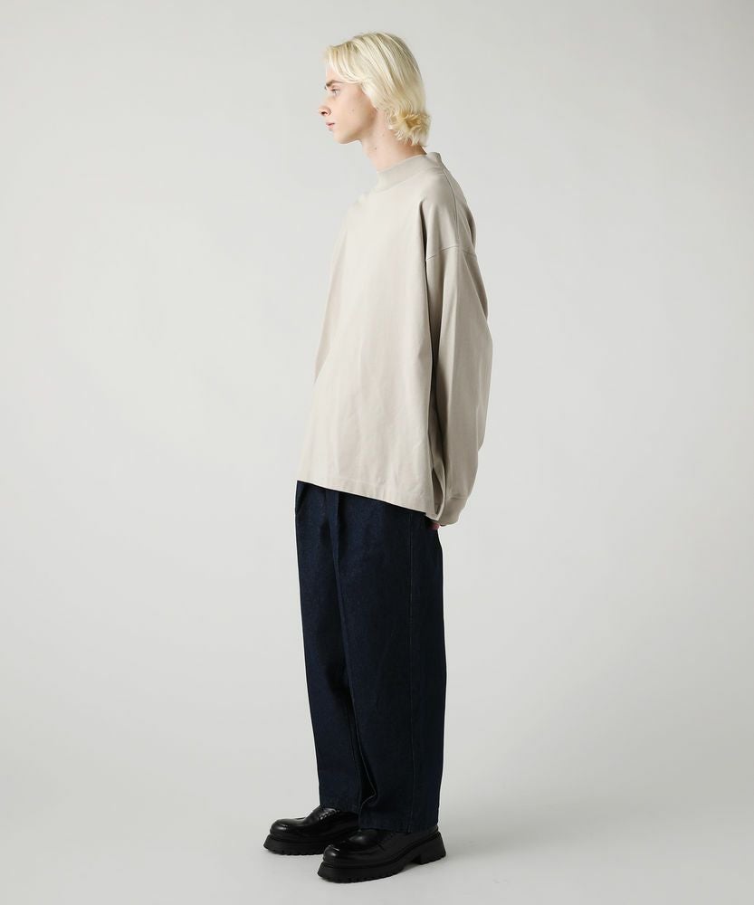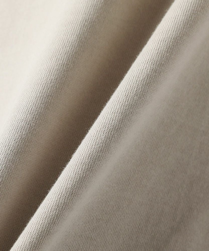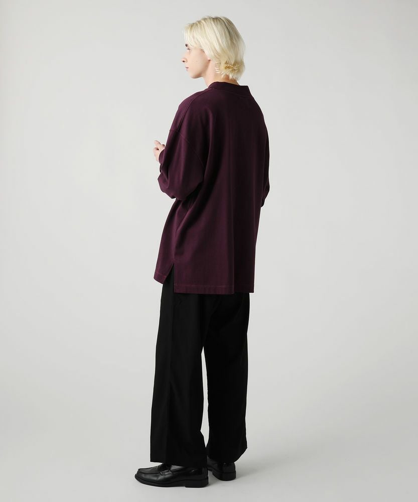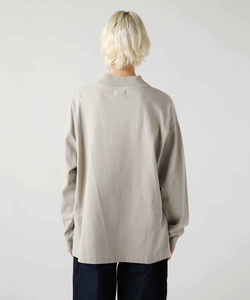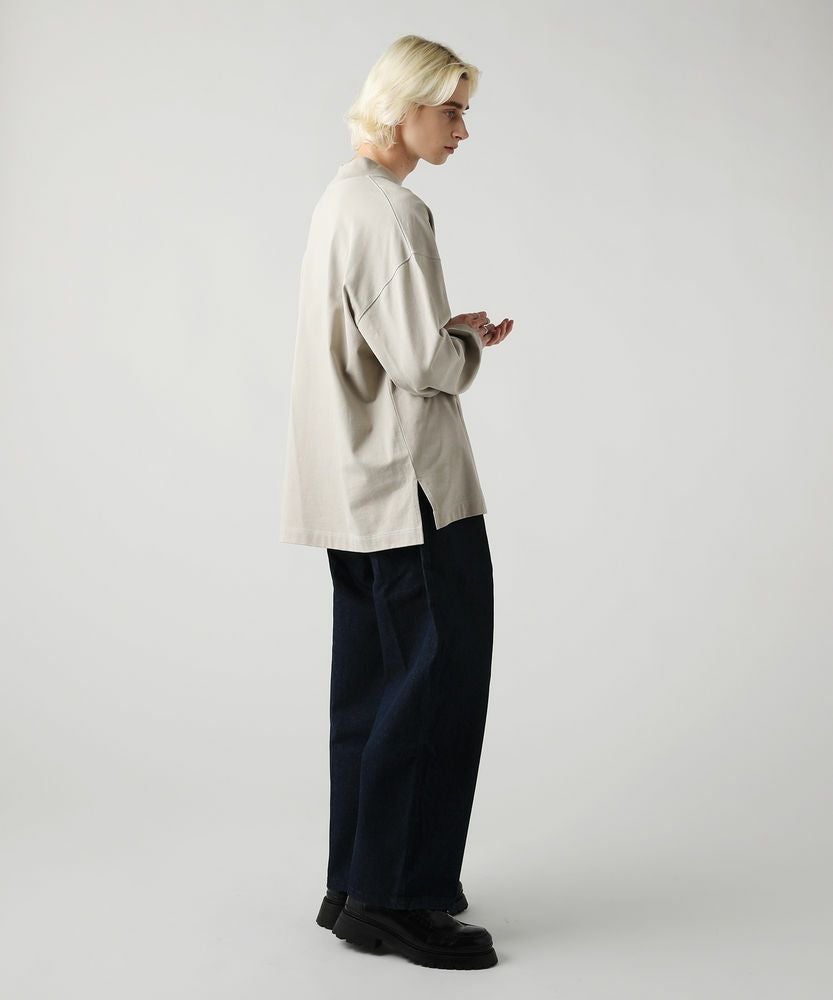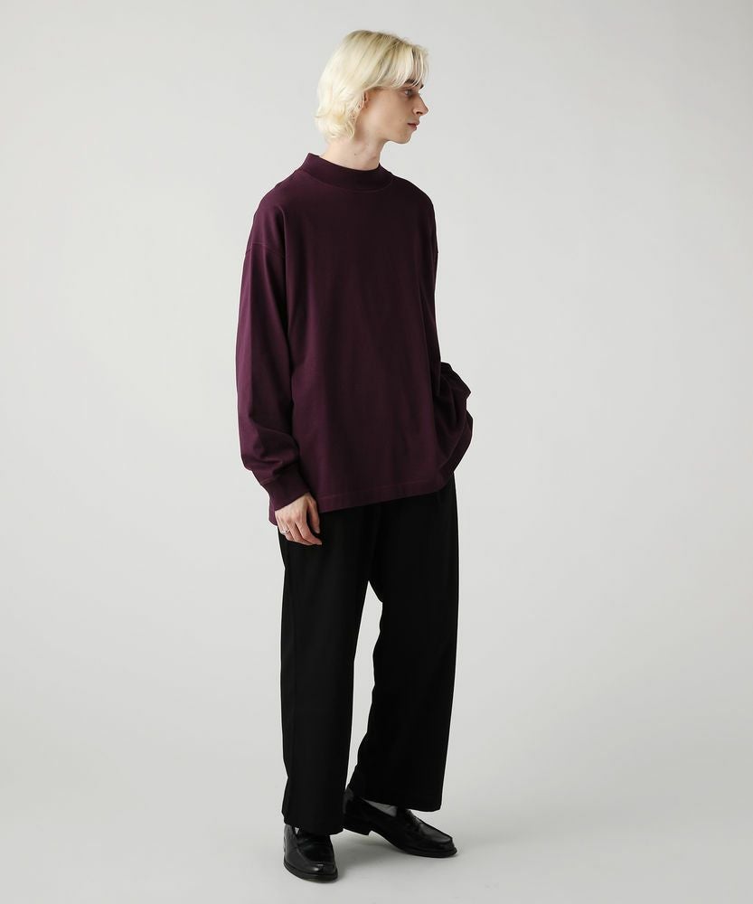 綿100%のMVS天竺を採用した、モックネックのプルオーバーです。飽きの来ないシンプルなデザインで、一枚でもおしゃれに着られるデイリーユースなアイテムです。オーバーサイズシルエットをベースに、前後差のあるサイドスリットがアクセントになる一着。無駄を省いたシンプルなデザインながら、縫い目に3本針ステッチを入れてさり気なくデザイン性をプラスしております。