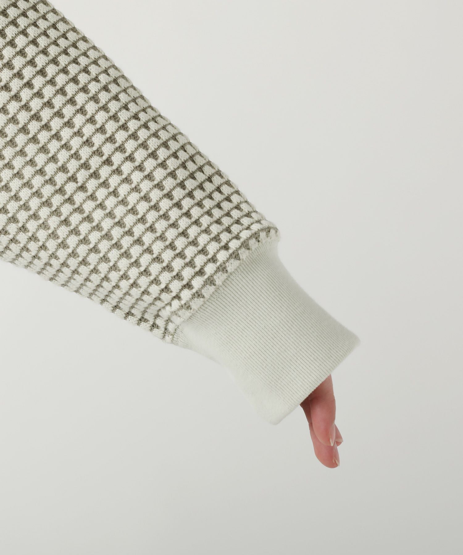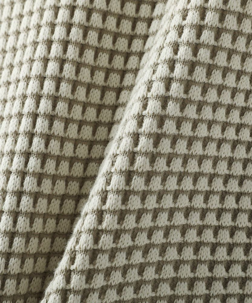 素材は綿とポリエステルの糸で編まれたワッフル生地を使用。2色の糸で編むことで、ワッフルニットの凹凸感をより立体的に見えるように表現しました。綿混紡のやわらかいタッチとニット素材の持つ伸縮性で着心地も抜群。