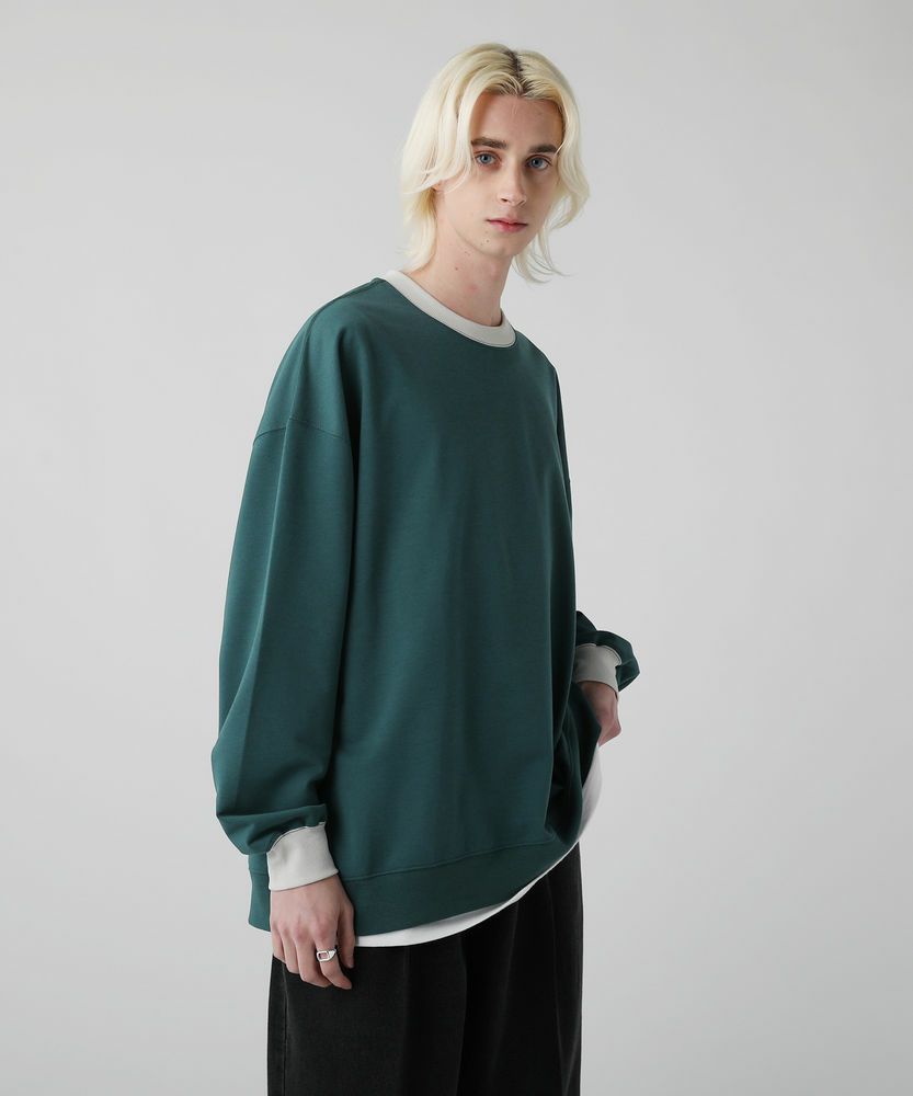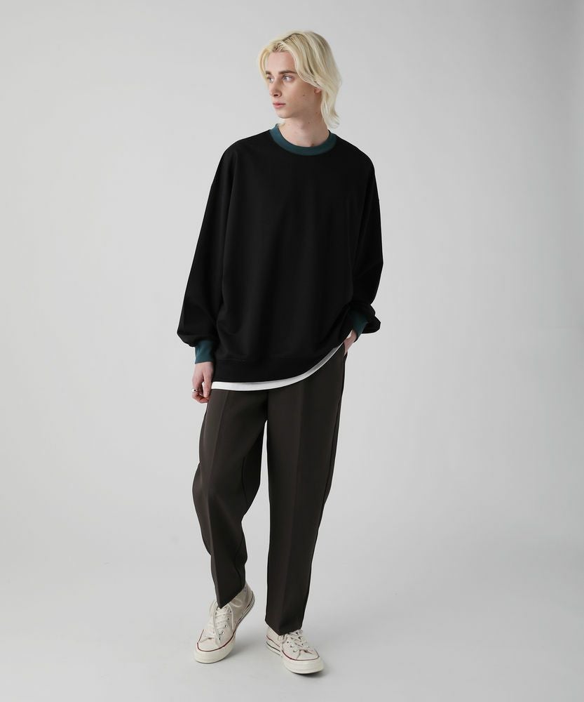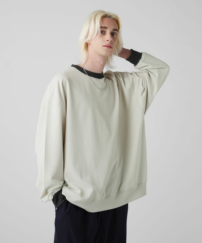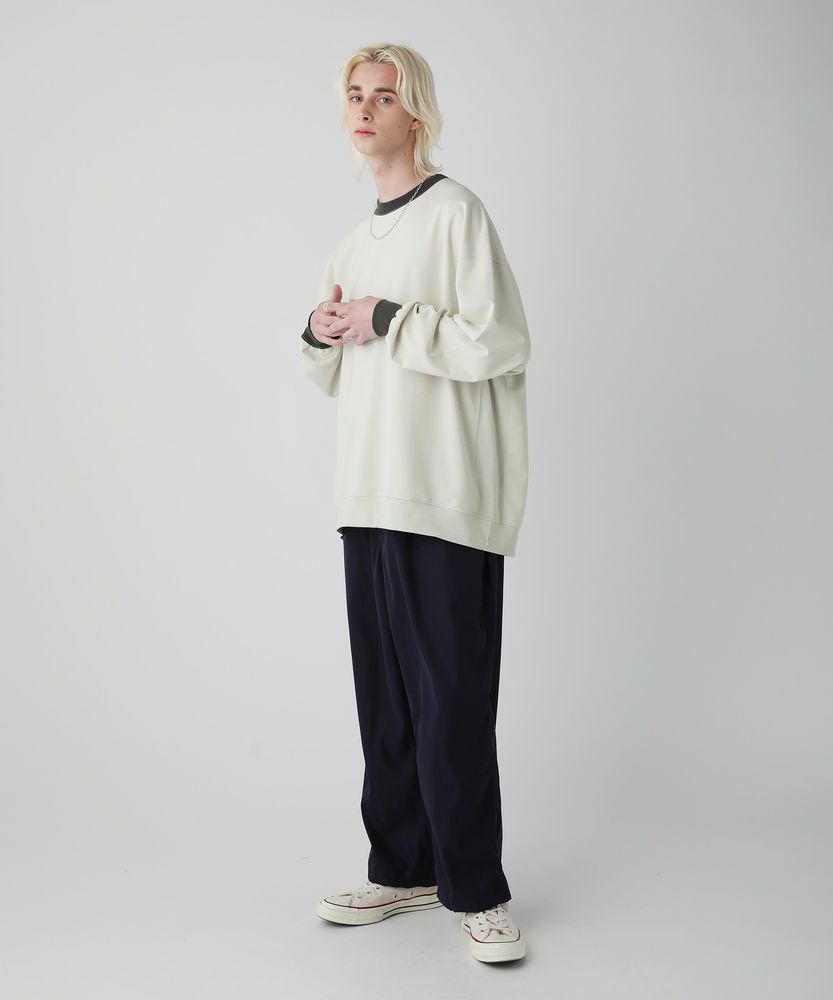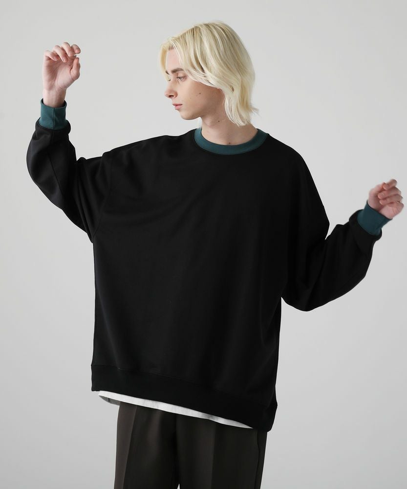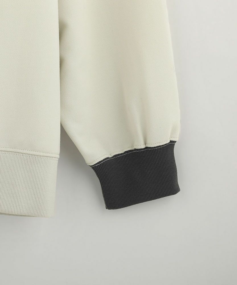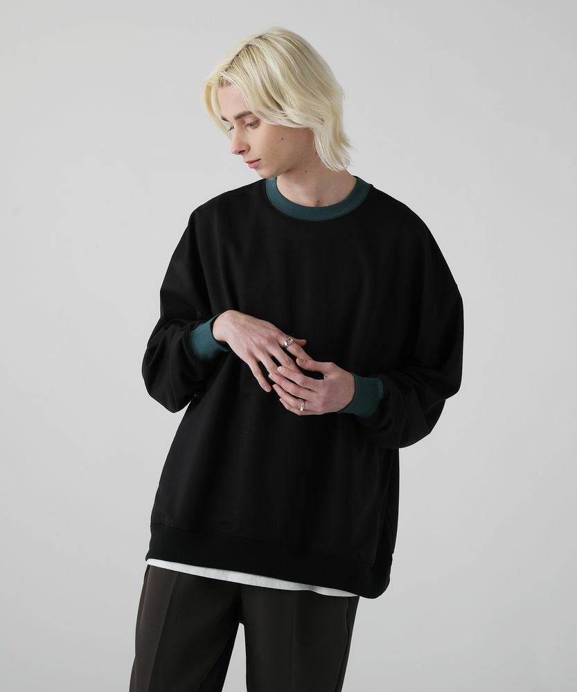 袖口と首元のリブ配色がアクセントになったトリムスウェットです。スポーティな印象のあるトリムウェアを旬のくすみカラーで配色することで、トレンド感のある一着に仕上げました。