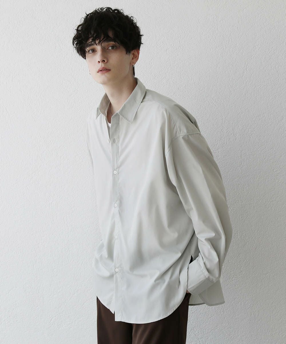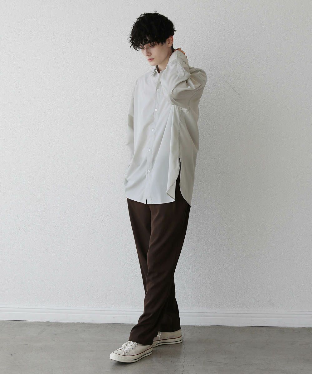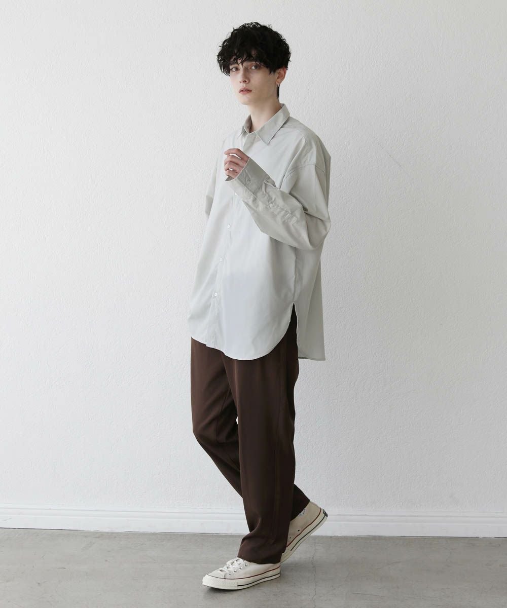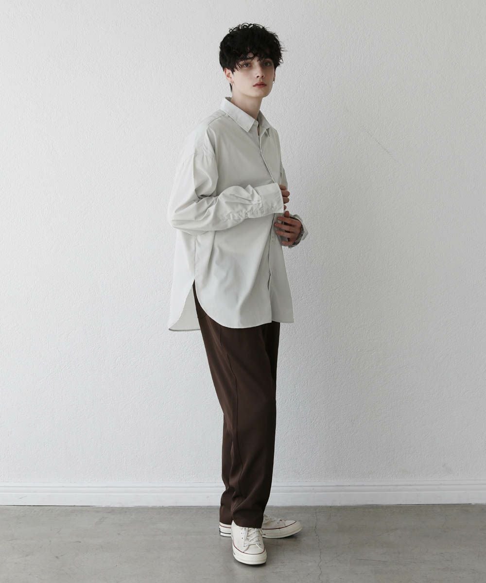 キレイめなブロードシャツ、ボトムスのテーパード仕様によってゆったりとしたコーディネートをバランスをとっています。