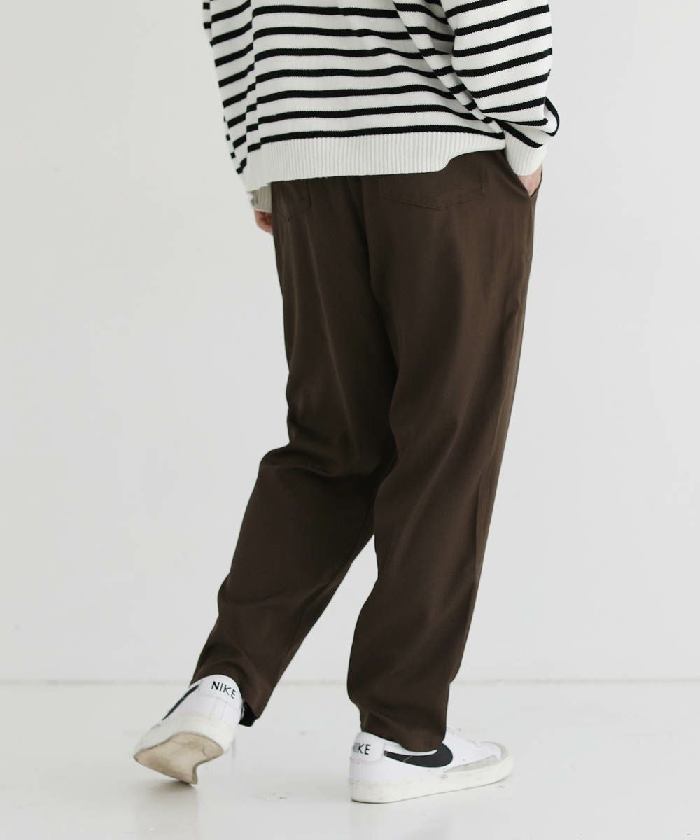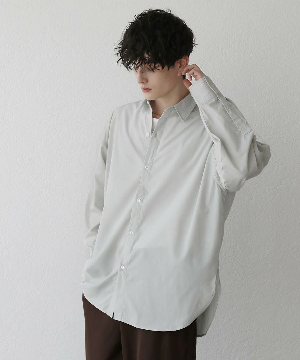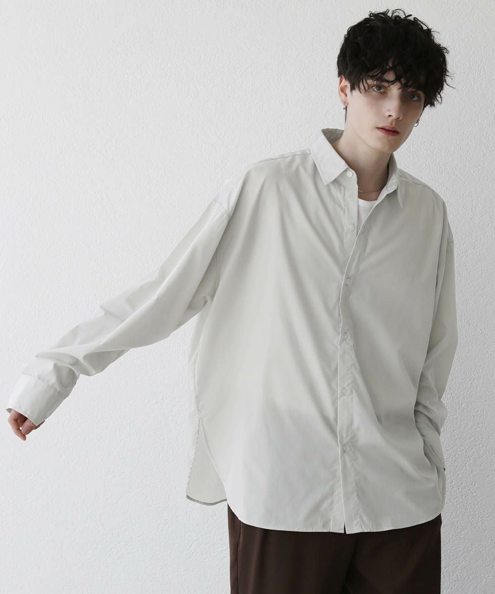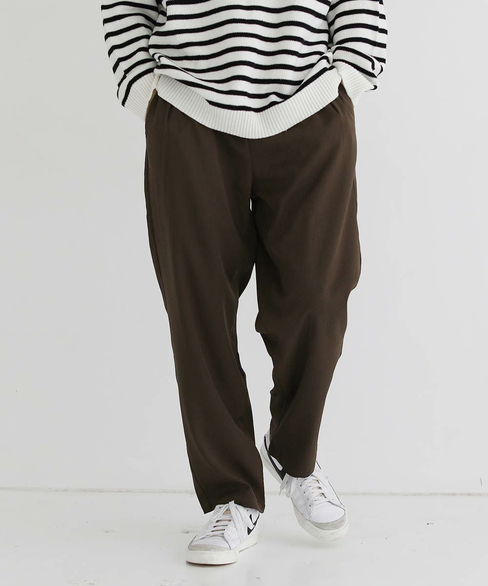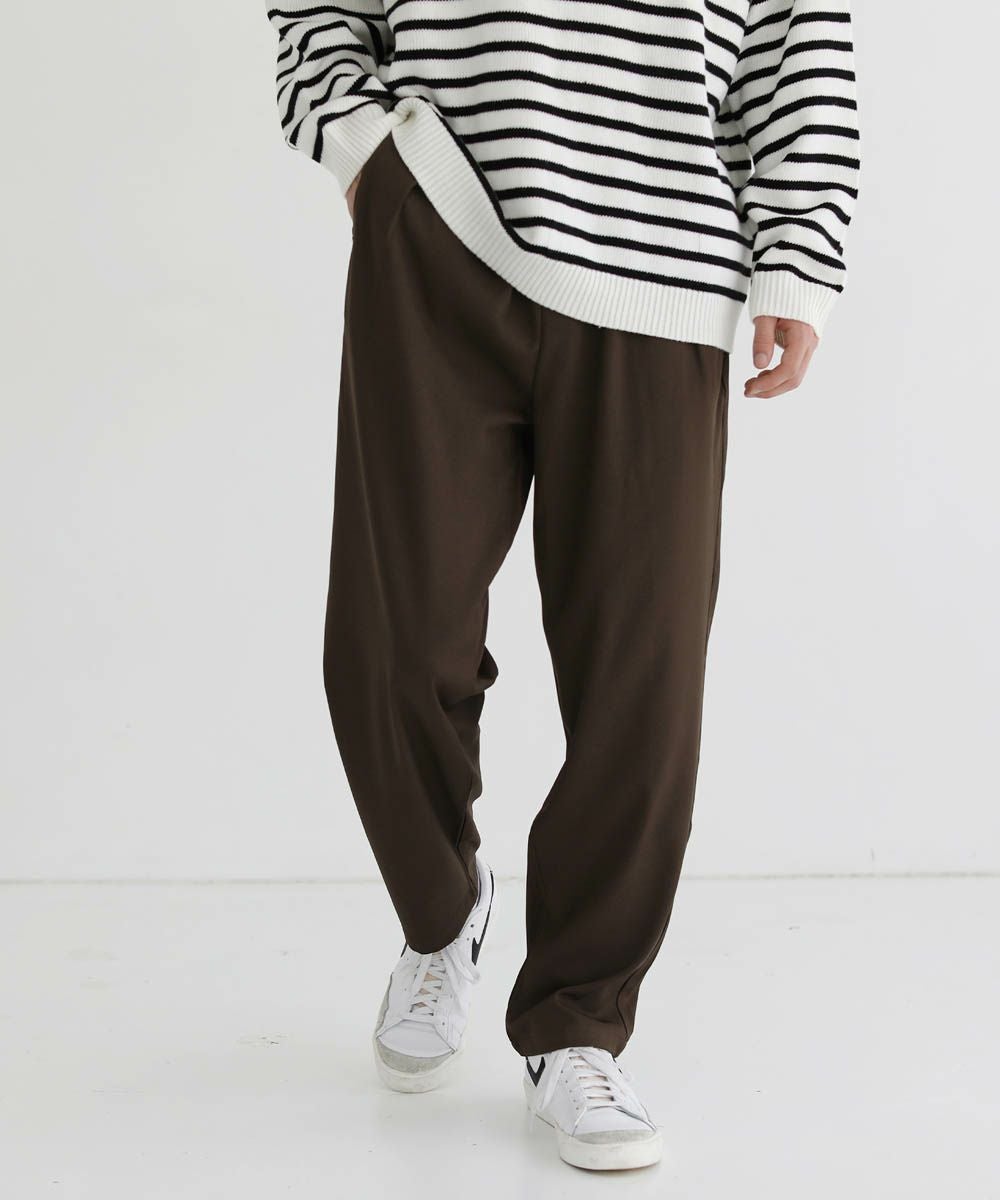 キレイめなブロードシャツ、ボトムスのテーパード仕様によってゆったりとしたコーディネートをバランスをとっています。