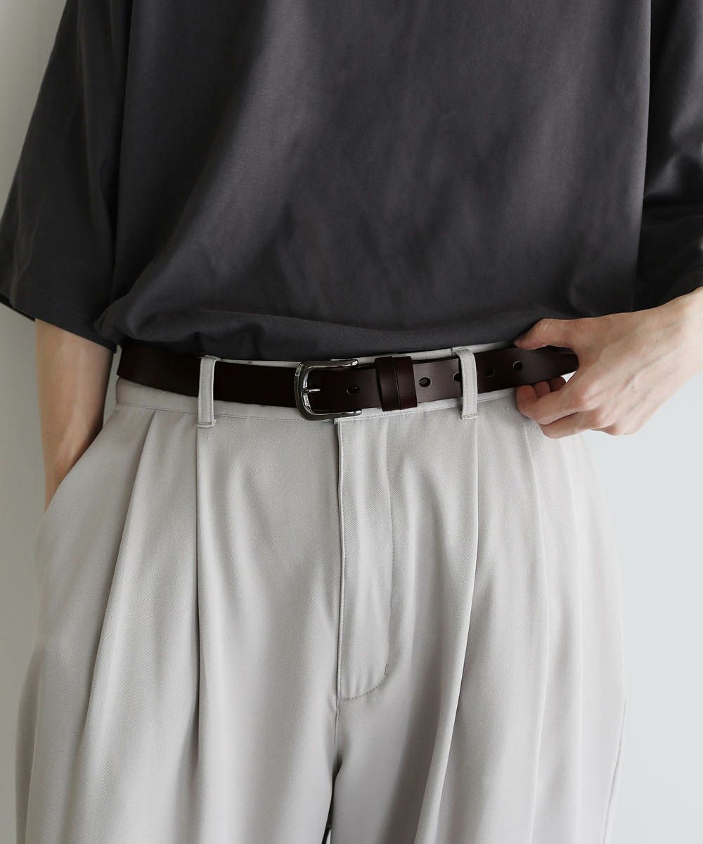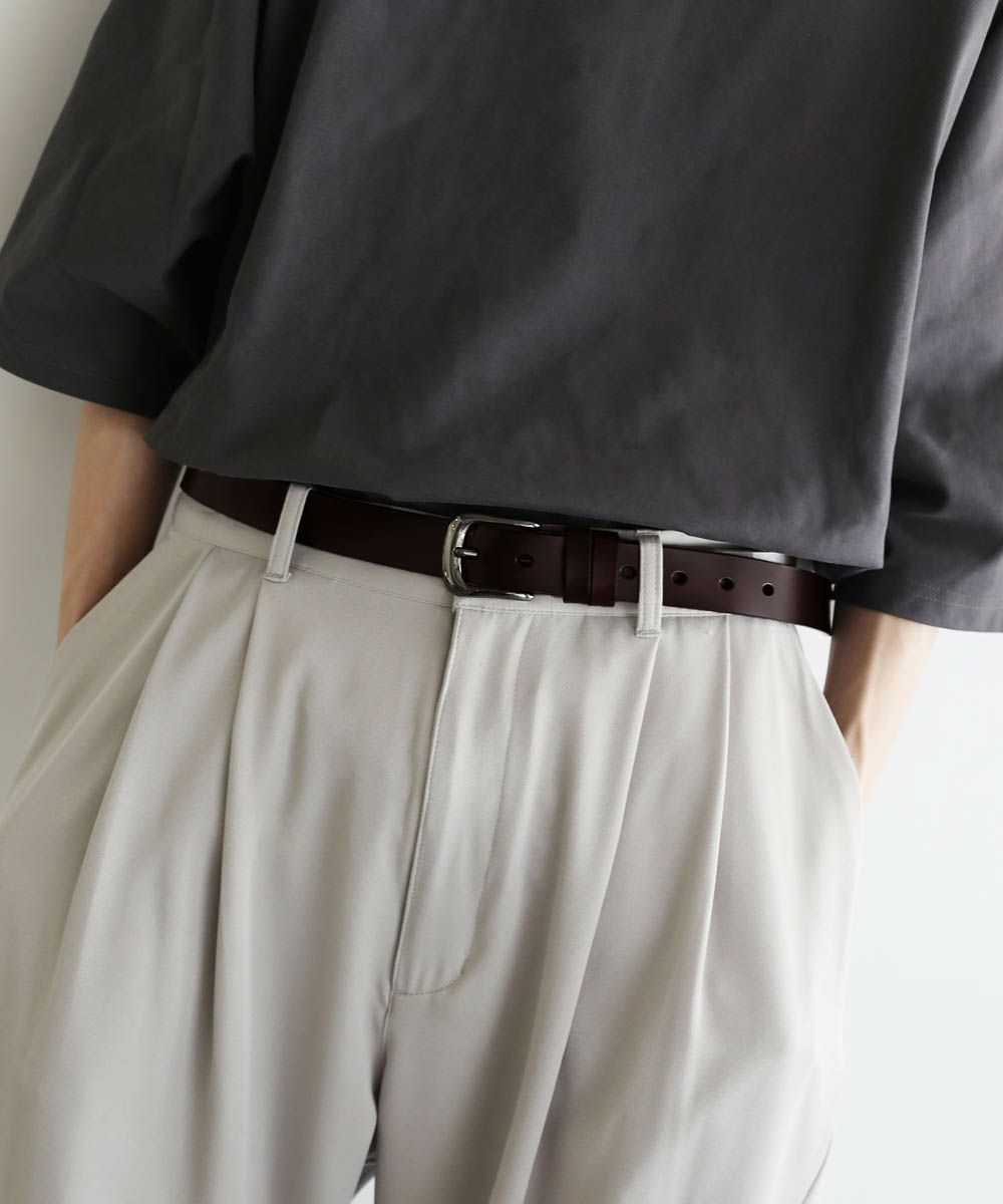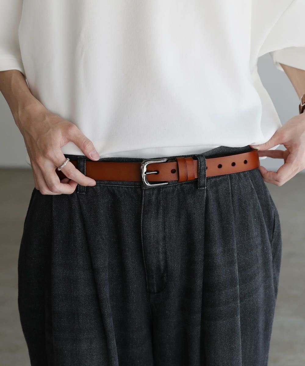 ベーシックで合わせるアイテムを選ばないレザーベルト。シンプルなデザインにシルバーバックルがアクセントに。素材には、ほど良い厚みの牛床革を使用しています。表面はコーティング加工されており、お手入れが簡単で汚れや水、乾燥に強いのが特長です。
