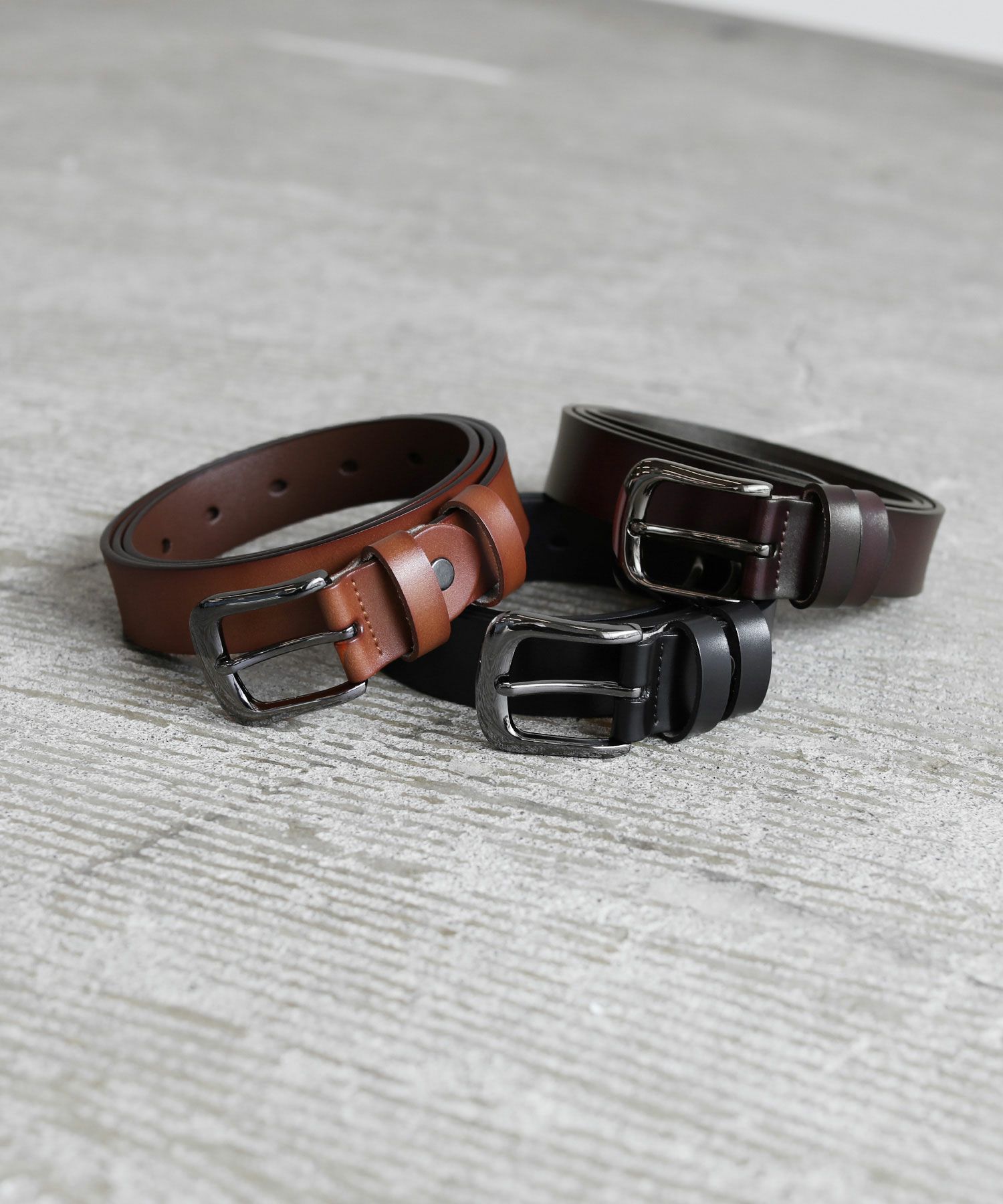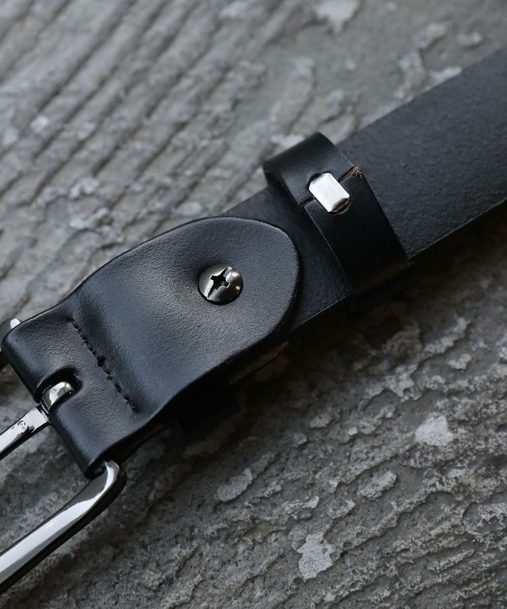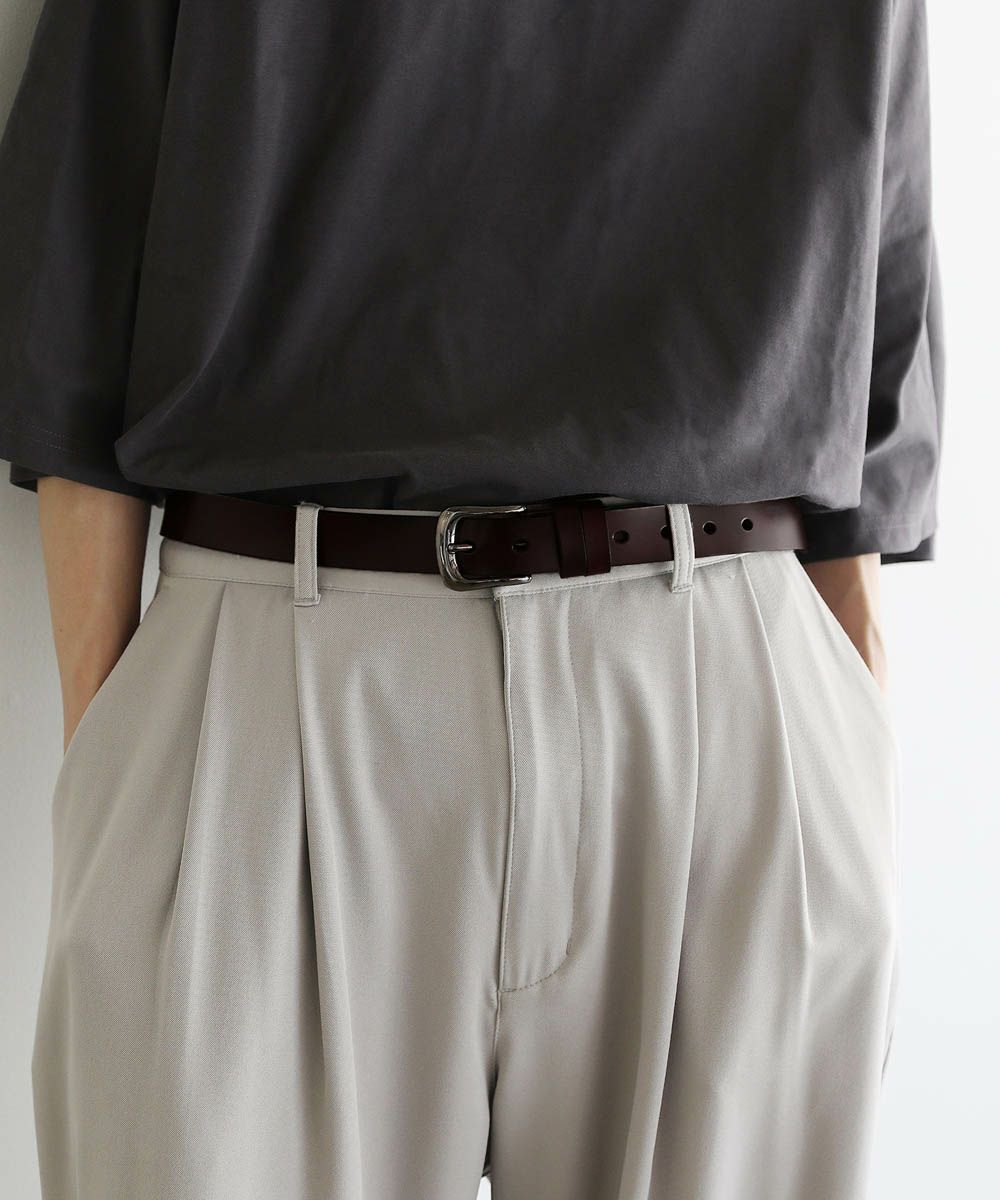 ベーシックで合わせるアイテムを選ばないレザーベルト。シンプルなデザインにシルバーバックルがアクセントに。素材には、ほど良い厚みの牛床革を使用しています。表面はコーティング加工されており、お手入れが簡単で汚れや水、乾燥に強いのが特長です。