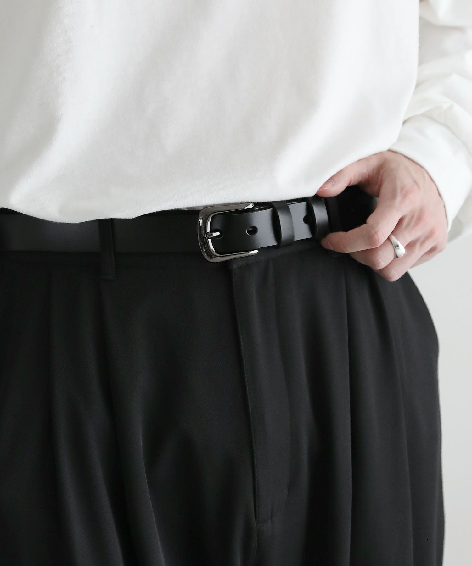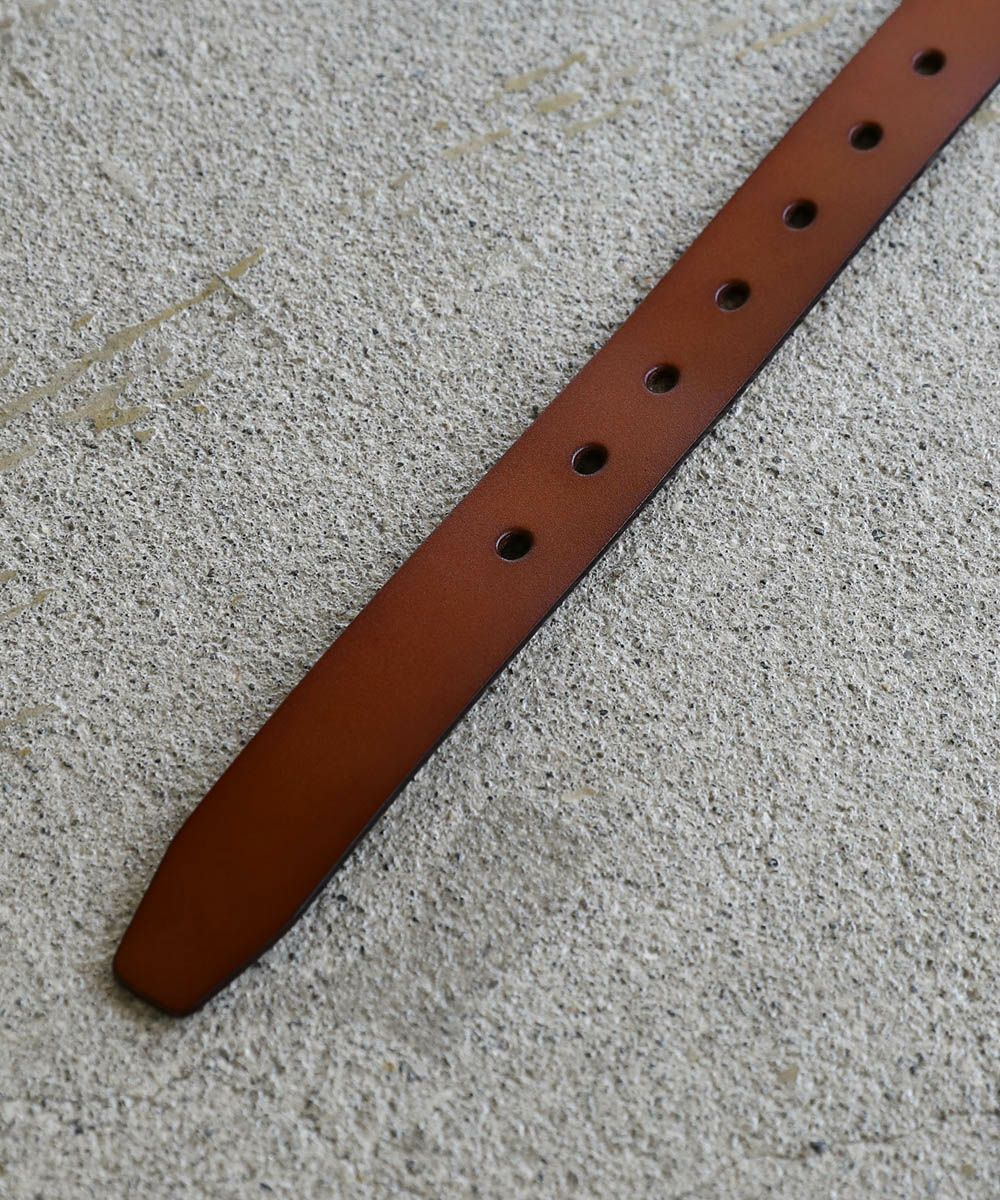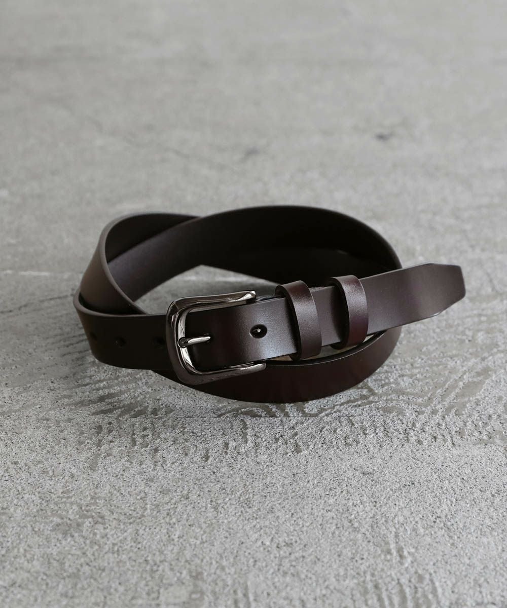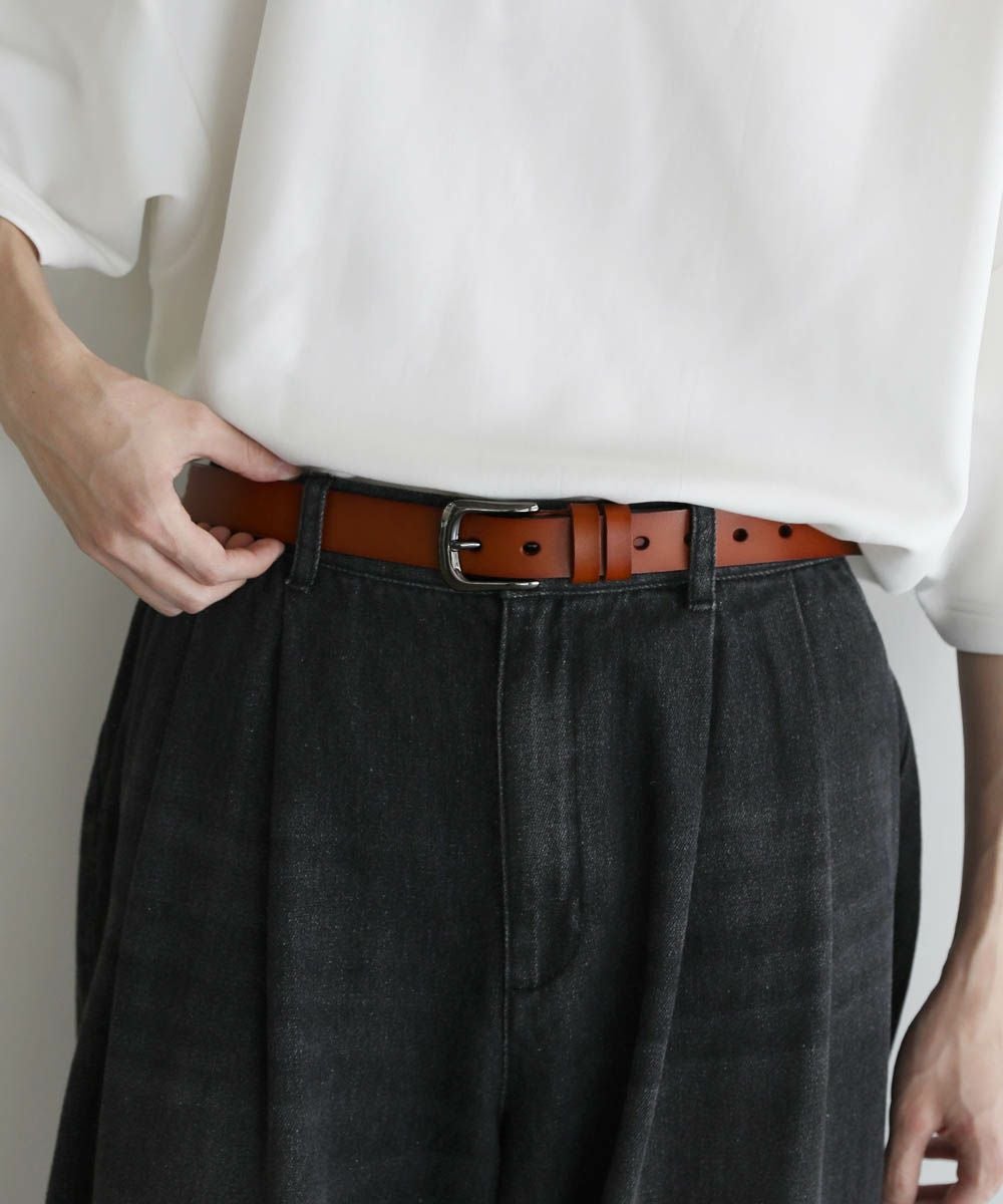 ベーシックで合わせるアイテムを選ばないレザーベルト。シンプルなデザインにシルバーバックルがアクセントに。素材には、ほど良い厚みの牛床革を使用しています。表面はコーティング加工されており、お手入れが簡単で汚れや水、乾燥に強いのが特長です。