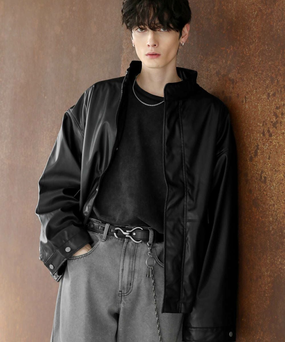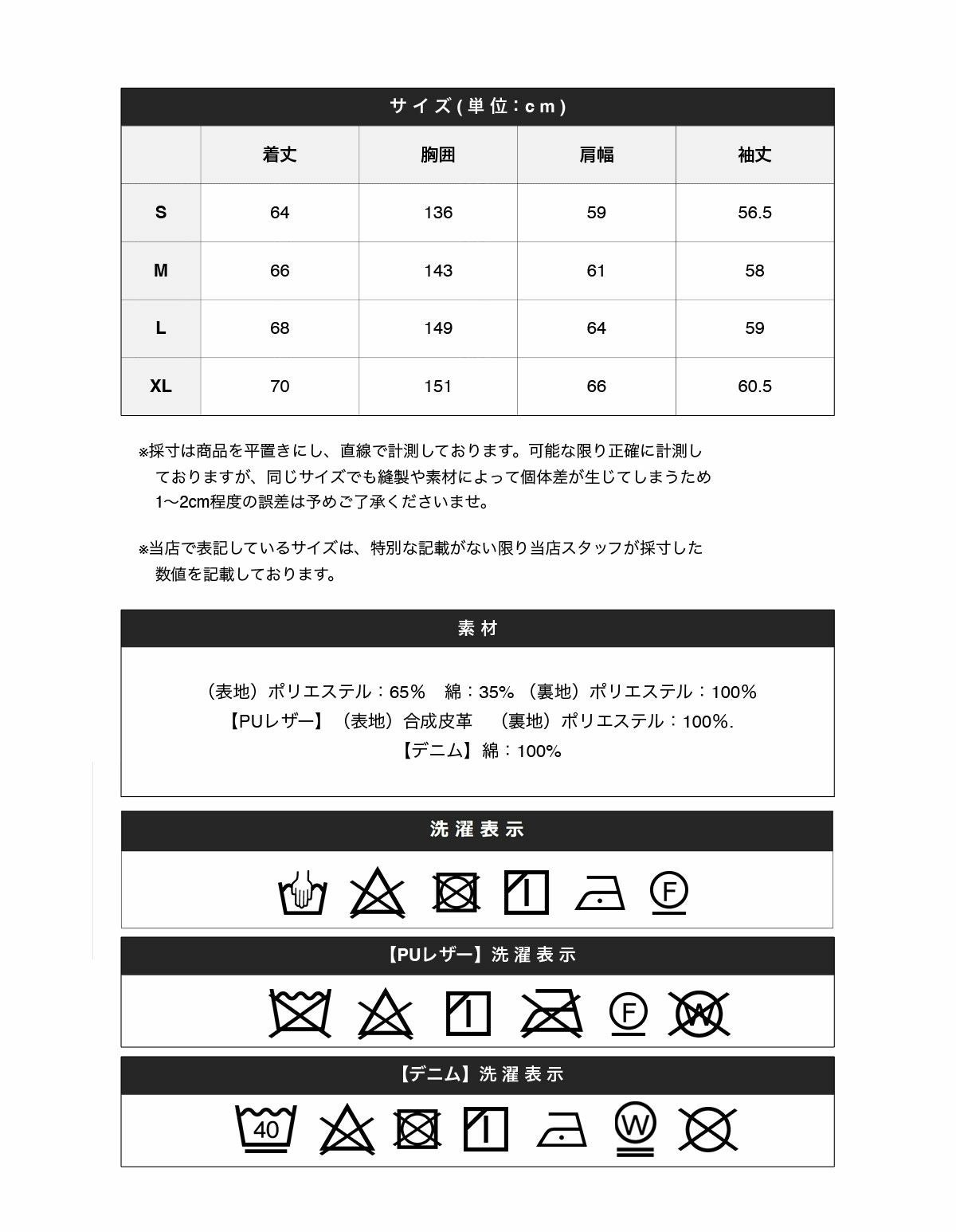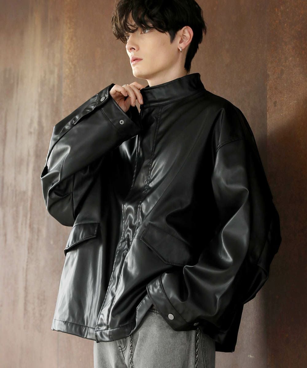 合成皮革素材は微光沢があり、しっかりとした厚みのある生地感。本革に比べて入念なお手入れが必要なく、気軽に羽織っていただけます。また風を通しにくいので防寒性にも優れています。