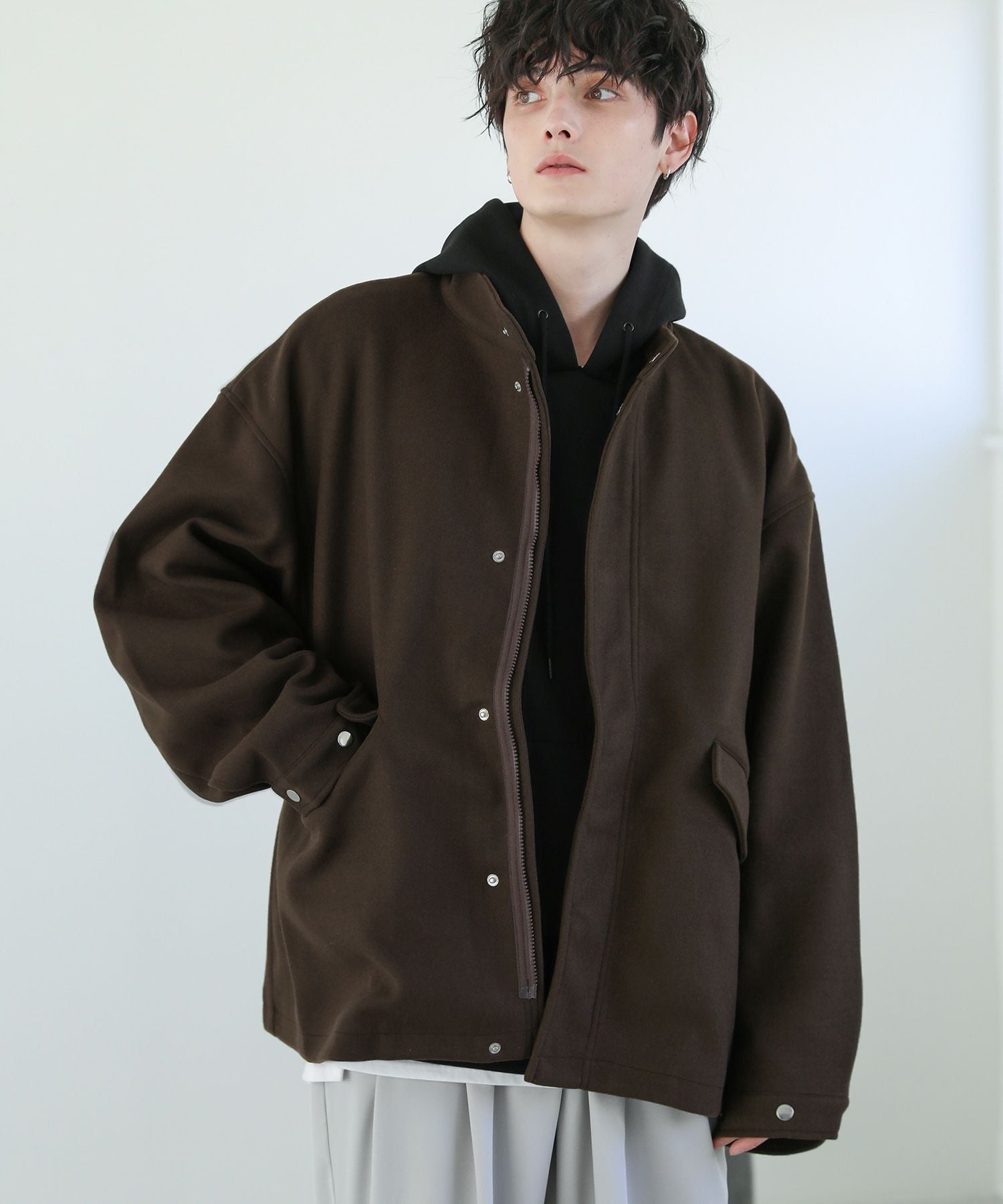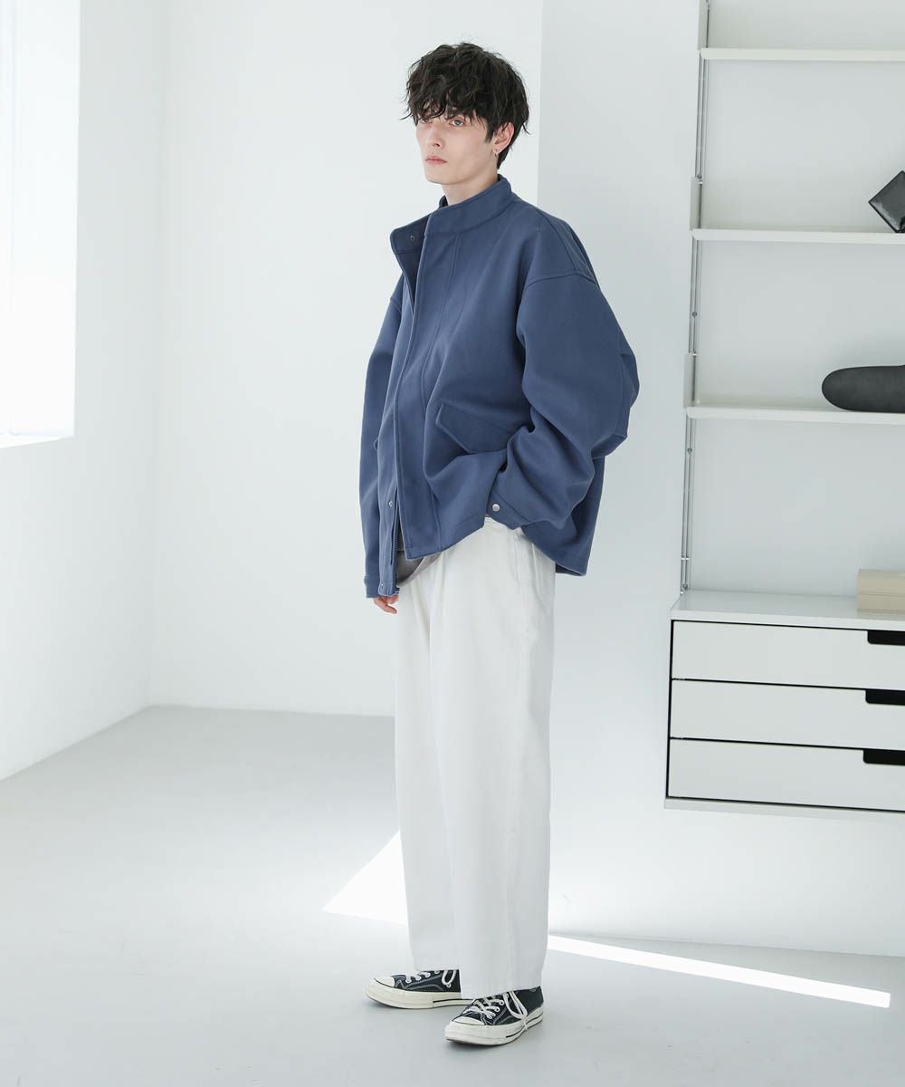 ショート丈のブルゾンなので、ボトムを選ばずデイリーに活躍します。ワイドパンツやバギーパンツなど太めボトムともバランスの取りやすい丈感。また身幅と袖にゆとりがあり、オーバーサイズのスウェットやニットも着込めます。インナーを調節することで晩秋から春先にかけて着回しの効くアイテムです。