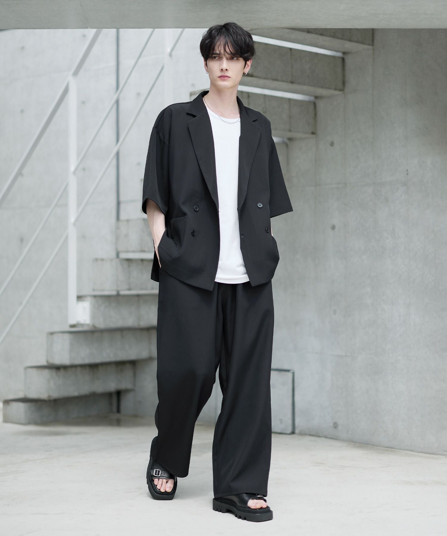 半袖のダブルテーラードシャツとワイドバギーパンツの2点がセットになった、春夏用セットアップ。リラックス感のあるサイジンングが今っぽく、ラフさと上品さを兼ね備えています。セットで着用した時にベストなバランスで着こなせるように計算されたデザインながら、単品使いでも活躍するコストパフォーマンスに優れたアイテムです。