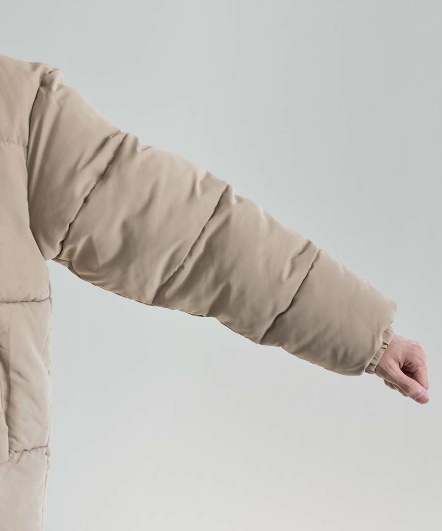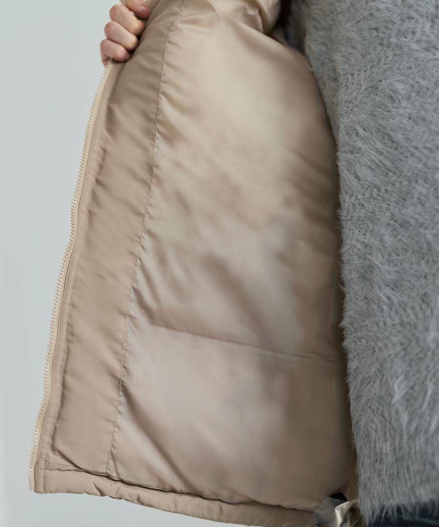 ポリエステル中綿入りで軽く暖かく、ボリューム感がありながらもストレスのない着心地です。