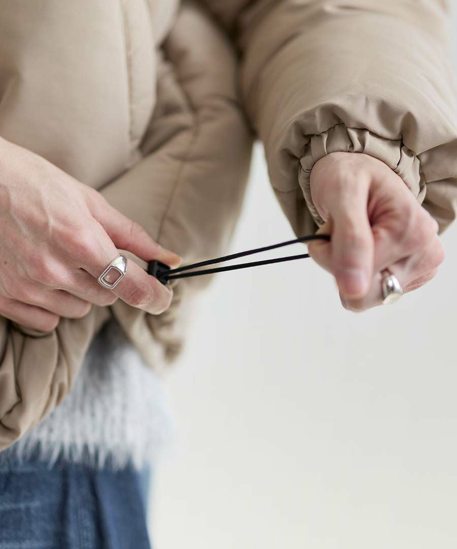 裾にはドローコードを配し、冷気の侵入を防ぎながらシルエットの調整も可能。
