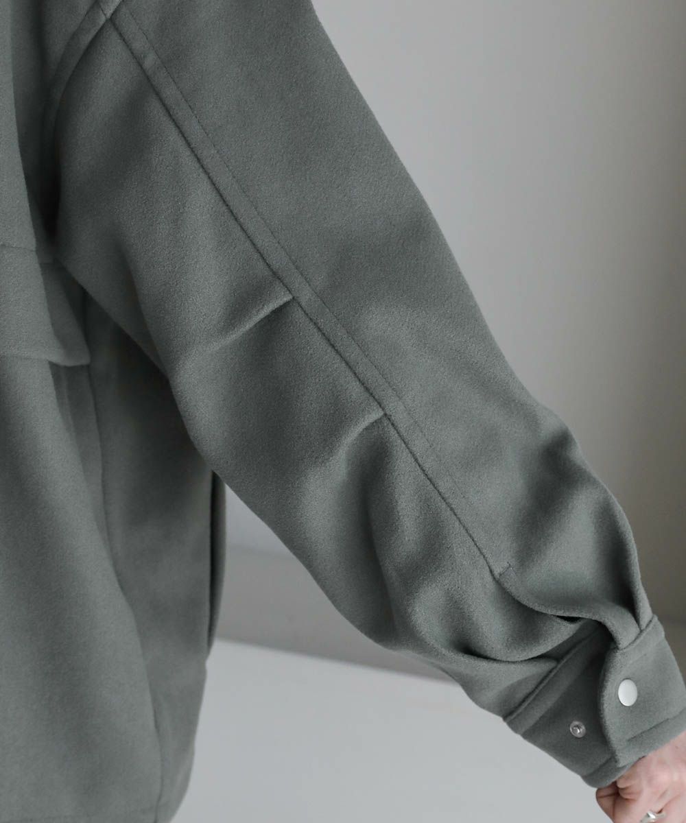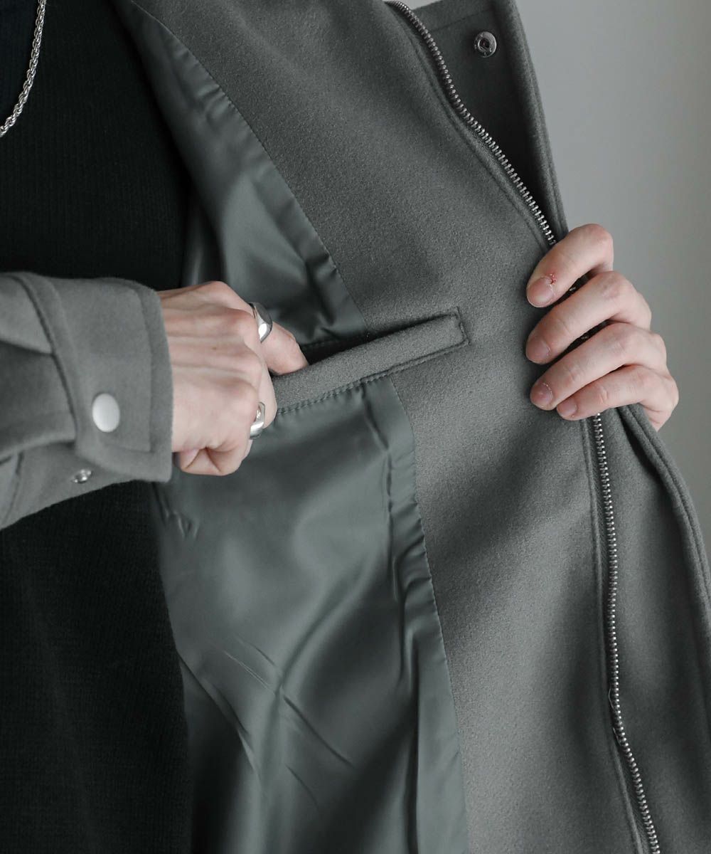 肘部分にタックを入れたデザインとバックは切り替えになっており、立体感のあるシルエット。またフロントはジップ仕様&スナップボタン付き。フロントを閉めるとボタンの見えないフラップ仕様なのですっきりと都会的な印象で着こなせます。