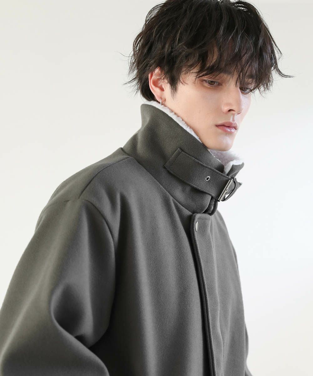 メルトンと裏ボアと組み合わせで暖かく着用できる冬アウター。ビッグシルエット&襟部分のボア素材と裾のベルトがアクセントになり、1枚で旬な着こなしを演出します。襟はベルトを留めることでハイネックデザインとしても楽しめる2WAY仕様。フロントは比翼仕立てになっているため、隙間風を防いで防寒性にも優れています。1枚でトレンドの着こなしに魅せてくれる、主役感のあるアウターです。