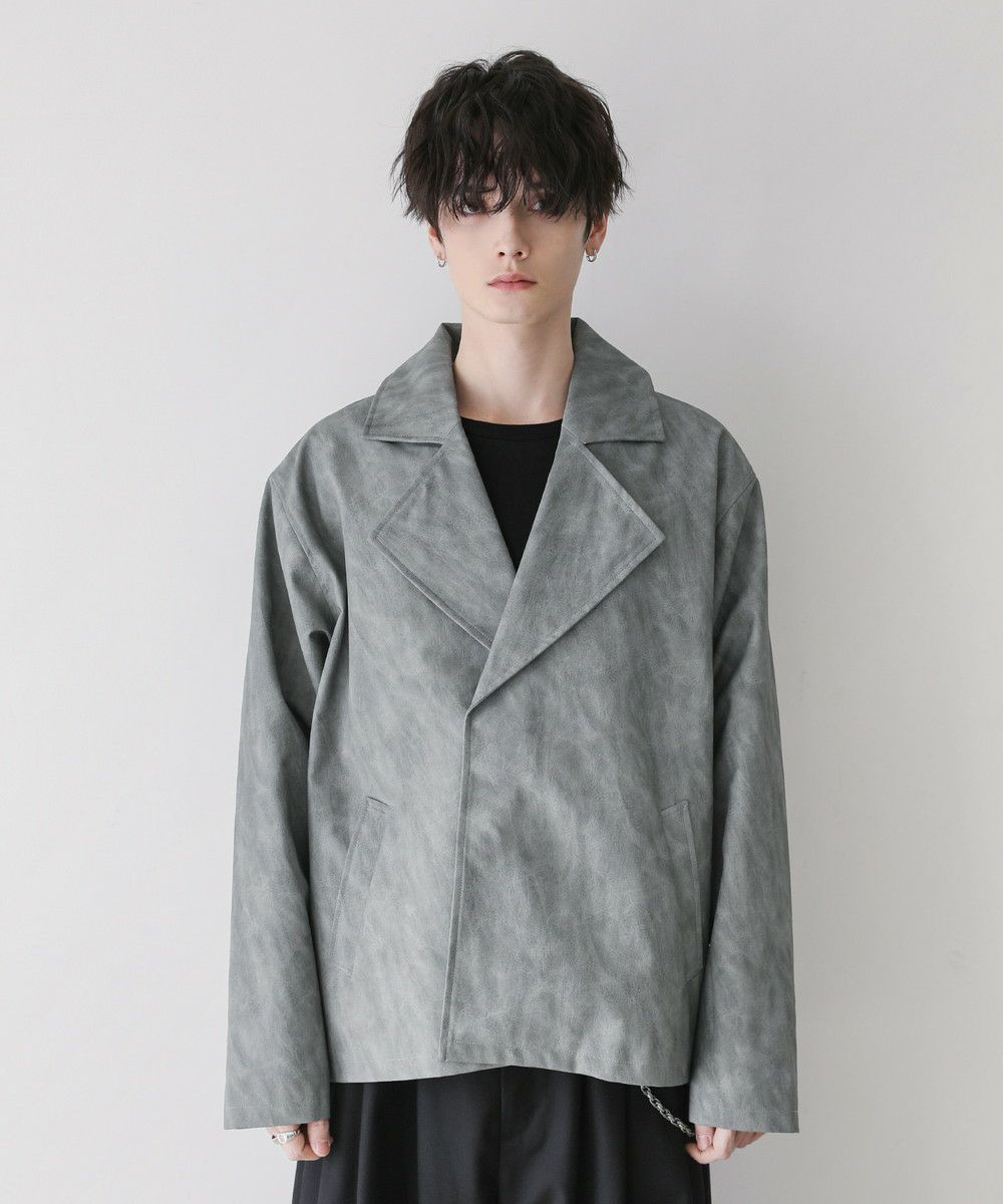 雰囲気のあるビンテージ加工を施した、PU合皮ショートブルゾン。ダブルブレスト仕様で、フロントは閉じるとボタンが隠れるスマートなデザインとなっています。ワイドな身幅とドロップショルダーを採用し、トレンド感のあるシルエットに。ボリュームのある袖はダーツを入れることで立体感があり、バックシルエットも決まる1着です。カラーは落ち着きのあるブラックとグレーの2色展開。着回しやすく、コーデの幅が広がるおすすめのアウターです。