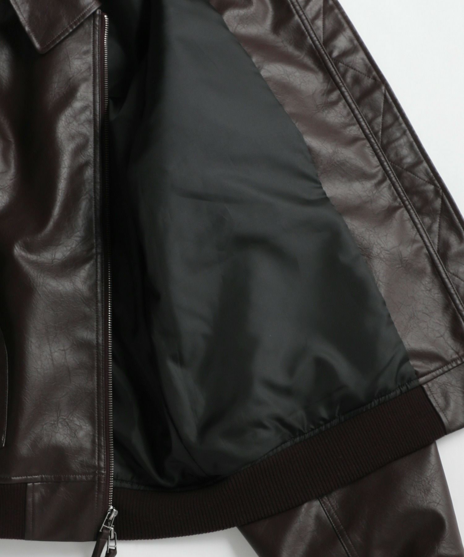 本物のレザーのようなシボ感を表現した合成皮革を使用。光沢感を抑えたマットな質感にこだわり、落ち着いた印象を醸します。適度な中綿量に調整し、保温性をキープしつつも秋から春先までロングシーズン着用可能な仕様に仕上げています。