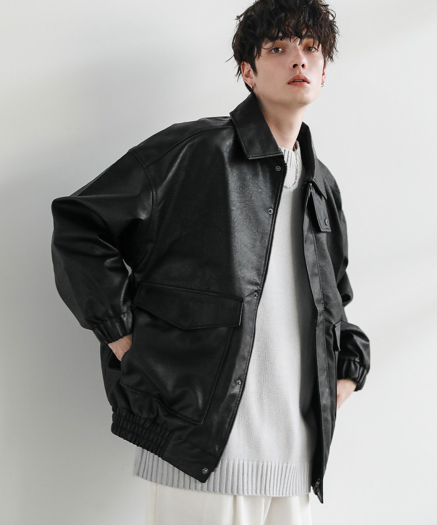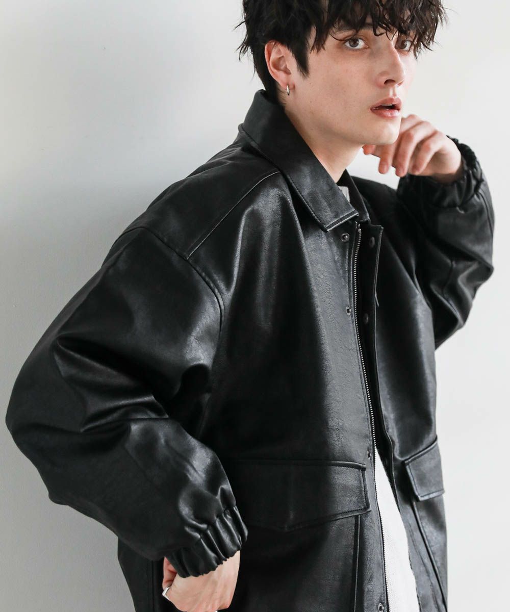 米陸軍航空隊のシンボルであるフライトジャケット、A-2をトレンドに落とし込んだ1着。リアルレザーの質感にこだわり、エコレザーながら本革のようなシボ感とマットな質感が魅力です。オーバーサイズシルエットとドロップショルダーで現代風にアレンジし、スタイリングしやすい一着に仕上げました。フロントの大きめなフラップポケットやチンストラップなどミリタリーのディティールがアクセントに。フロントはジップとスナップボタンの比翼仕立てになっており、ジップを閉めると隙間風の侵入を防いで防寒性を高めてくれます。秋から春先まで活躍するおすすめのアウターです。