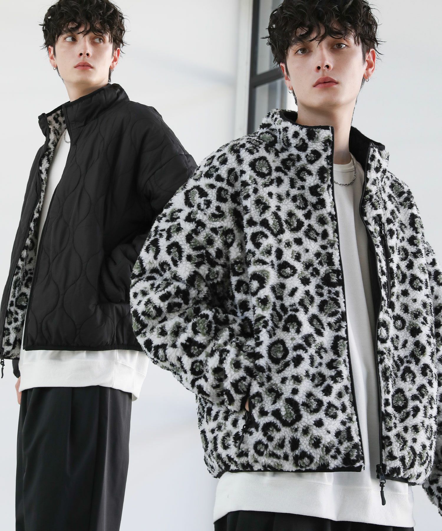 ボアとキルティングのリバーシブルで着用できるジャケット。ビッグシルエットで厚手のインナーも着込め、また中綿入りで寒い時期も活躍するアイテムです。袖、裾はパイピング仕様になっているので隙間風が入りにくく暖かな着心地。ボアとキルティング、どちらの面もサイドポケット付きで実用性の高い1着です。定番のベージュ、ブラックを始め、落ち着いた印象のネイビーとグレー、冬の着こなしを明るくするアイボリー、着こなしのメインになるレオパード柄のブラックその他を加えた6カラー展開。軽い着心地で暖かく、またその日の気分やスタイリングで2パターンの着こなしを楽しめるおすすめのアウターです。