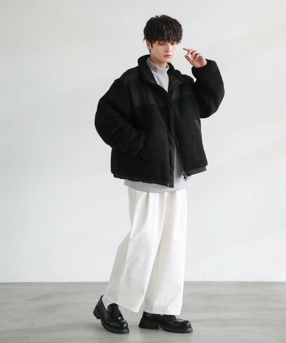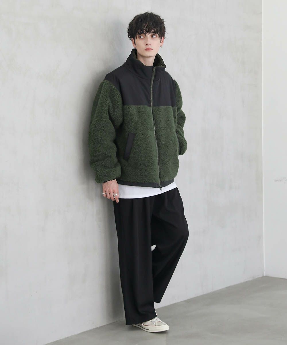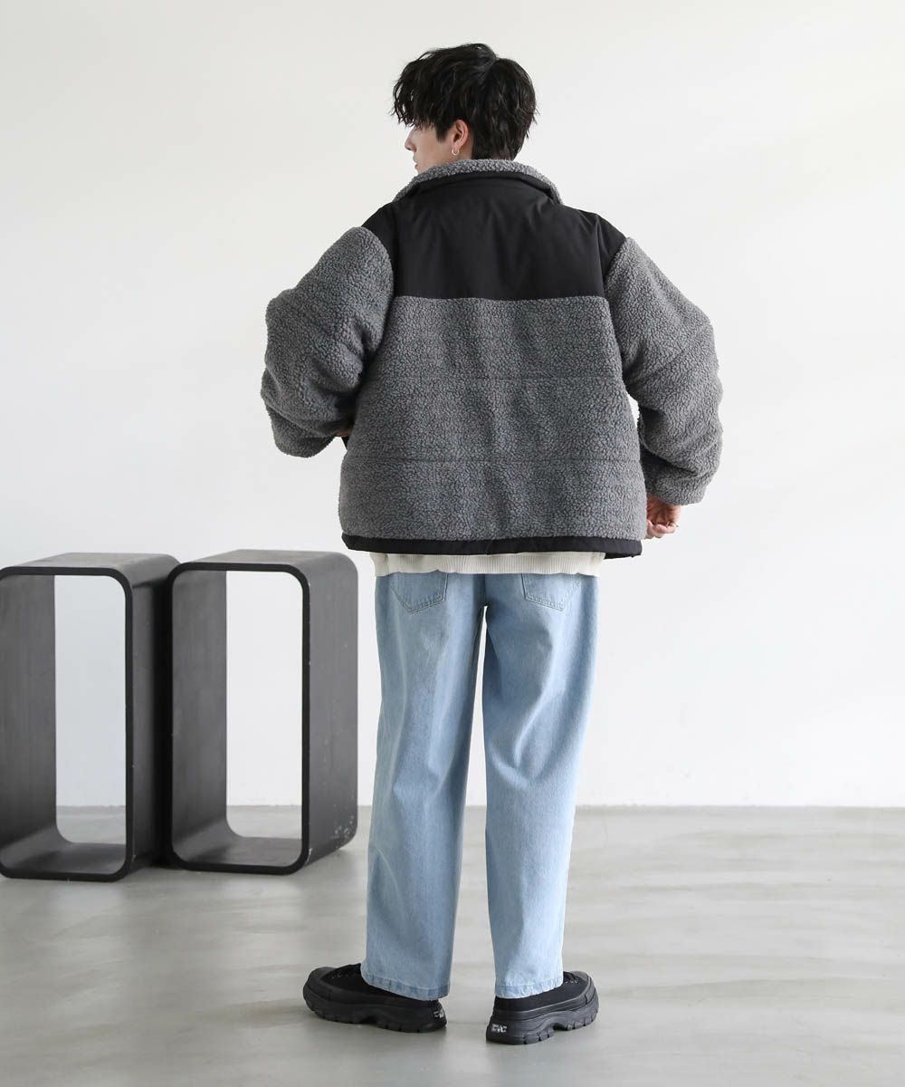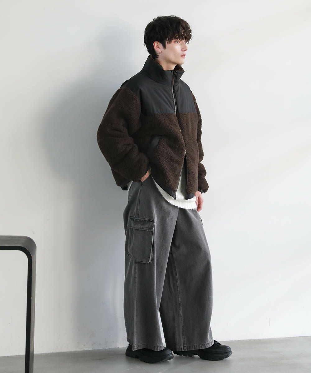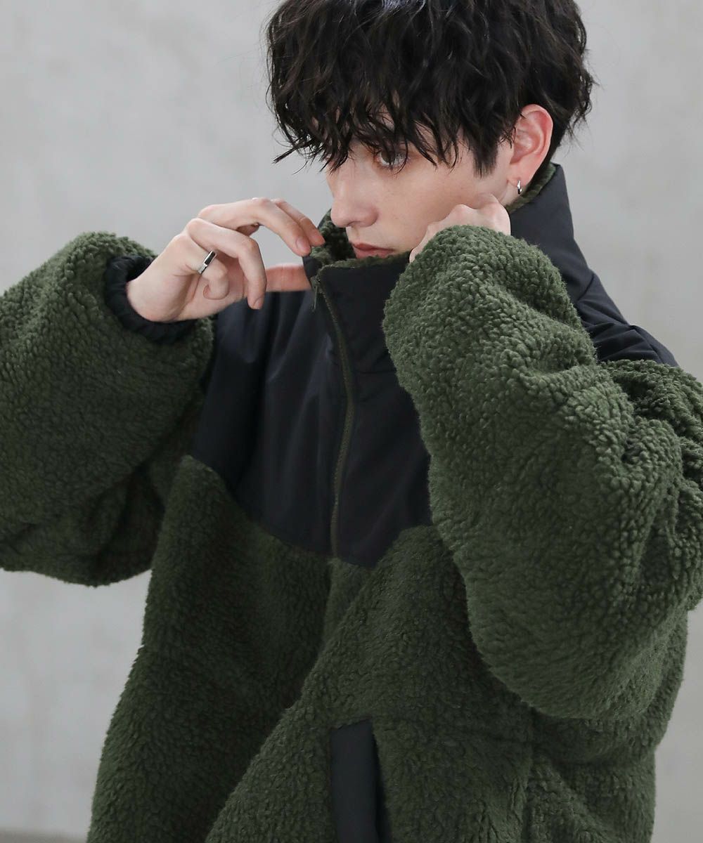 ビッグシルエットが目を惹くボア切り替えジップジャケット。ボリューム感を持たせた厚手の作りになっており、寒い季節に活躍する暖かな着心地のアイテム。暖かなボアと、上半身・袖口・ポケット口・裾の素材切替えが印象的なデザインです。今っぽさのあるルーズシルエットで、インナーにボリュームのあるニットやパーカーと合わせてもゆったり着こなせます。裾部分はドローコードで調節が可能なので、着こなしにバリエーションを持たせるだけでなく、防寒性も抜群。どんなアイテムにも合わせ出やすいベーシックな7色のカラーをご用意しました。