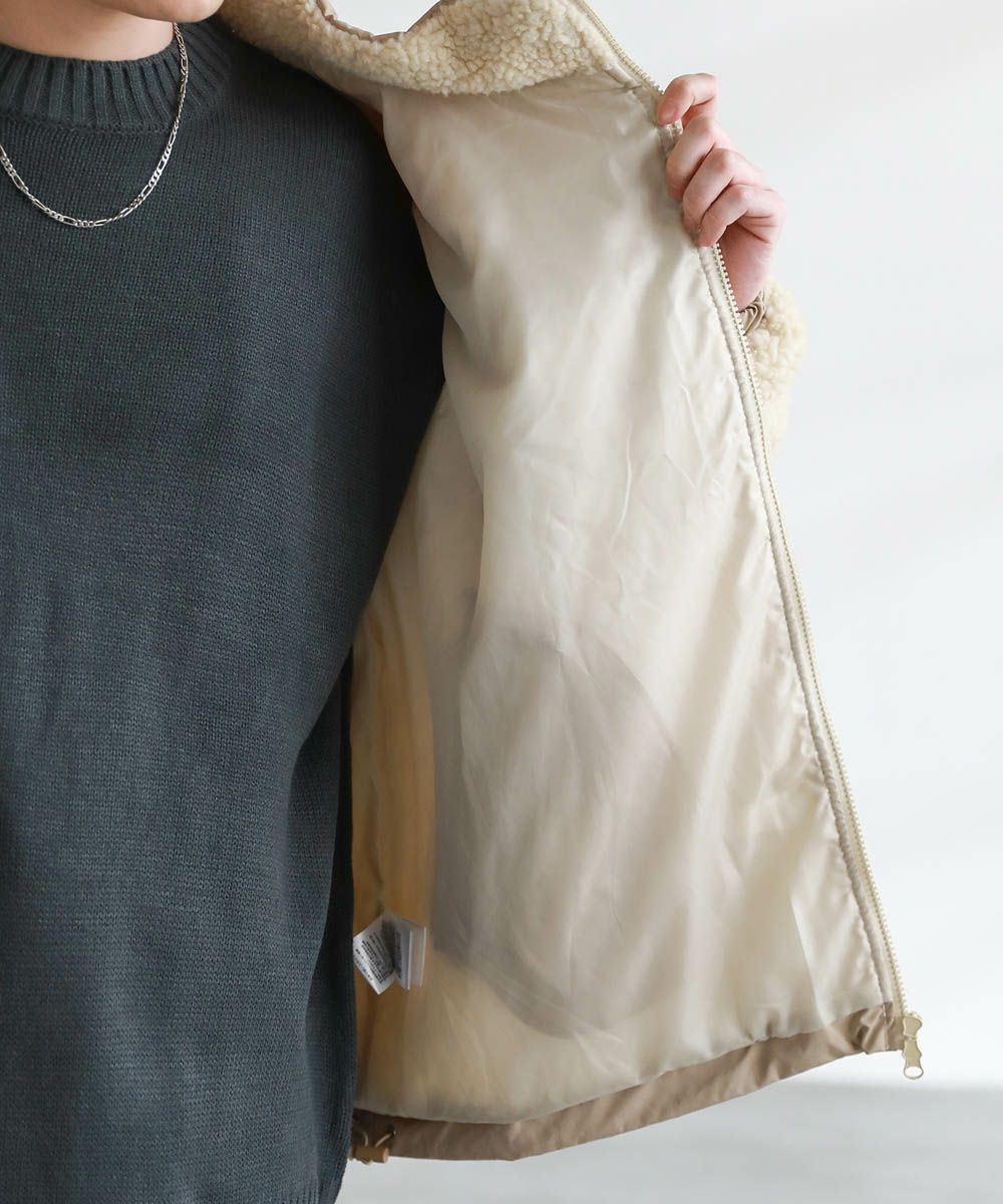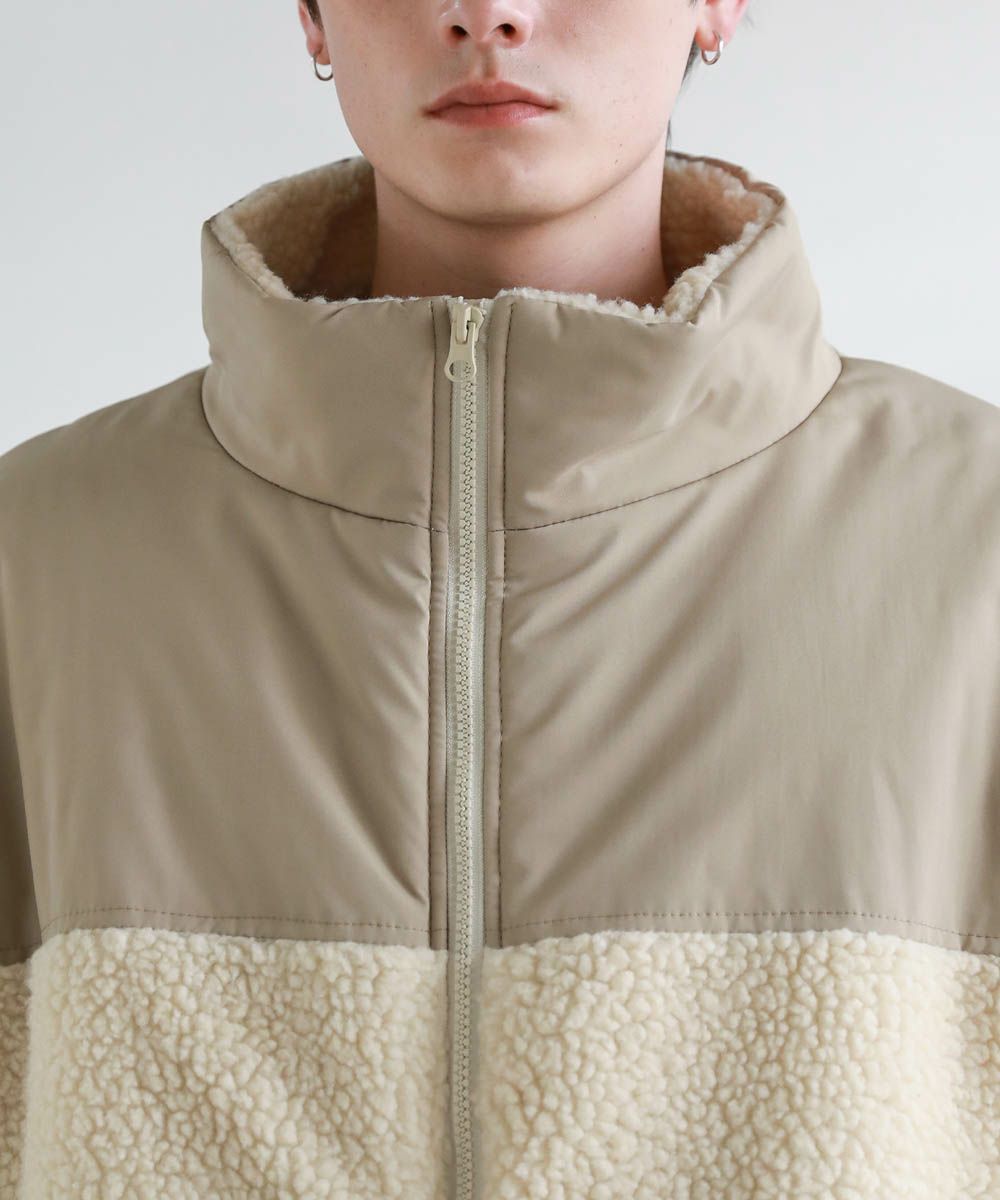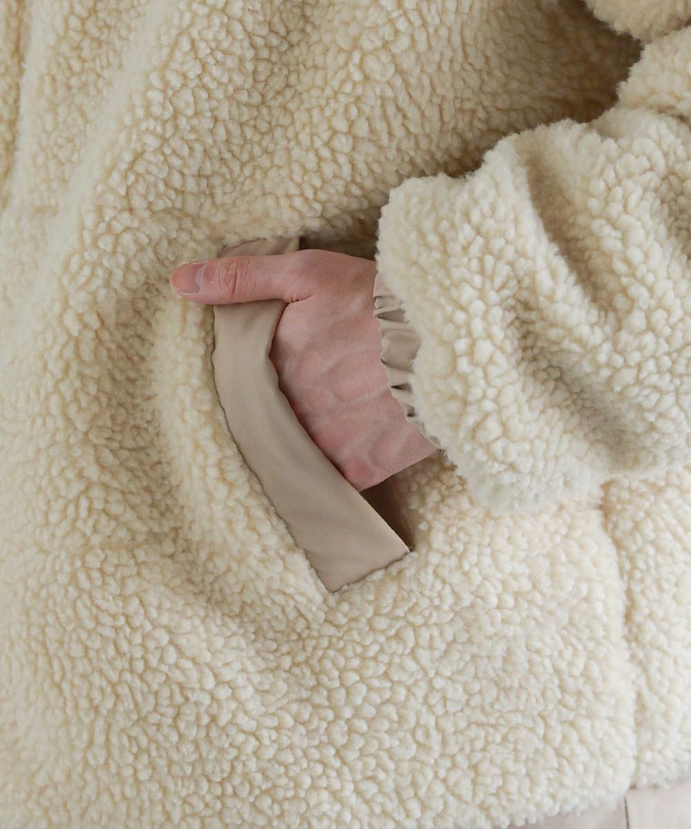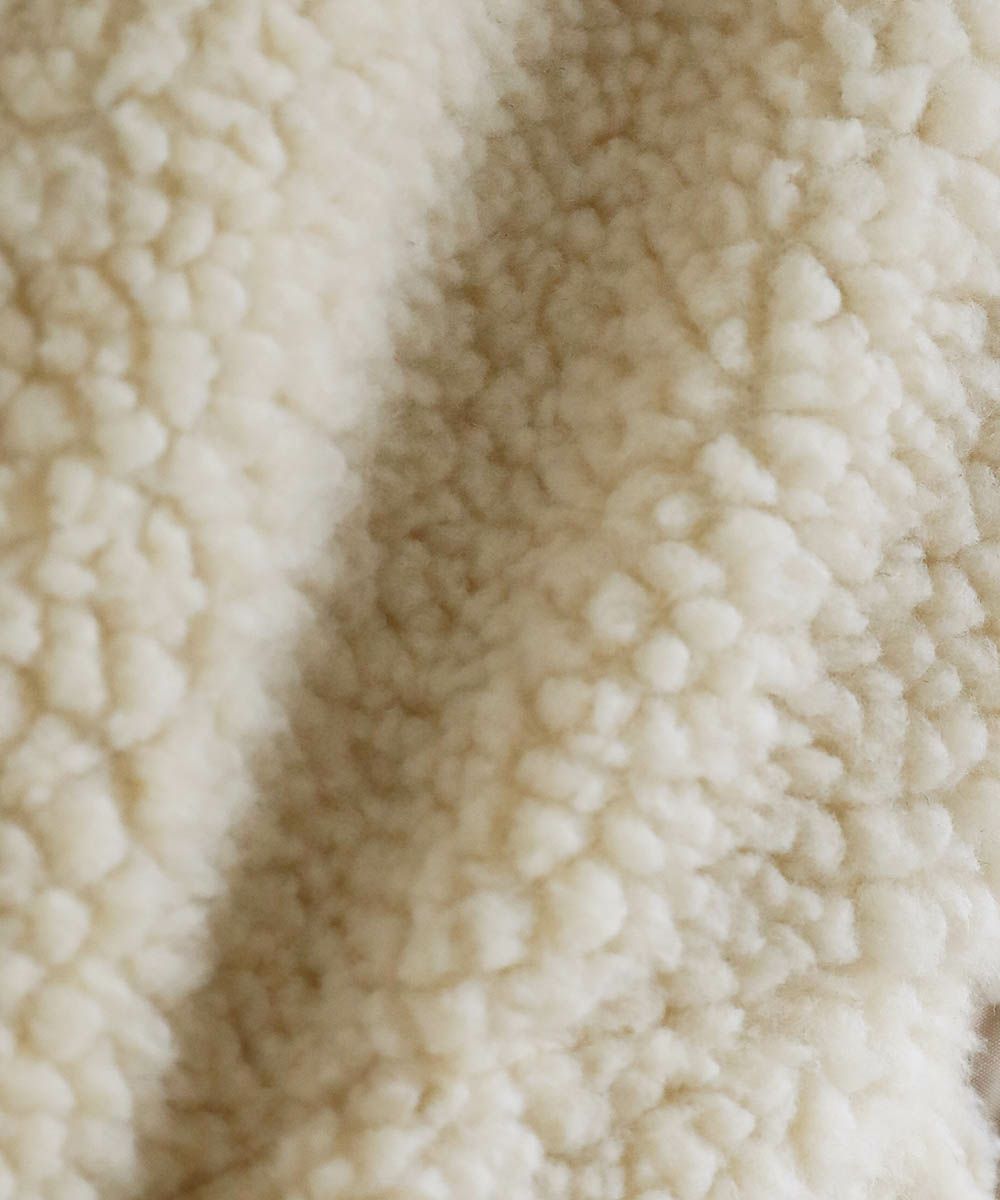 もこもこと柔らかく暖かなボアを使用。異素材部分はマイクロタフタのサラリとした質感で、ボアとのバランスがアクセントになります。中綿入りで保温性も高く、軽くて着回ししやすいアウターです。