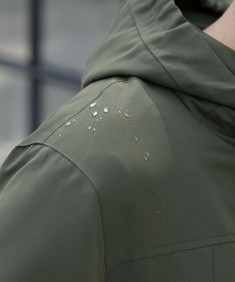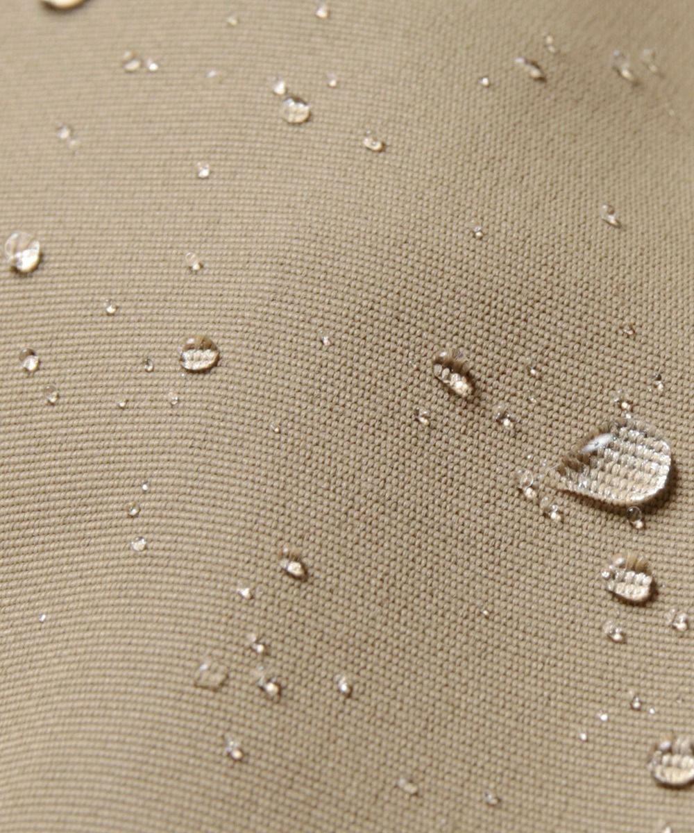 品のあるマットな質感のオリジナルポリエステル生地を用いています。生地表面に撥水加工を施しているため汚れがつきにくく、雨粒のような水滴は弾かれて滑り落ちていくのでちょっとした雨の中でも気にせずにご着用いただけます。