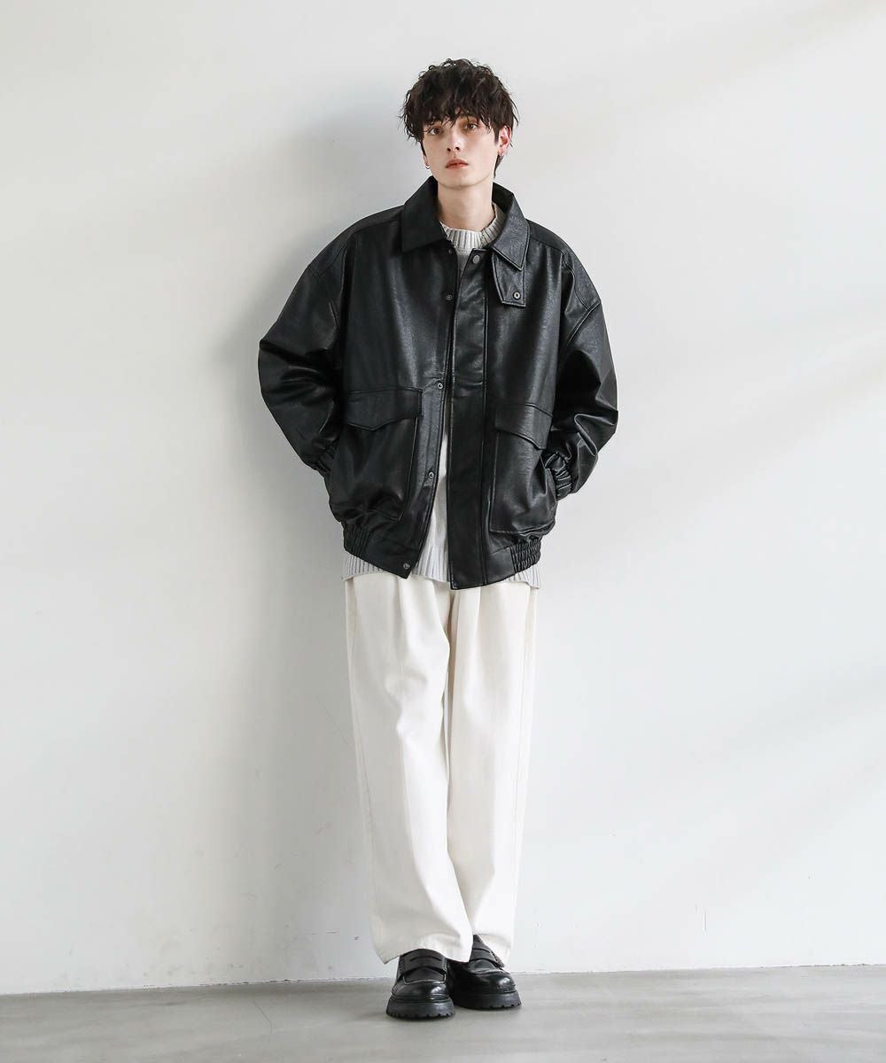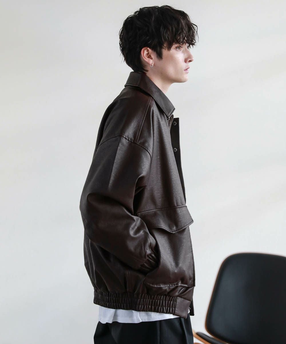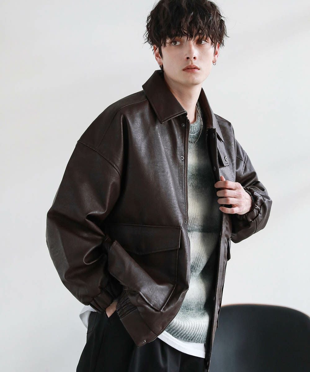 米陸軍航空隊のシンボルであるフライトジャケット、A-2をトレンドに落とし込んだ1着。リアルレザーの質感にこだわり、エコレザーながら本革のようなシボ感とマットな質感が魅力です。オーバーサイズシルエットとドロップショルダーで現代風にアレンジし、スタイリングしやすい一着に仕上げました。フロントの大きめなフラップポケットやチンストラップなどミリタリーのディティールがアクセントに。フロントはジップとスナップボタンの比翼仕立てになっており、ジップを閉めると隙間風の侵入を防いで防寒性を高めてくれます。秋から春先まで活躍するおすすめのアウターです。