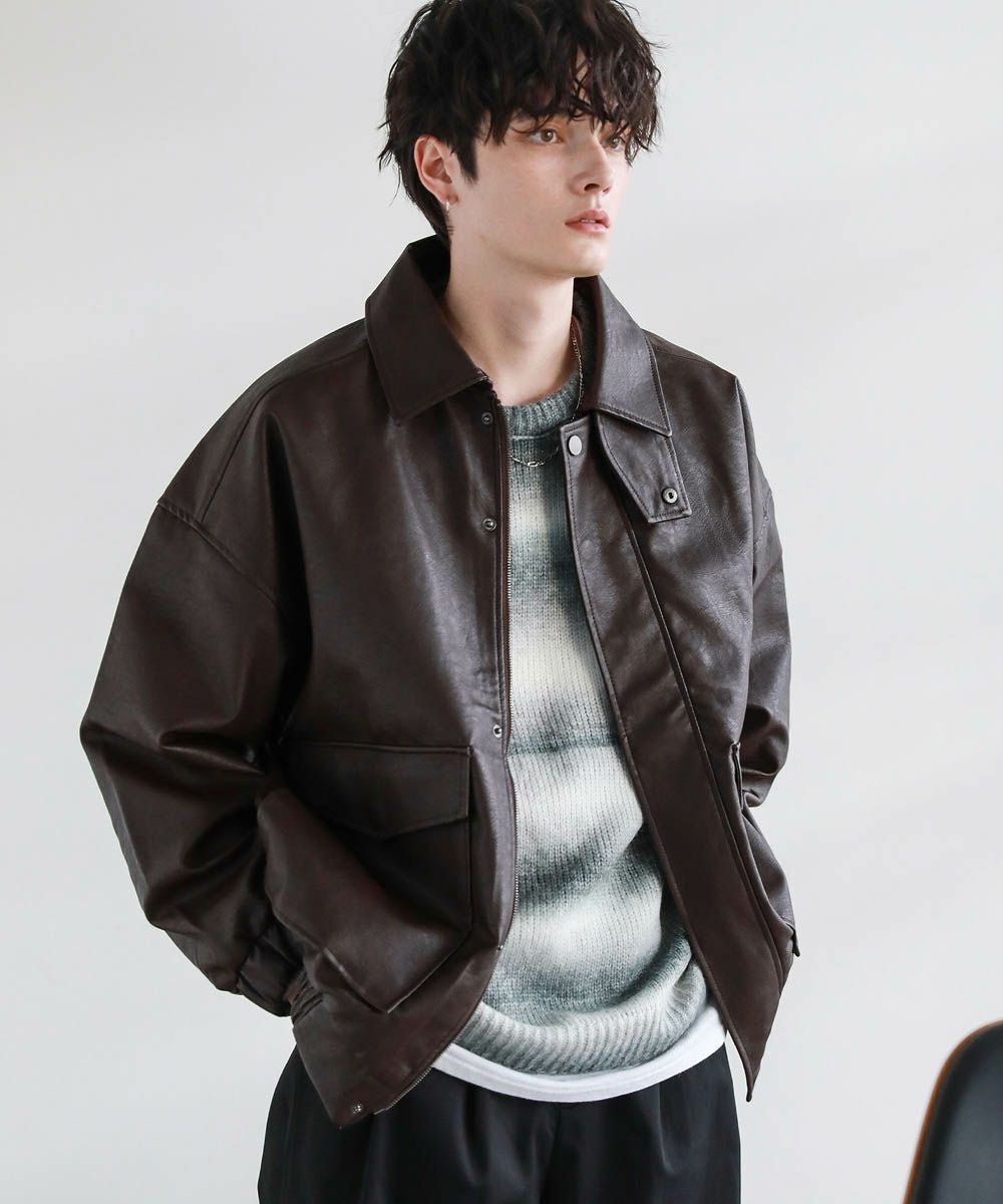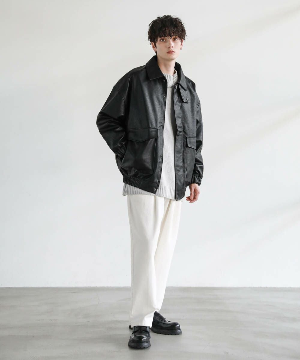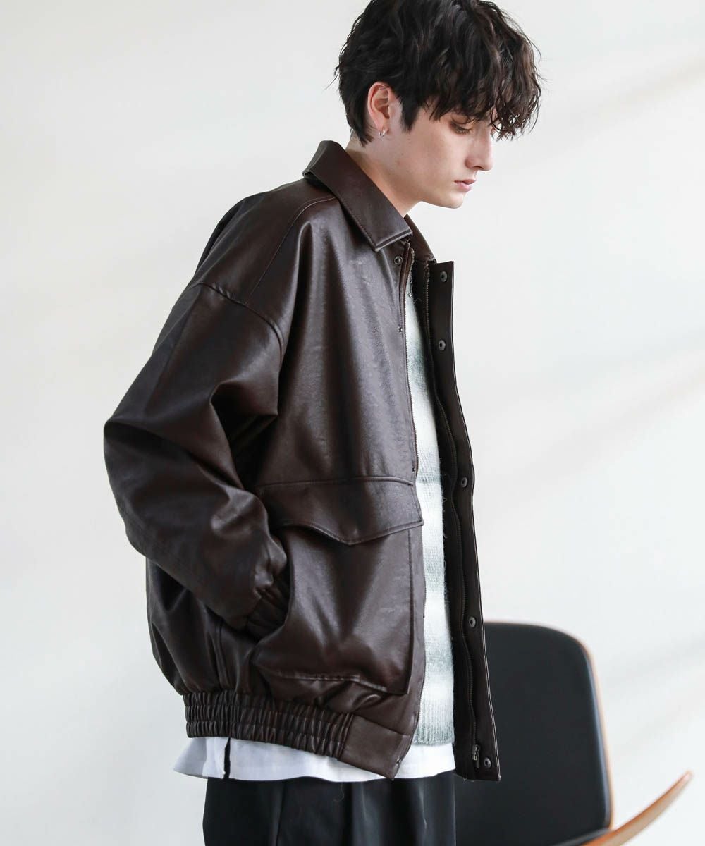 米陸軍航空隊のシンボルであるフライトジャケット、A-2をトレンドに落とし込んだ1着。リアルレザーの質感にこだわり、エコレザーながら本革のようなシボ感とマットな質感が魅力です。オーバーサイズシルエットとドロップショルダーで現代風にアレンジし、スタイリングしやすい一着に仕上げました。フロントの大きめなフラップポケットやチンストラップなどミリタリーのディティールがアクセントに。フロントはジップとスナップボタンの比翼仕立てになっており、ジップを閉めると隙間風の侵入を防いで防寒性を高めてくれます。秋から春先まで活躍するおすすめのアウターです。