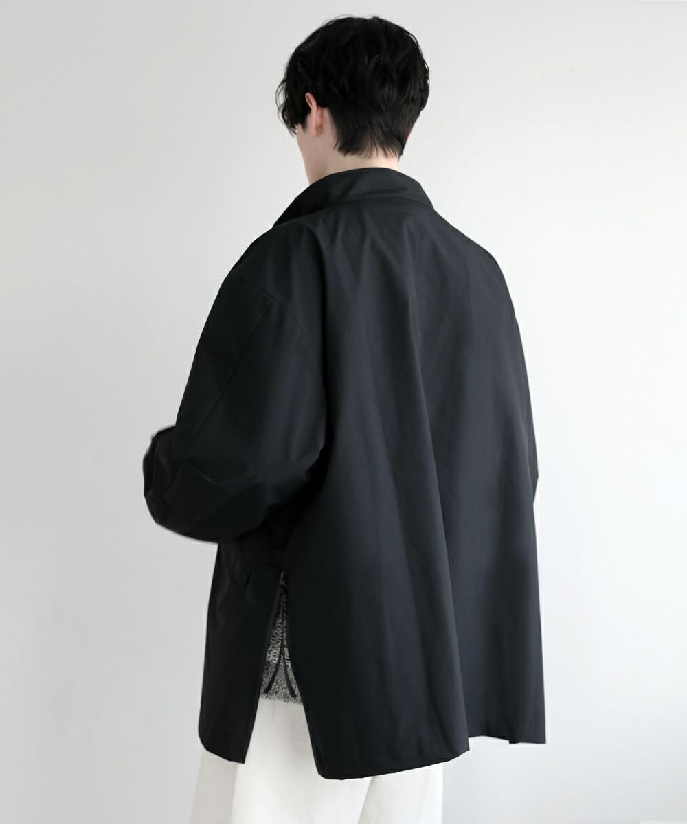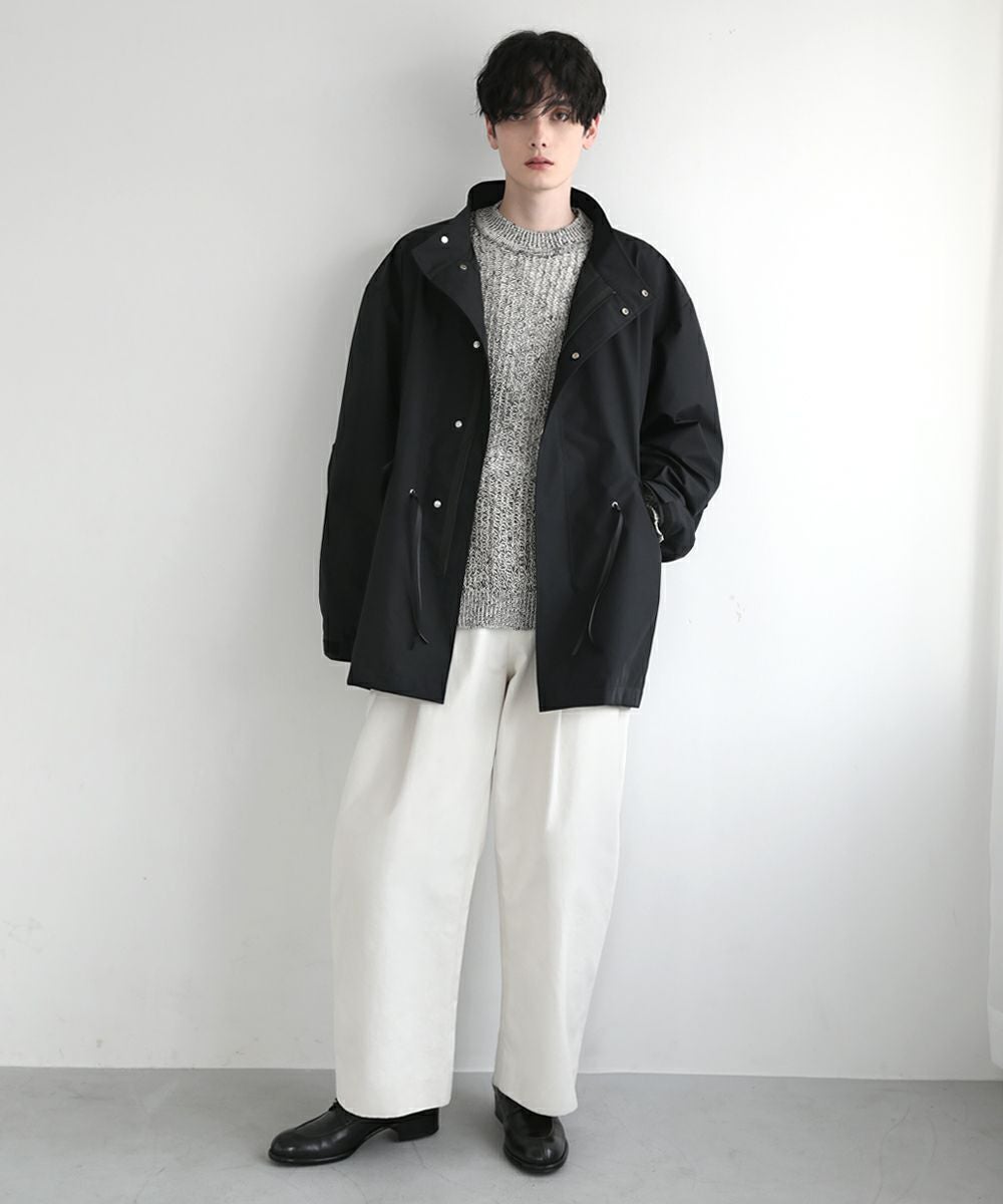 フロントを開けた際の収まりを意識した絶妙な仕様となっており、フロントを閉めた際にはハイネックのモードな雰囲気をお楽しみいただけます。