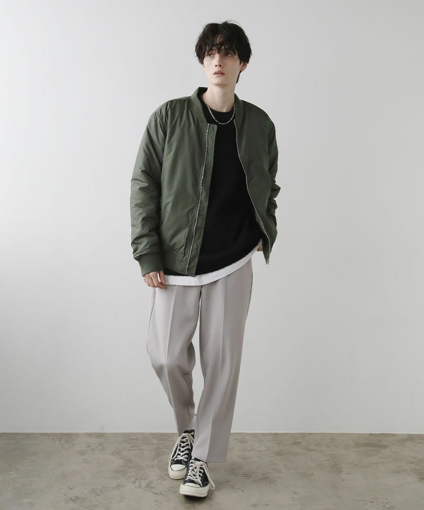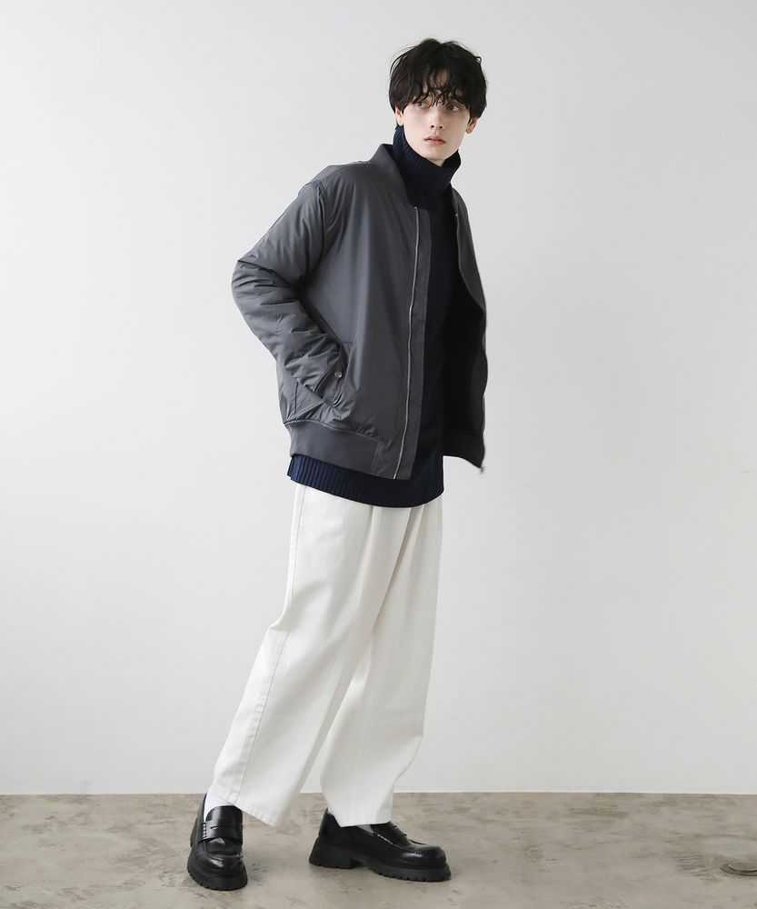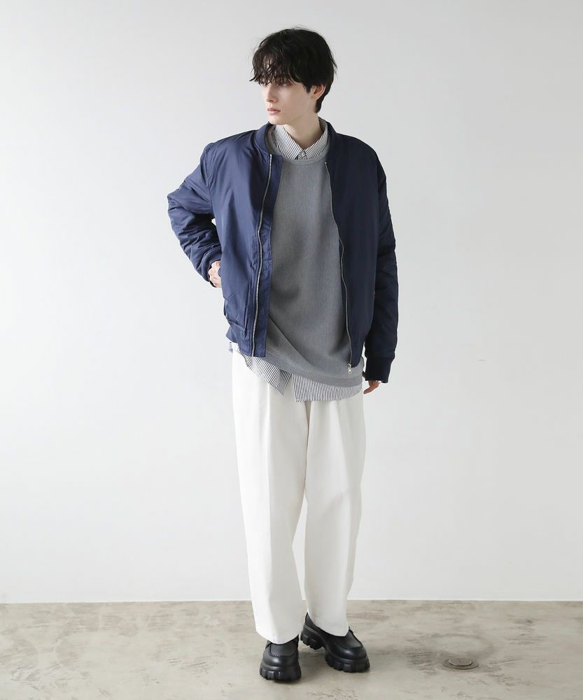 定番アウターであるMA-1ジャケット。丈夫さと軽い着心地、シワになりにくくデイリーに使いやすい素材感、程よい光沢感で上品な印象。ミリタリー要素は残しつつも無骨になり過ぎないように、中綿入りでも着ぶくれしないスリムなシルエットに仕上げています。保温性とスマートさを兼ね備えた着回しに活躍するアイテムです。