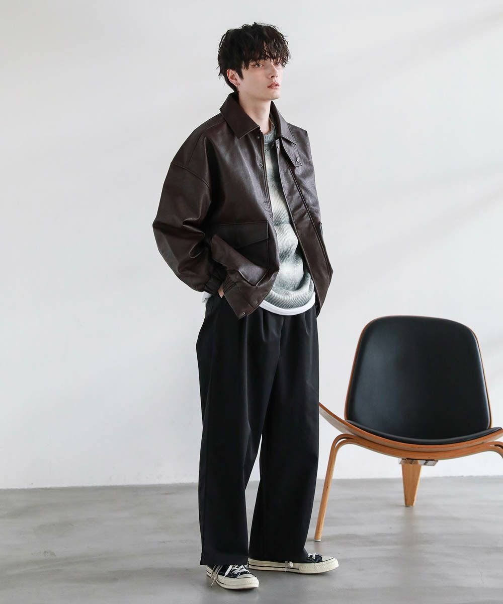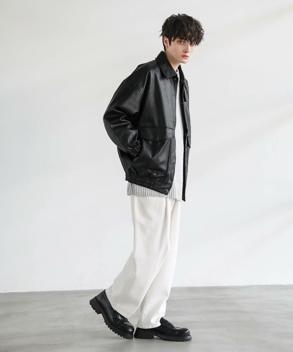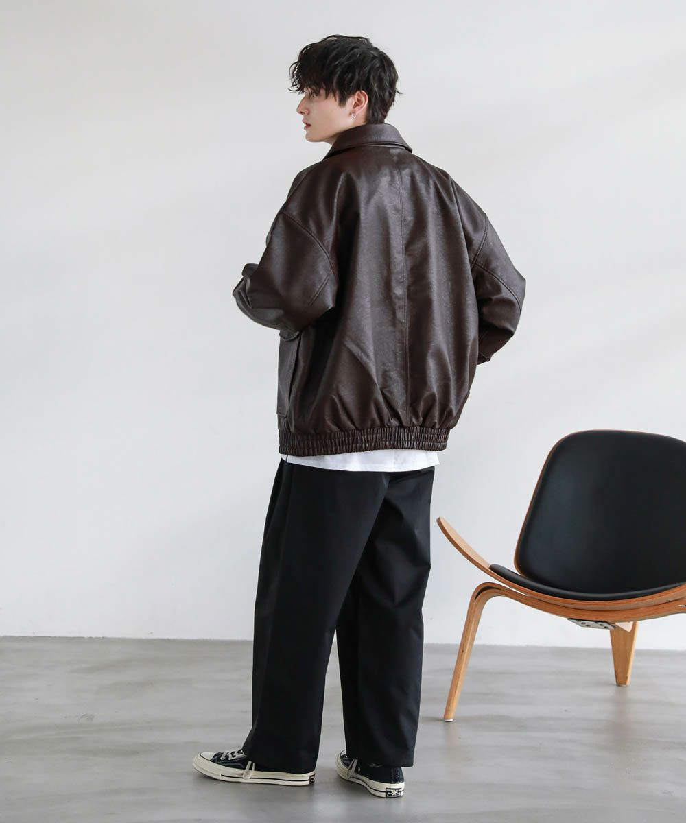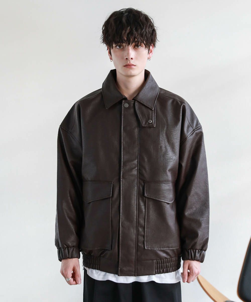 米陸軍航空隊のシンボルであるフライトジャケット、A-2をトレンドに落とし込んだ1着。リアルレザーの質感にこだわり、エコレザーながら本革のようなシボ感とマットな質感が魅力です。オーバーサイズシルエットとドロップショルダーで現代風にアレンジし、スタイリングしやすい一着に仕上げました。フロントの大きめなフラップポケットやチンストラップなどミリタリーのディティールがアクセントに。フロントはジップとスナップボタンの比翼仕立てになっており、ジップを閉めると隙間風の侵入を防いで防寒性を高めてくれます。秋から春先まで活躍するおすすめのアウターです。