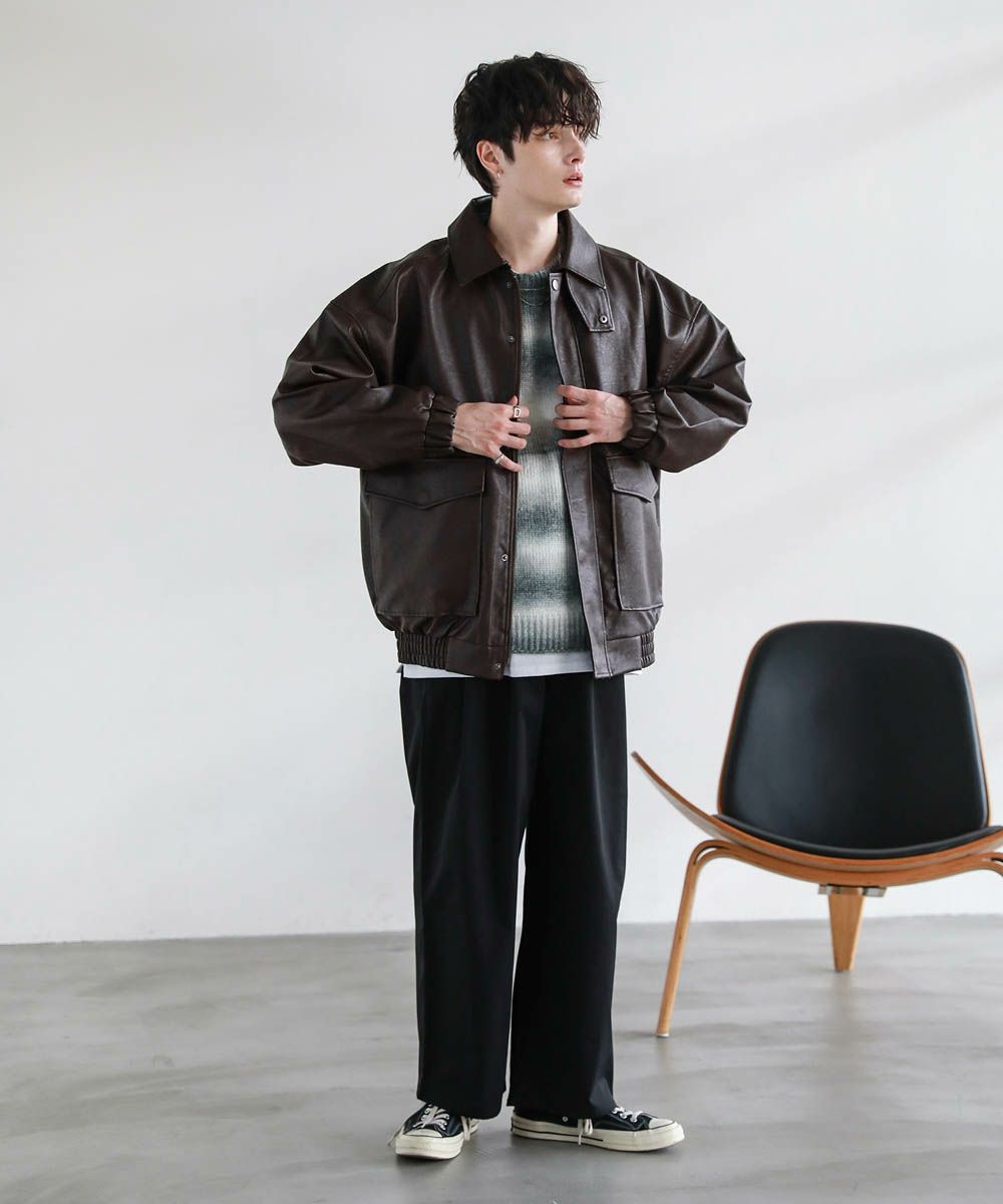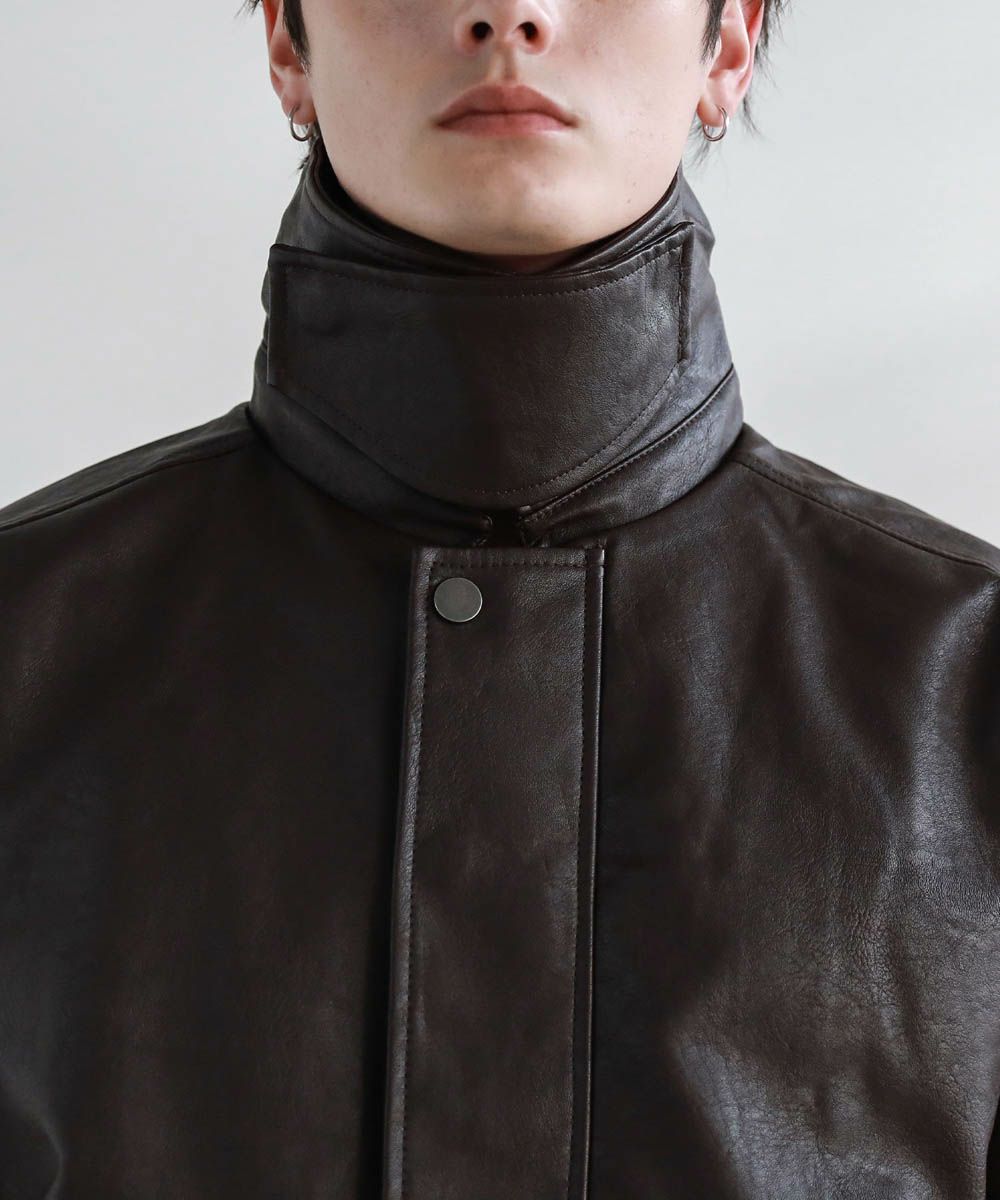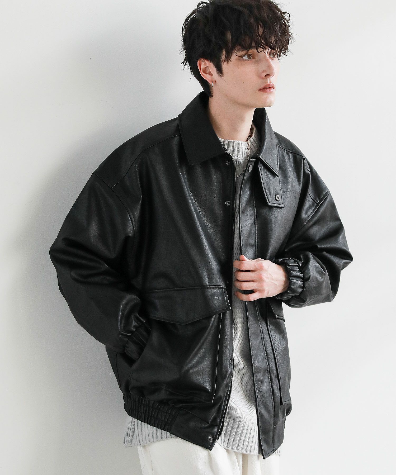 米陸軍航空隊のシンボルであるフライトジャケット、A-2をトレンドに落とし込んだ1着。リアルレザーの質感にこだわり、エコレザーながら本革のようなシボ感とマットな質感が魅力です。オーバーサイズシルエットとドロップショルダーで現代風にアレンジし、スタイリングしやすい一着に仕上げました。フロントの大きめなフラップポケットやチンストラップなどミリタリーのディティールがアクセントに。フロントはジップとスナップボタンの比翼仕立てになっており、ジップを閉めると隙間風の侵入を防いで防寒性を高めてくれます。秋から春先まで活躍するおすすめのアウターです。