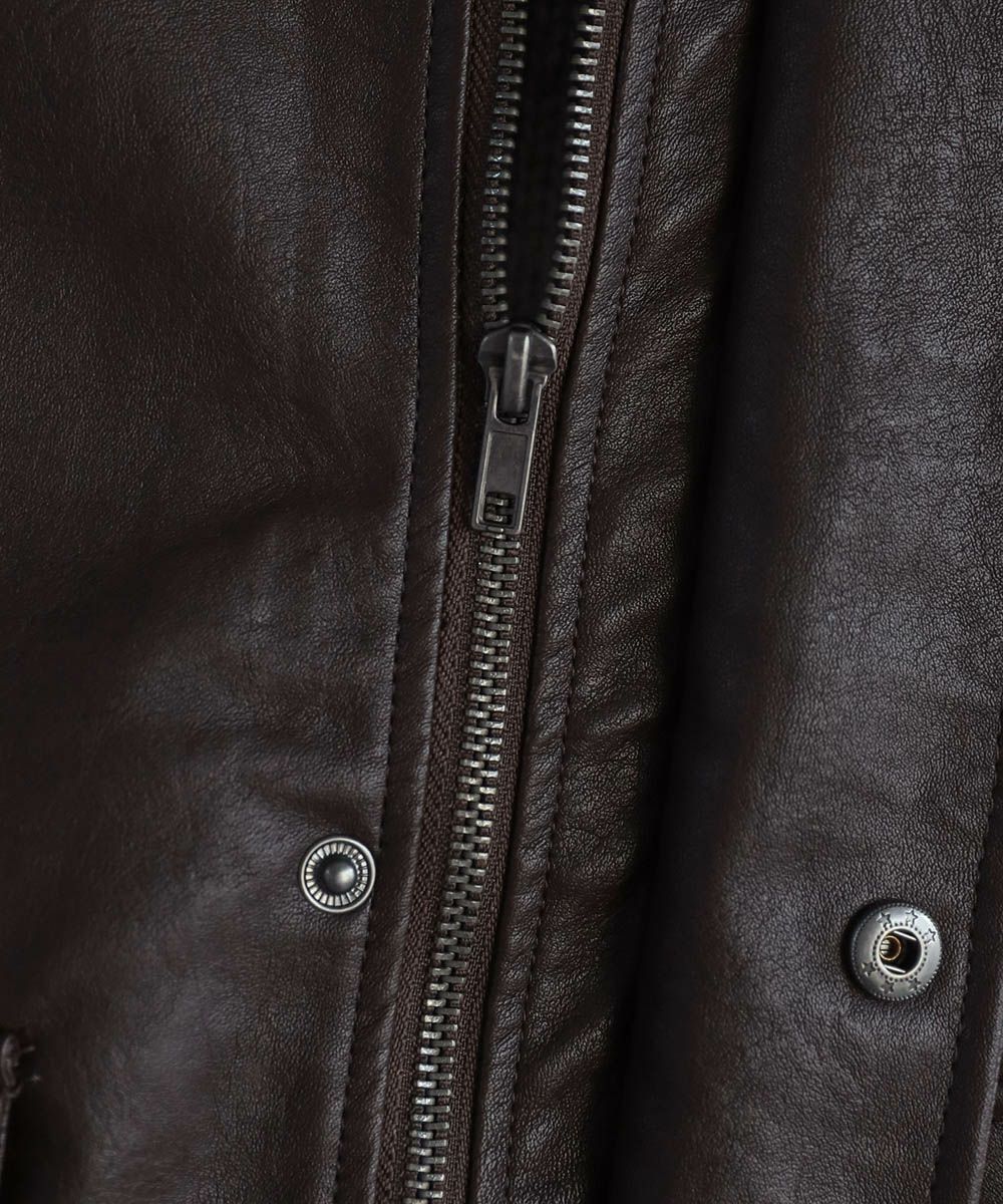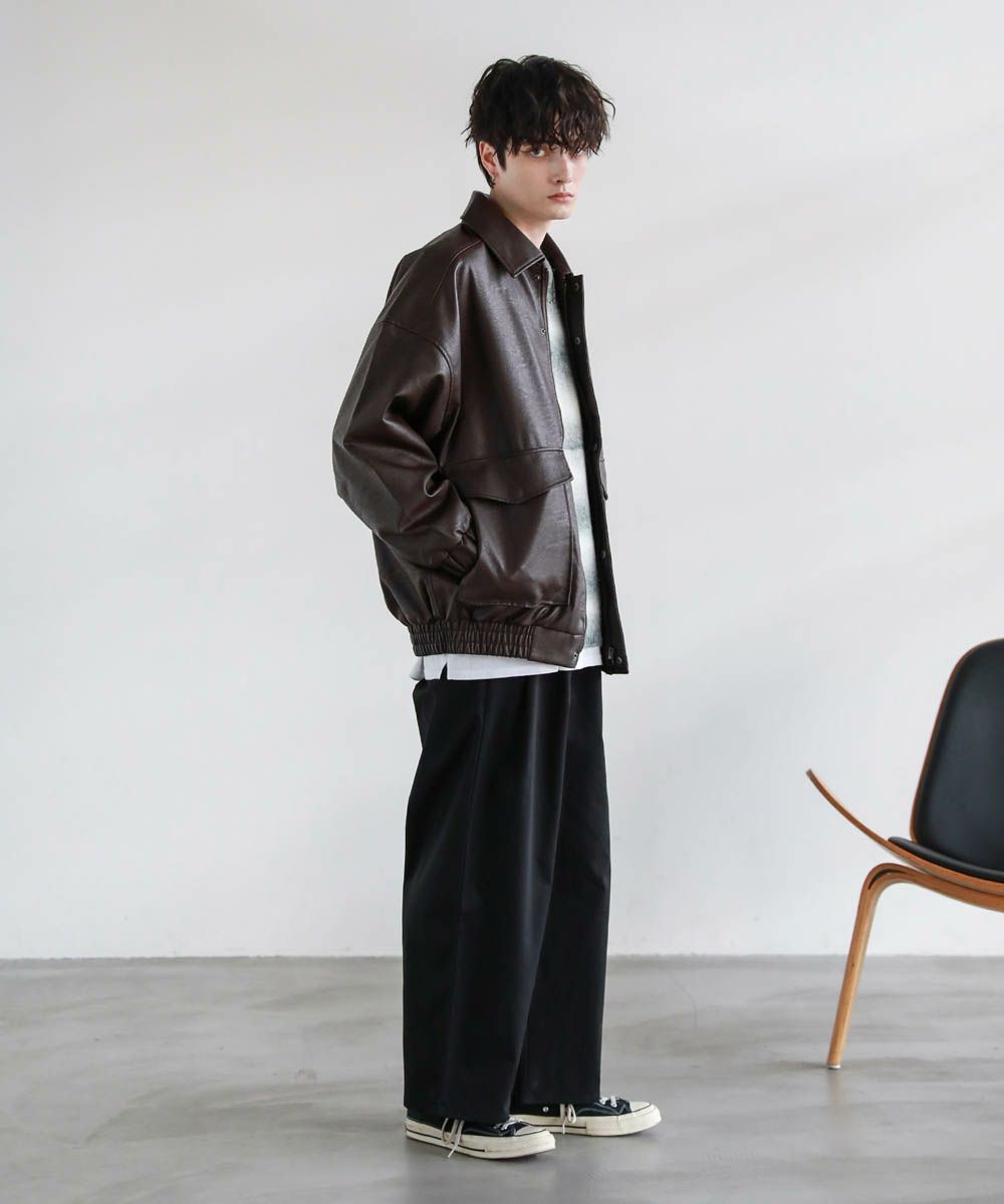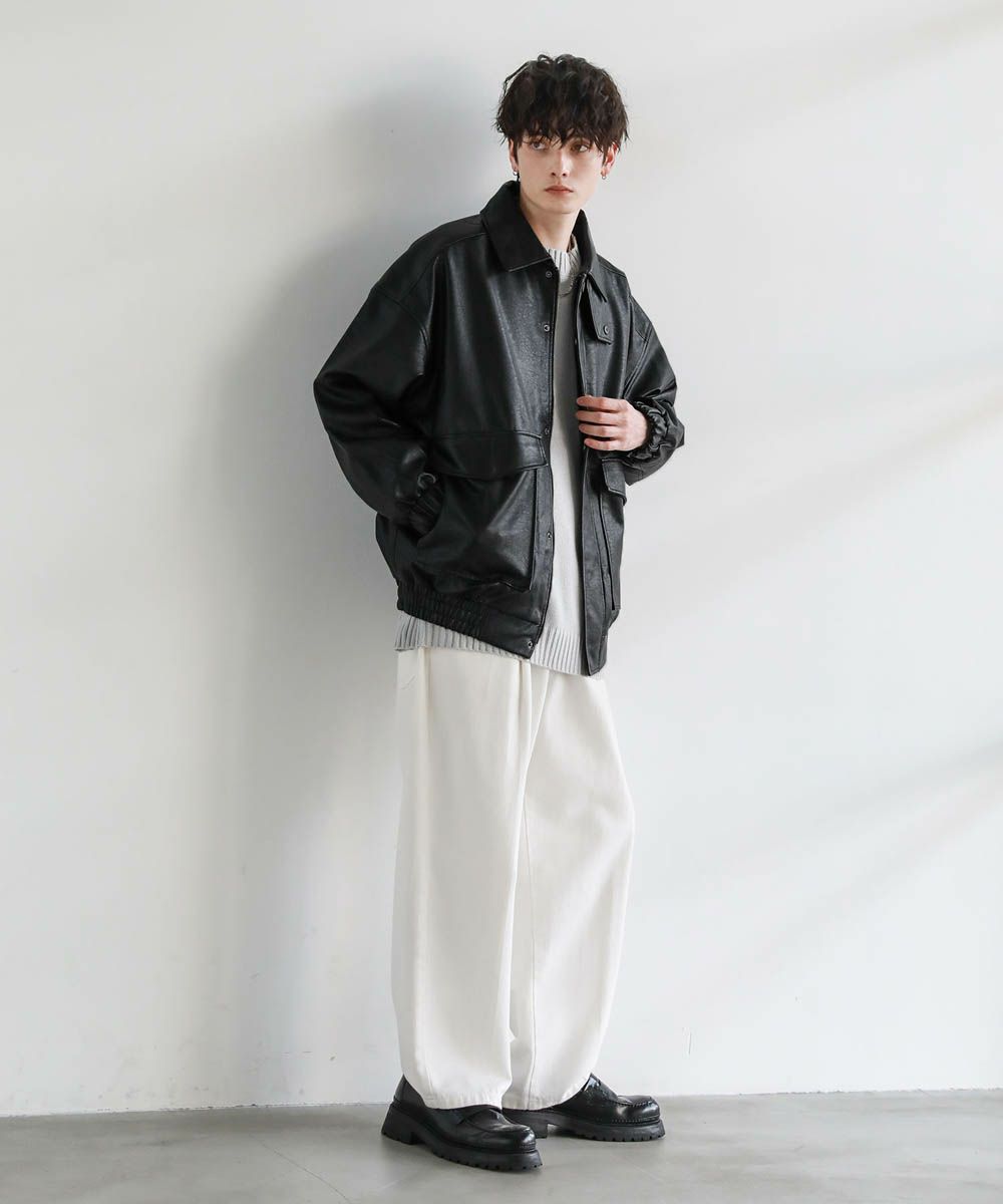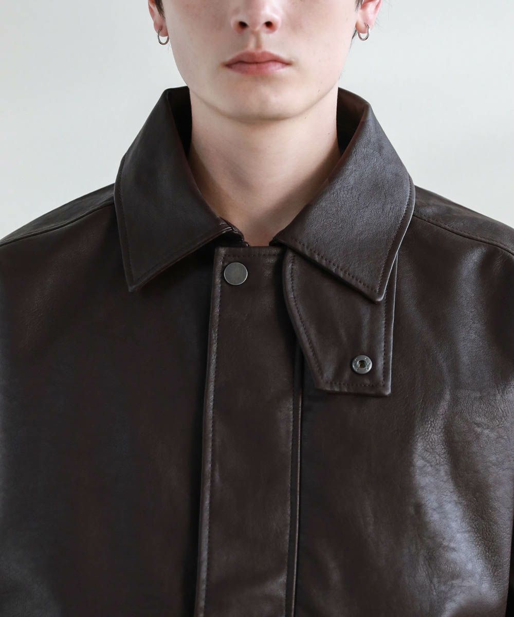 米陸軍航空隊のシンボルであるフライトジャケット、A-2をトレンドに落とし込んだ1着。リアルレザーの質感にこだわり、エコレザーながら本革のようなシボ感とマットな質感が魅力です。オーバーサイズシルエットとドロップショルダーで現代風にアレンジし、スタイリングしやすい一着に仕上げました。フロントの大きめなフラップポケットやチンストラップなどミリタリーのディティールがアクセントに。フロントはジップとスナップボタンの比翼仕立てになっており、ジップを閉めると隙間風の侵入を防いで防寒性を高めてくれます。秋から春先まで活躍するおすすめのアウターです。
