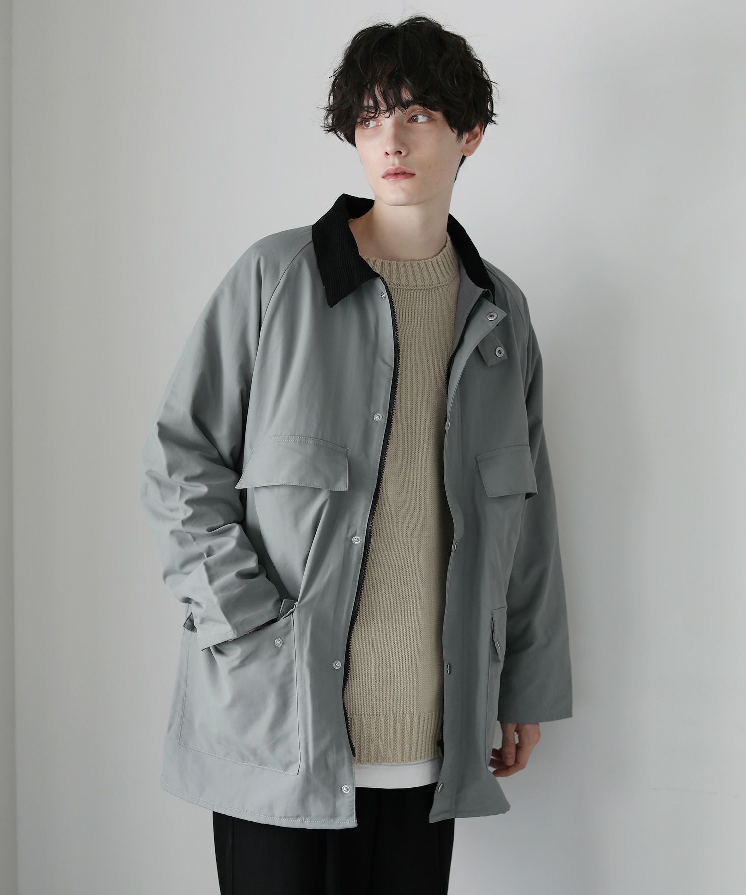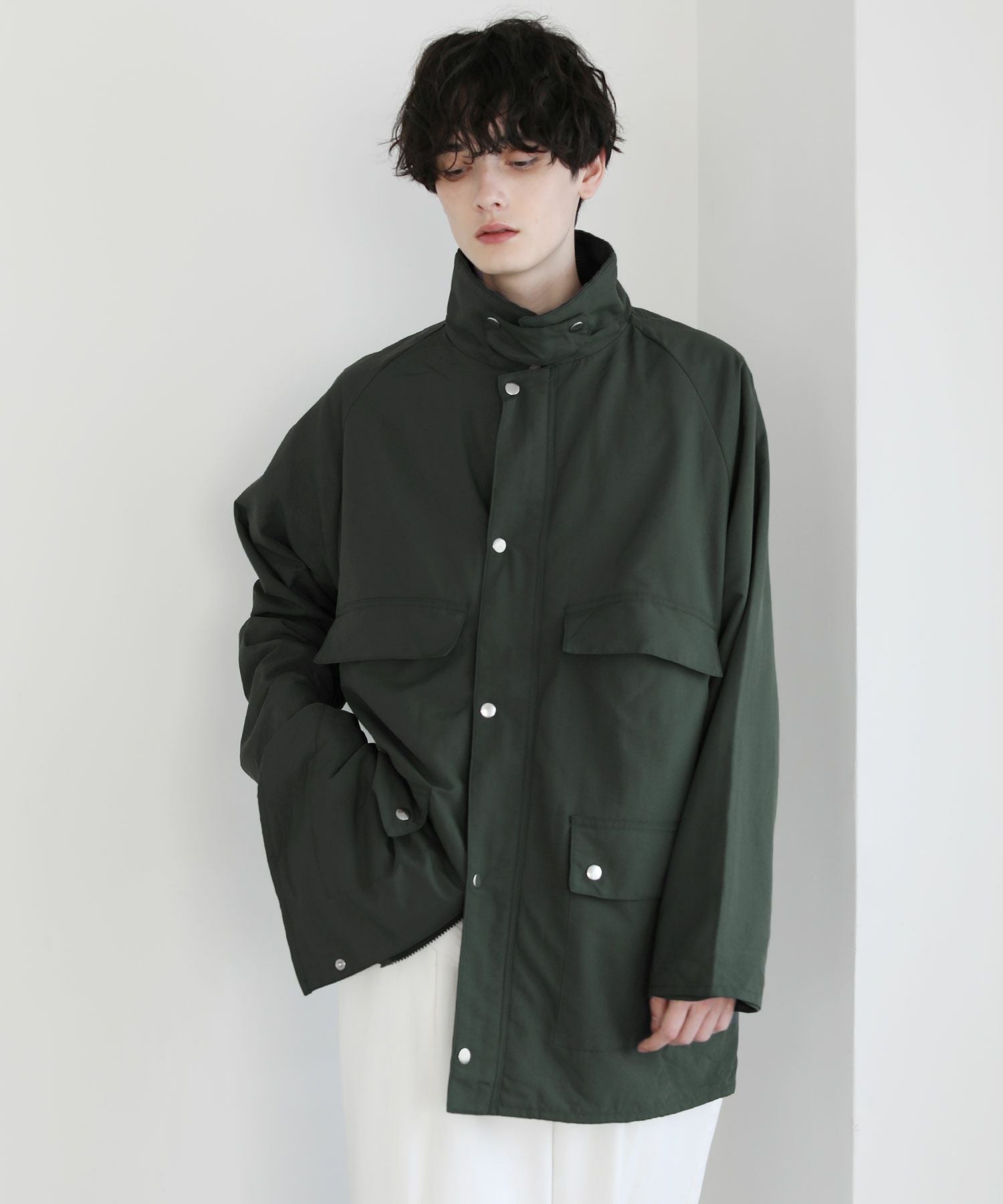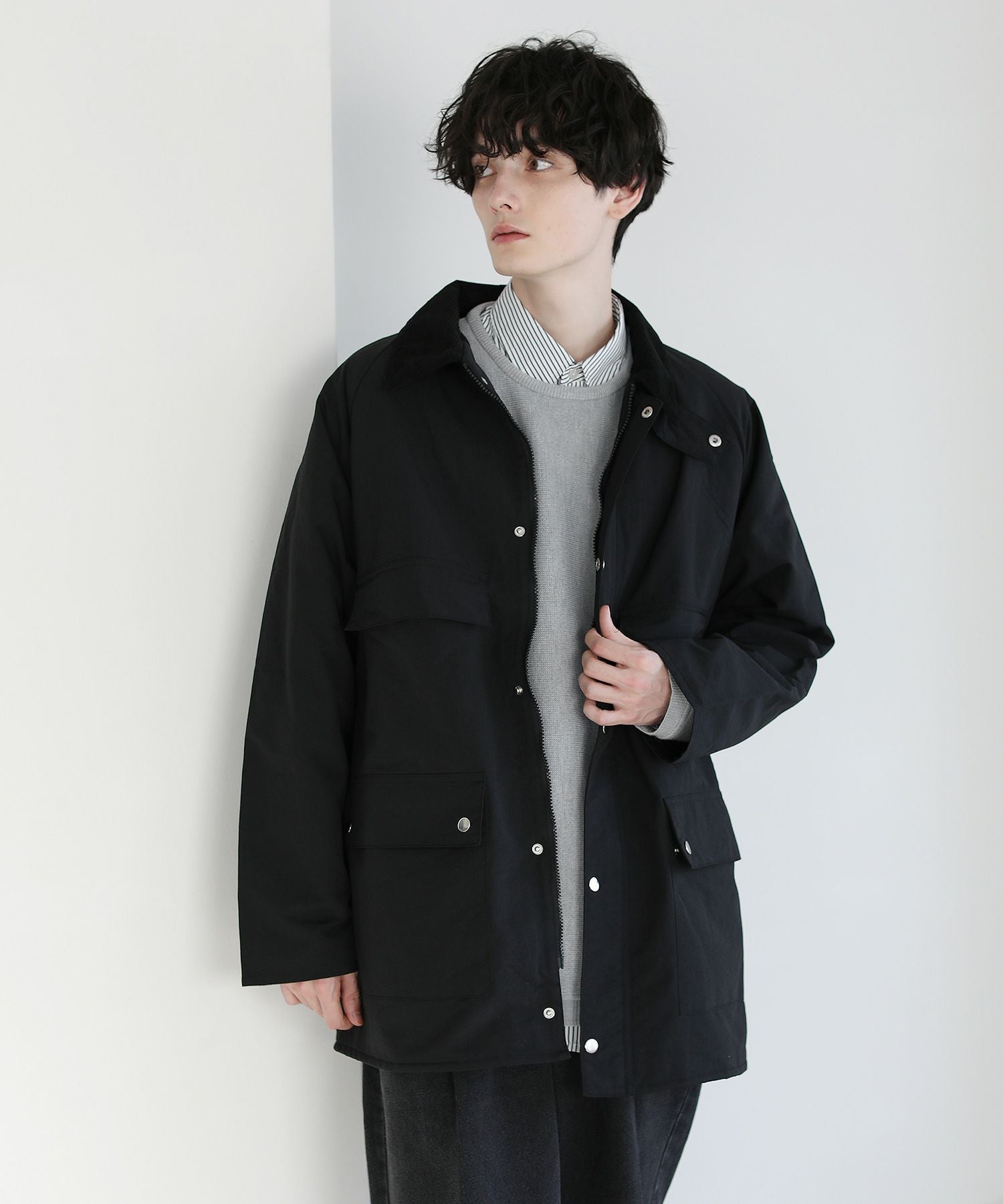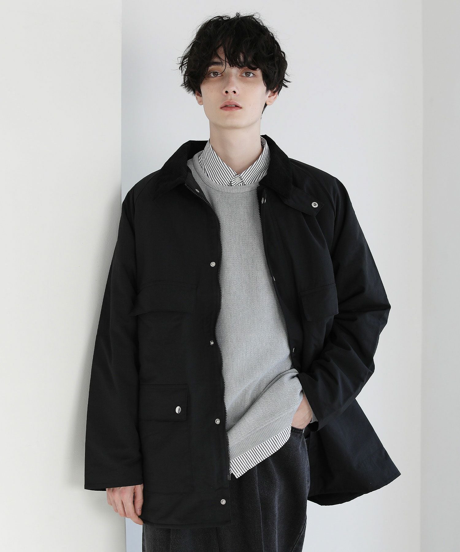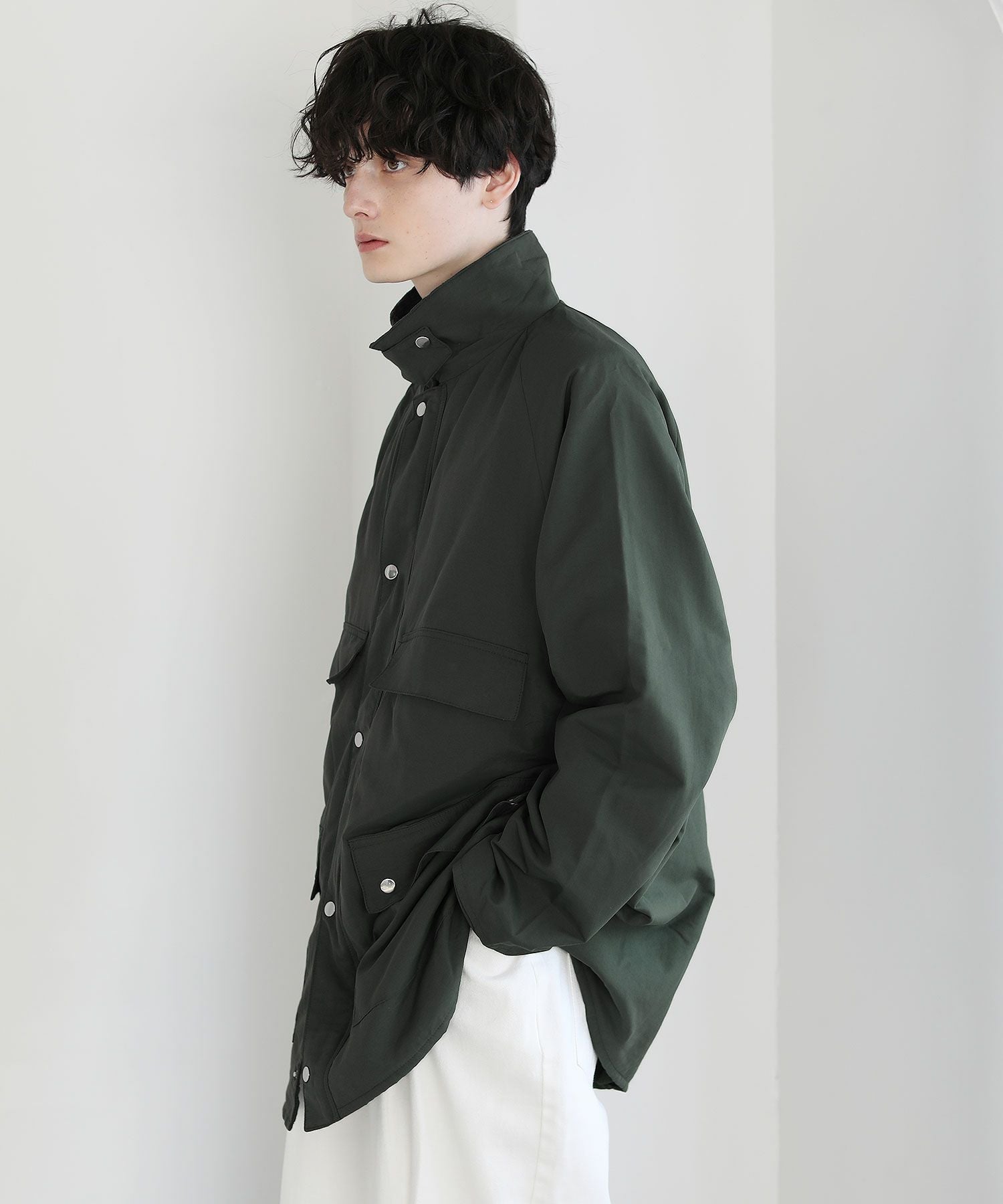 襟を立ててベルトを止めるとハイネックのデザインになり、雰囲気の違った着こなしを楽しめます。襟はコーデュロイの切り替えデザインになっており、カジュアルな印象とアクセントをプラス。フロントにはハンティングジャケット特有の大きなフラップポケットを4つ配置。小物の収納に便利な実用性にも優れたアウターです。またゆとりのある身幅とラグランスリーブで、インナーに厚手のニットやスウェットも着込めるのがポイント。