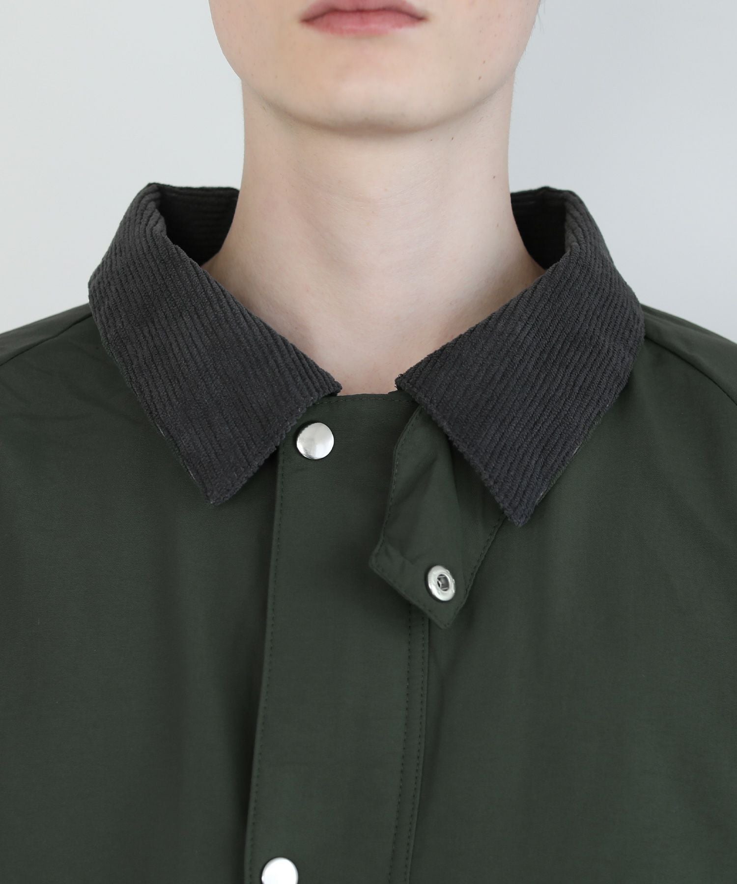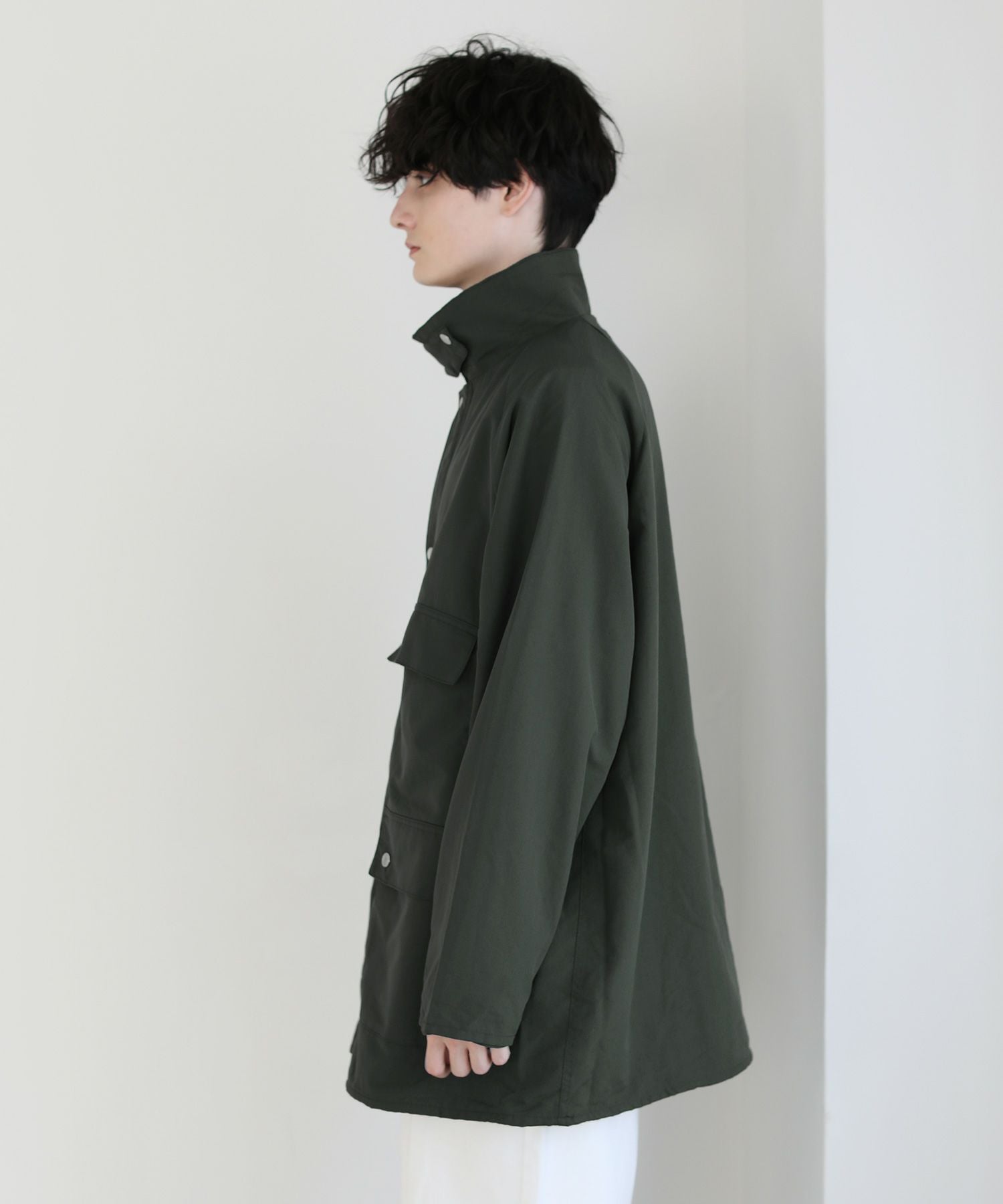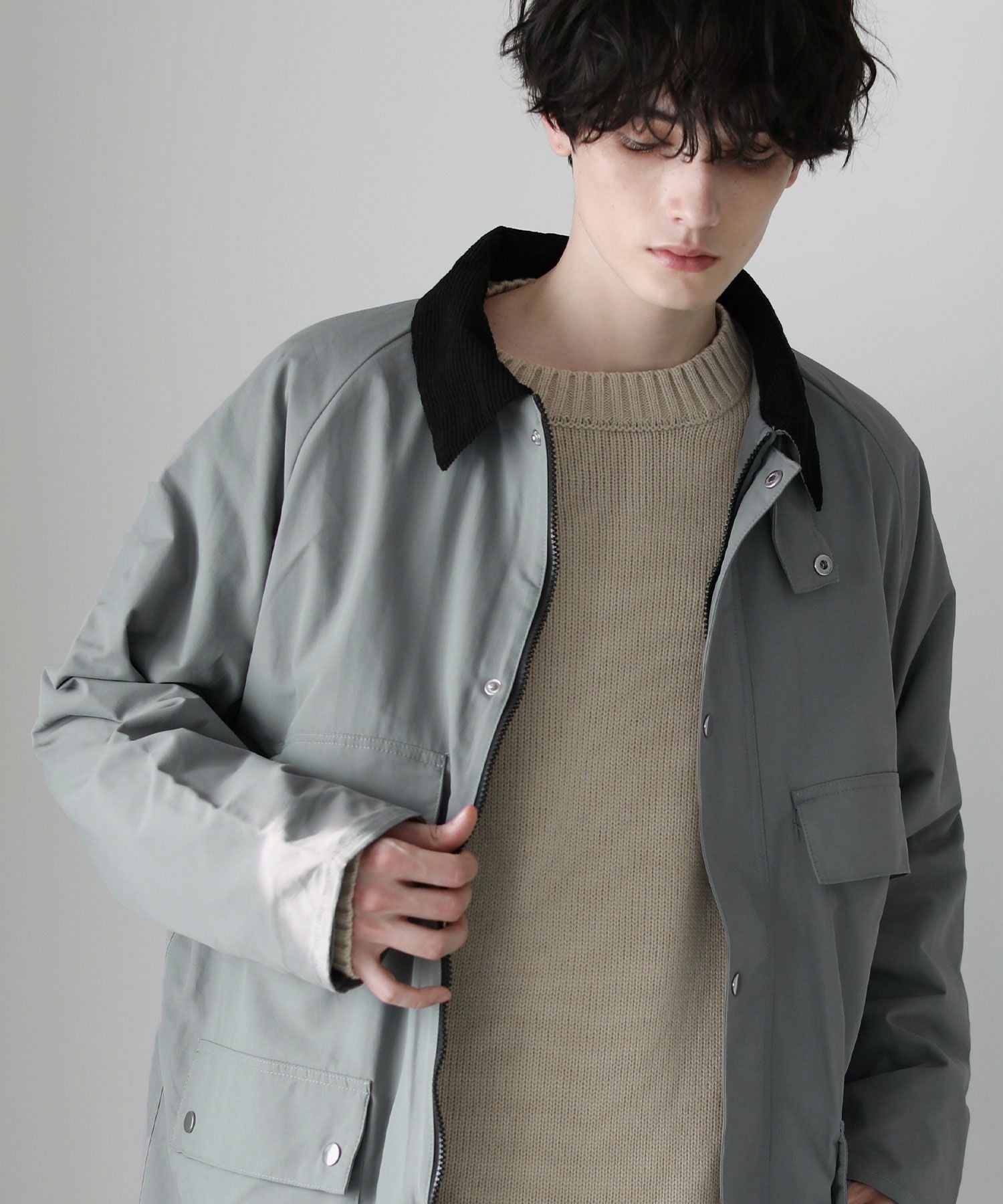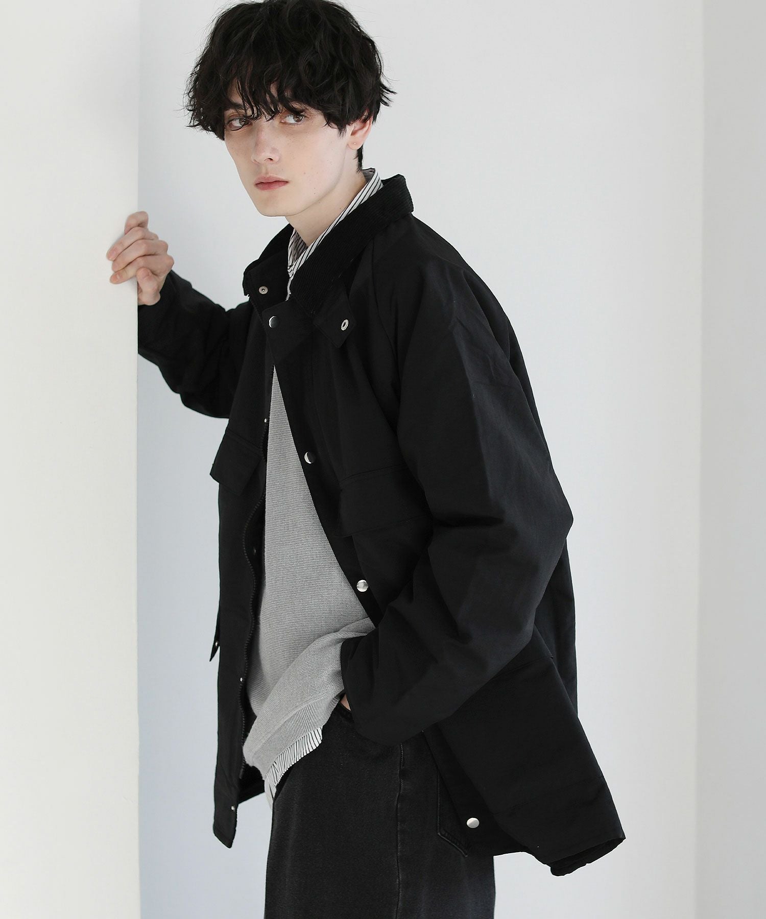 襟を立ててベルトを止めるとハイネックのデザインになり、雰囲気の違った着こなしを楽しめます。襟はコーデュロイの切り替えデザインになっており、カジュアルな印象とアクセントをプラス。フロントにはハンティングジャケット特有の大きなフラップポケットを4つ配置。小物の収納に便利な実用性にも優れたアウターです。またゆとりのある身幅とラグランスリーブで、インナーに厚手のニットやスウェットも着込めるのがポイント。