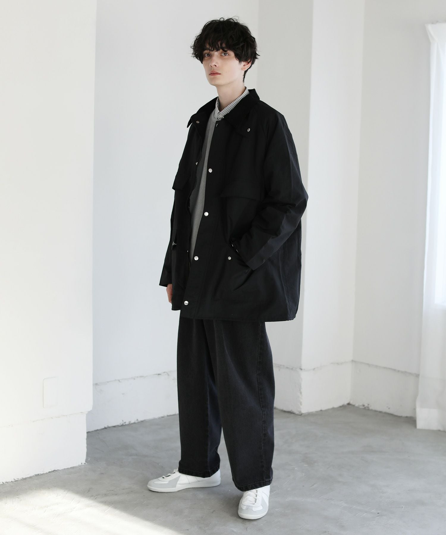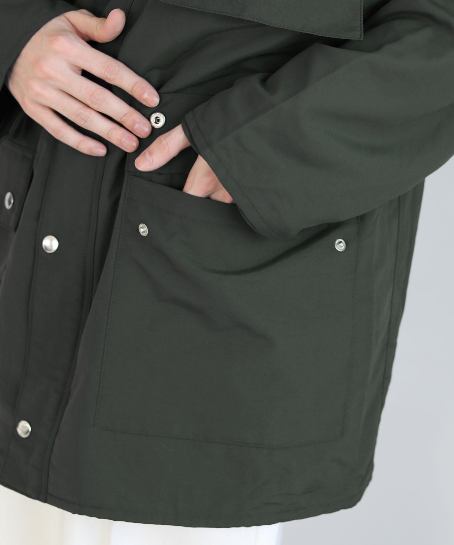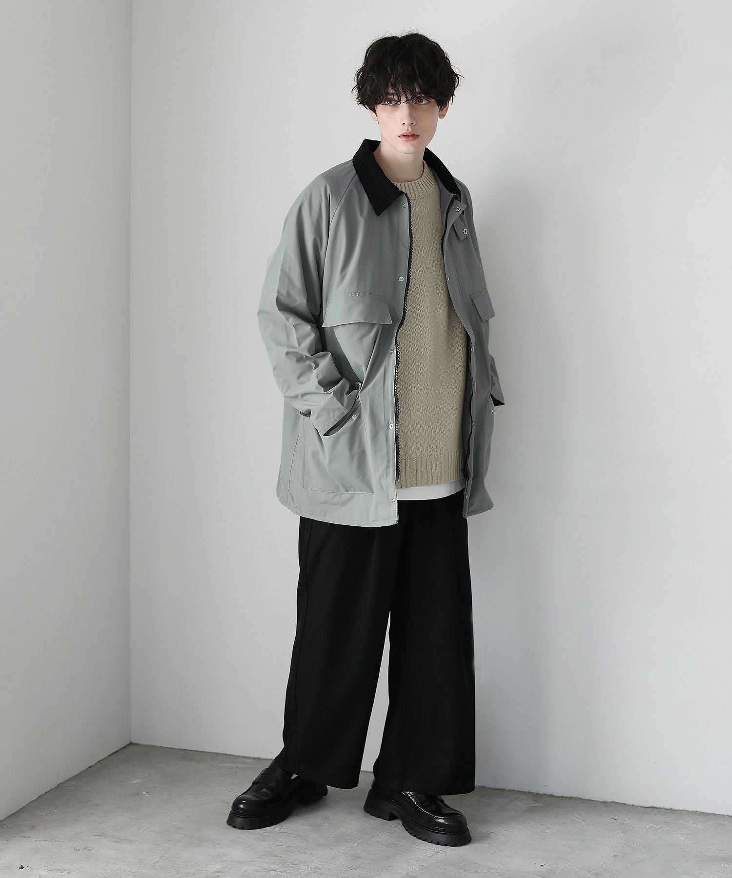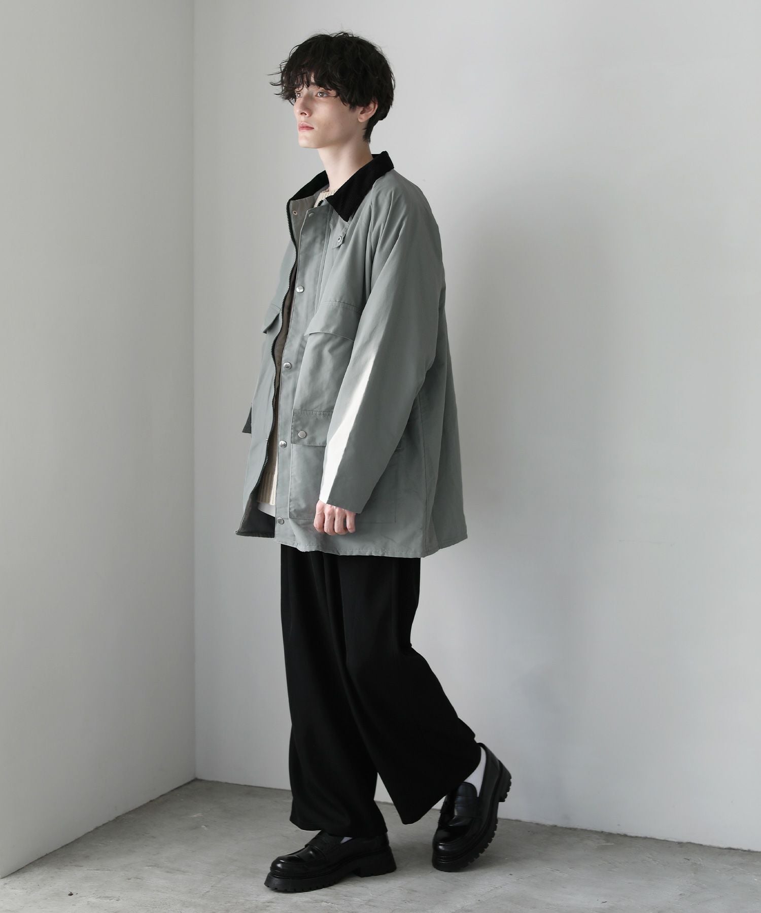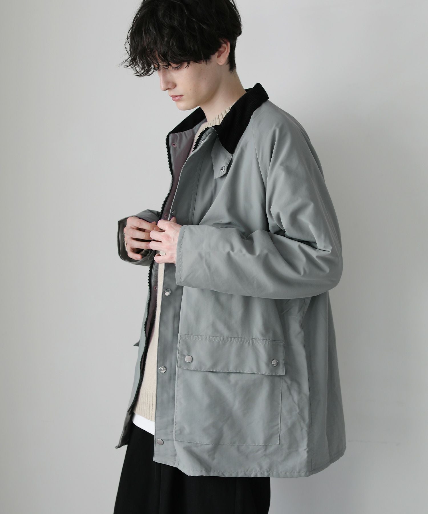 襟を立ててベルトを止めるとハイネックのデザインになり、雰囲気の違った着こなしを楽しめます。襟はコーデュロイの切り替えデザインになっており、カジュアルな印象とアクセントをプラス。フロントにはハンティングジャケット特有の大きなフラップポケットを4つ配置。小物の収納に便利な実用性にも優れたアウターです。またゆとりのある身幅とラグランスリーブで、インナーに厚手のニットやスウェットも着込めるのがポイント。